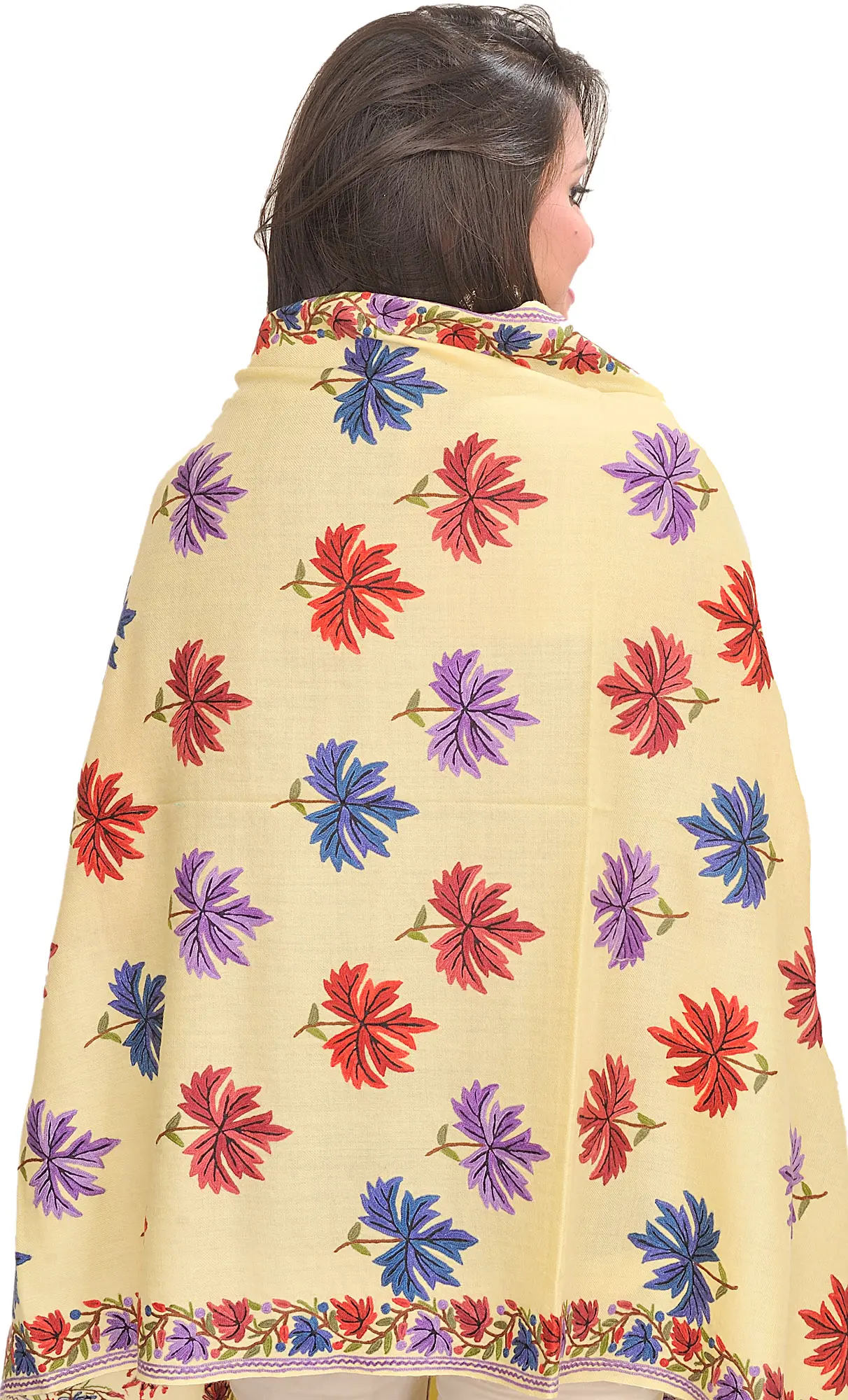 In the picturesque valleys of Kashmir, artisans pour their passion into crafting this stole. The art of hand embroidery passed down through various generations, brings life to stunning maple leaf motifs. The stitches of this hand-embroidered piece give a beautiful reflection of their mastery. The design's roots trace back to Kashmir's rich history, evolving over time. Today, it effortlessly complements modern chic styles. The stole's subdued hues enhance its timeless charm, making it a precious piece for every fashion enthusiast.