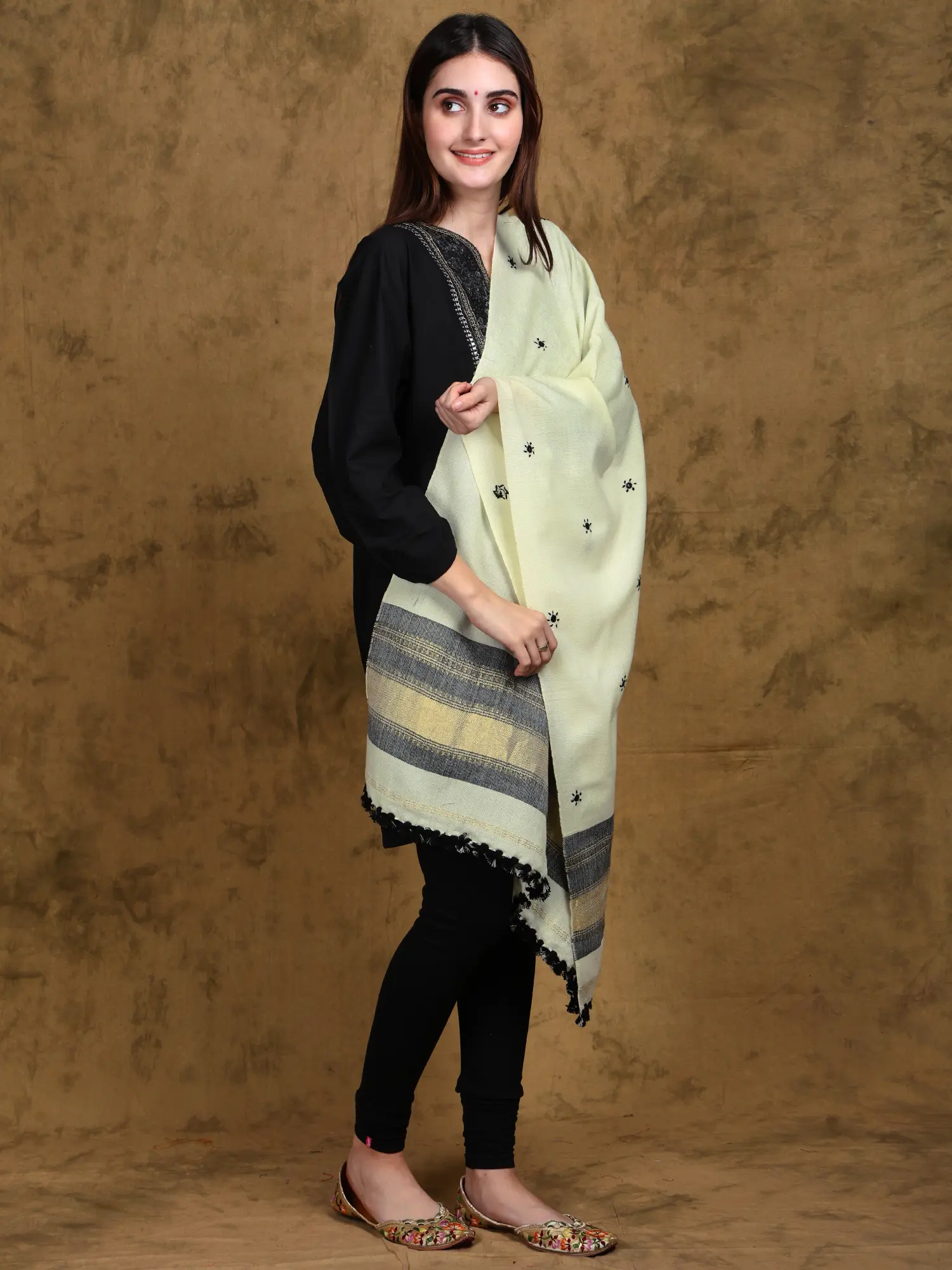 Measuring an generous length, this stole offers remarkable versatility in styling. Drape it effortlessly over your shoulders for an instant touch of refinement, or wrap it around your neck for cozy warmth. It seamlessly complements both traditional Indian attire, such as kurtis and lehengas, and Western wear like jeans, tunics, or even a simple black dress. The neutral yet rich color palette makes it an easy addition to any wardrobe, promising to be a cherished piece for seasons to come, a beautiful embodiment of Kutch's enduring artistic legacy.