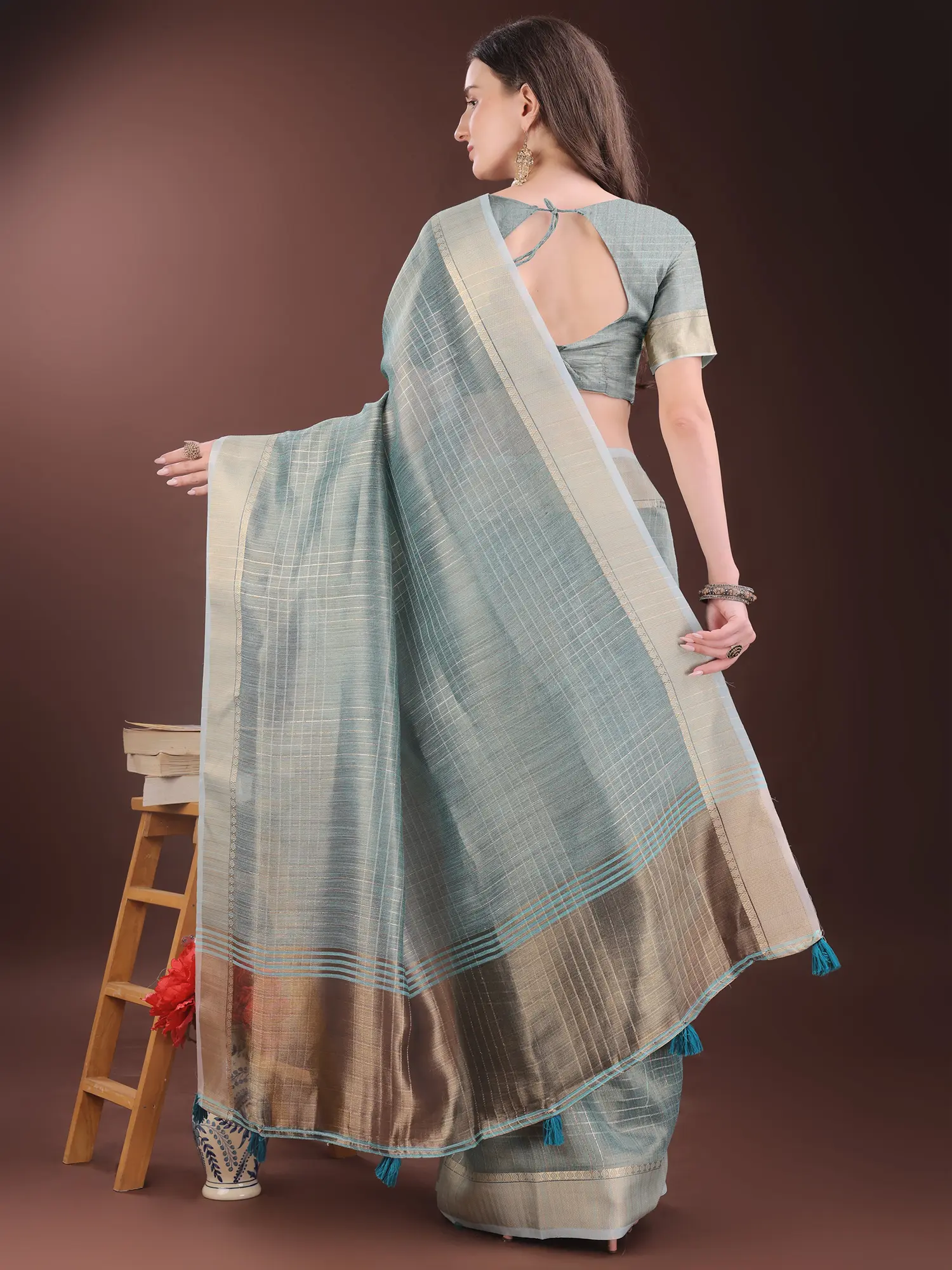 Cotton Plain Saree with Golden Border and Striped Pallu