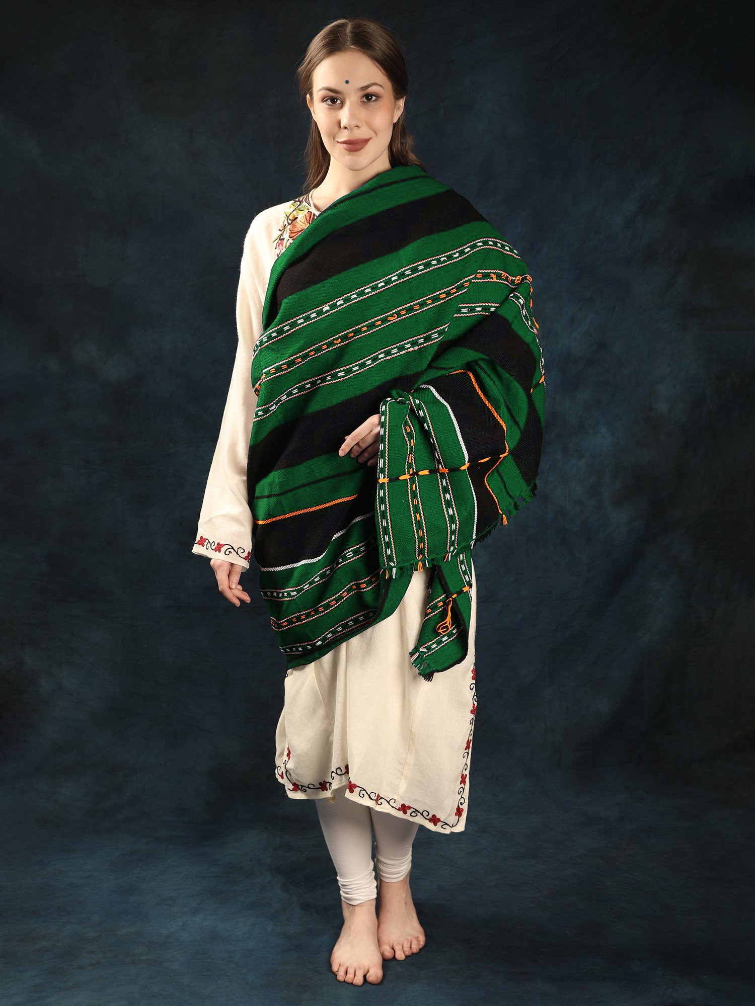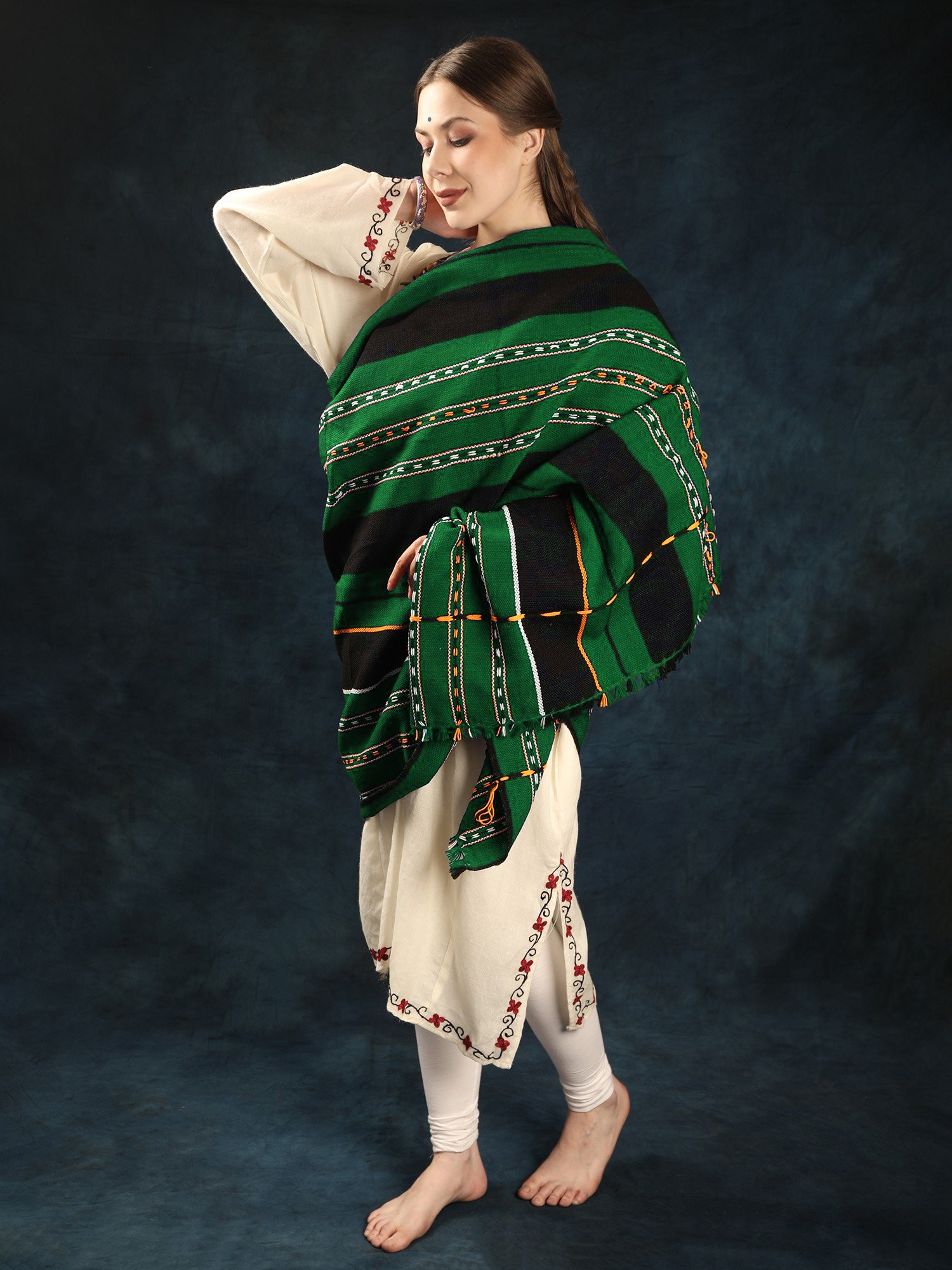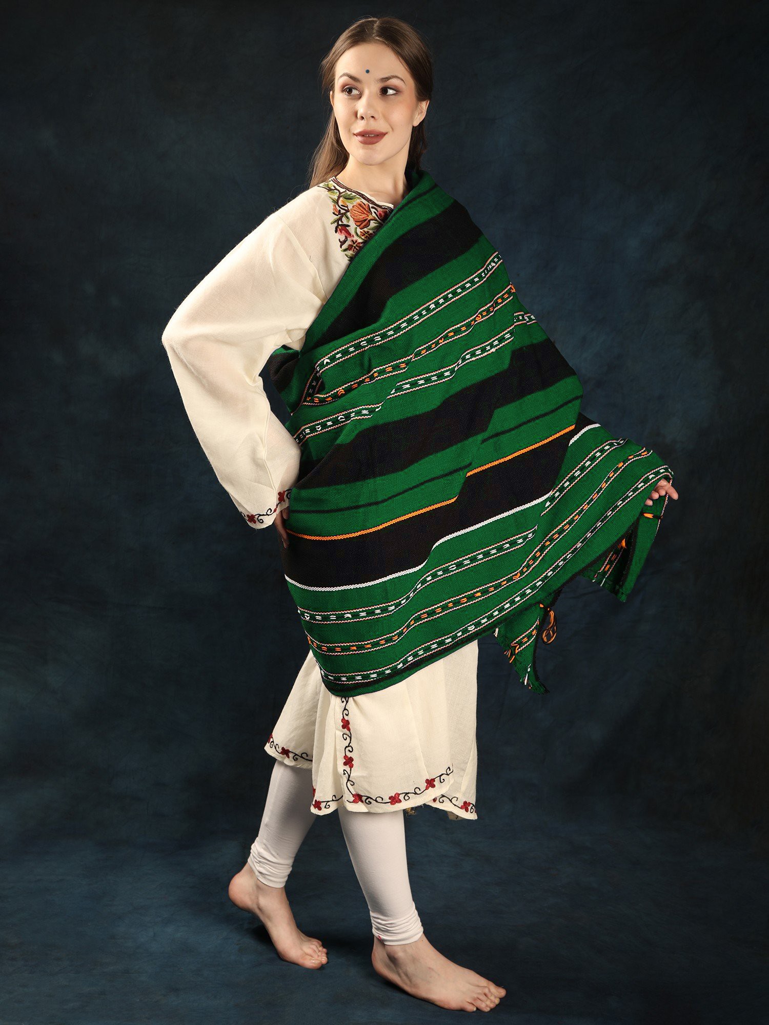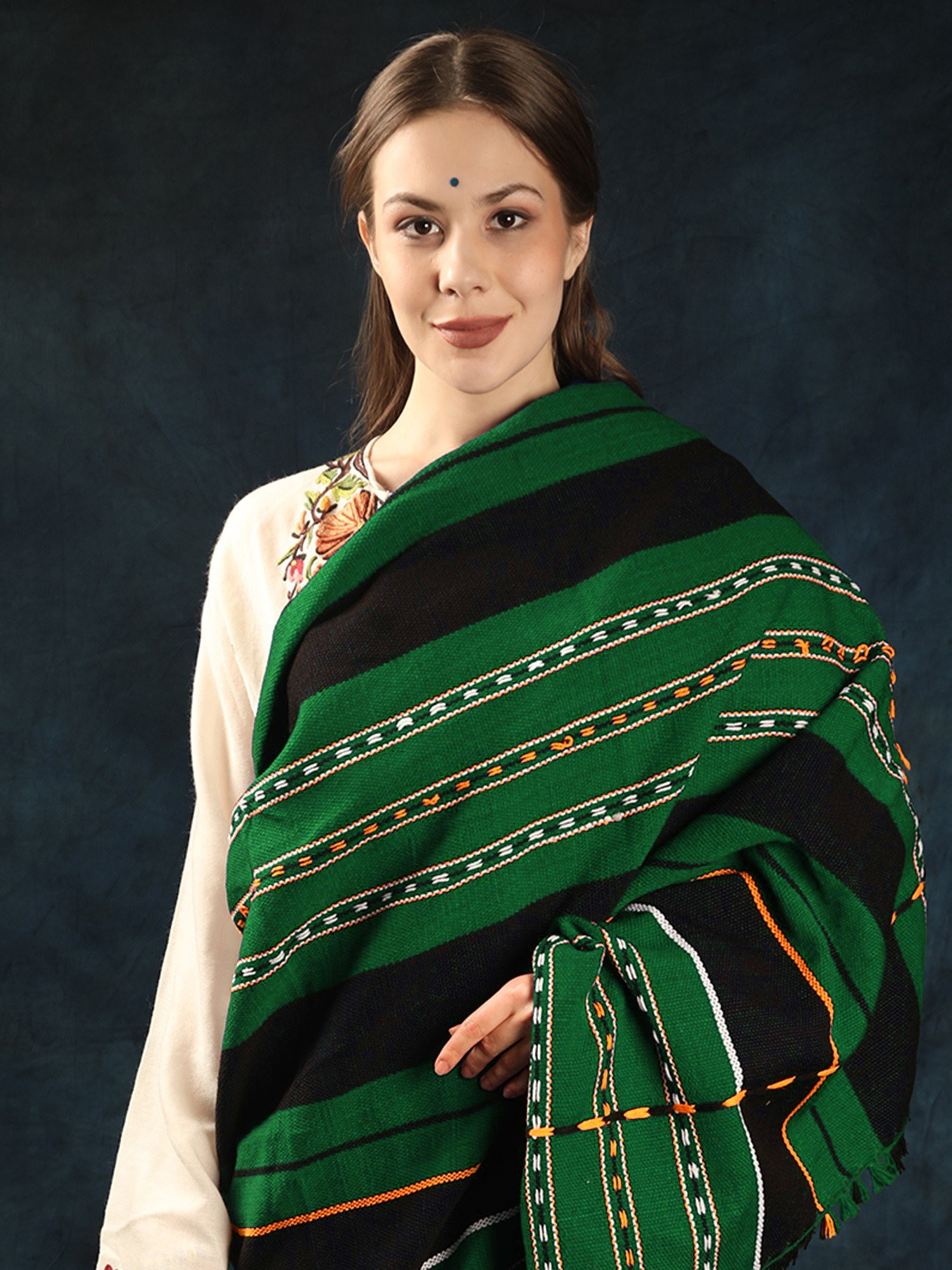 With this shawl, you may experience the essence of Nagaland's heritage and infuse your outfit with an aura of indigenous charm. This “folk shawl” captures the essence of Nagaland's rich colorful legacy, with each thread embroidered with narratives of tradition. Adorned with stripe patterns, it symbolizes the resilience and unity of its people. Its warmth is equaled only by its beauty, thanks to its superior wool construction. Wrap yourself in its embrace during chilly evenings, or drape it gracefully over your shoulders to exude eternal charm.