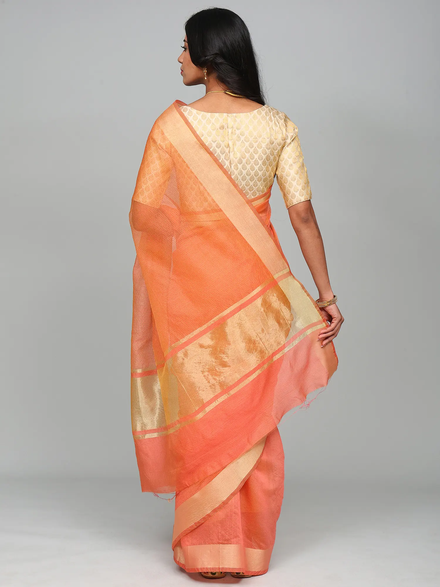 Adding to the saree's opulence is a stunning zari border. The shimmering gold threads of the zari work beautifully with the orange of the saree, creating a striking contrast that elevates the overall aesthetic. This meticulously crafted border is not just a decorative element; it adds a layer of refined elegance and serves as a testament to the skill of the artisans who created it. The border’s design is both classic and contemporary, ensuring the saree remains effortlessly stylish.