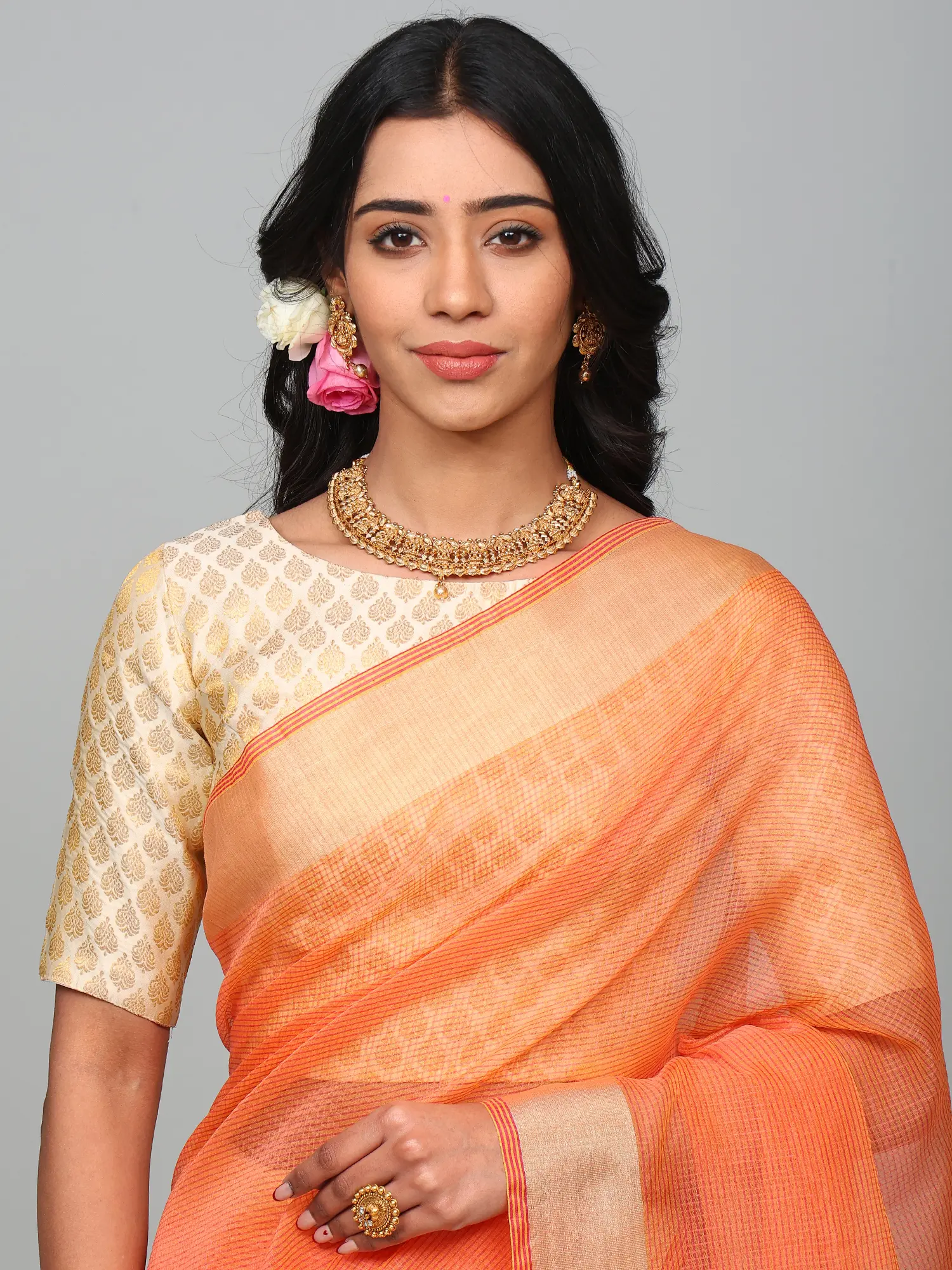 Adding to the saree's opulence is a stunning zari border. The shimmering gold threads of the zari work beautifully with the orange of the saree, creating a striking contrast that elevates the overall aesthetic. This meticulously crafted border is not just a decorative element; it adds a layer of refined elegance and serves as a testament to the skill of the artisans who created it. The border’s design is both classic and contemporary, ensuring the saree remains effortlessly stylish.