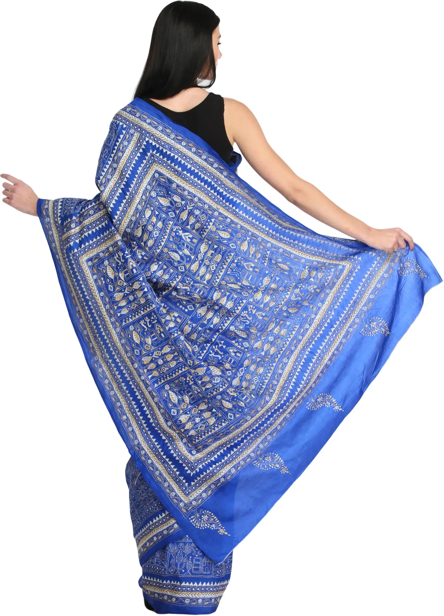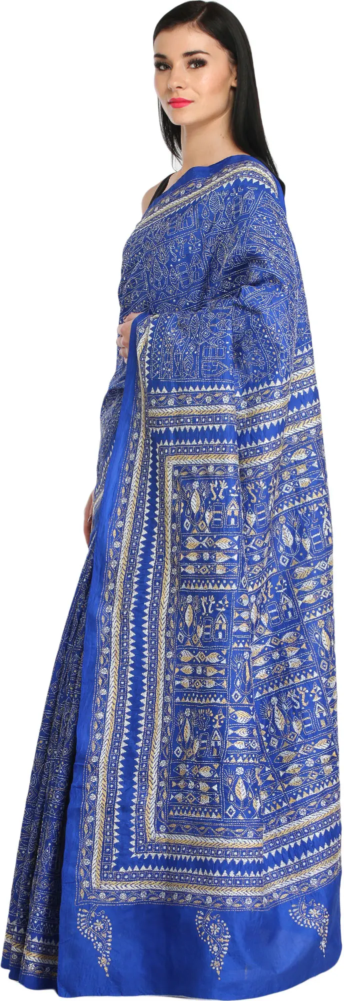 Rythmic-Red Sequins and Kantha Embroidered Crepe Saree with Printed Flowers