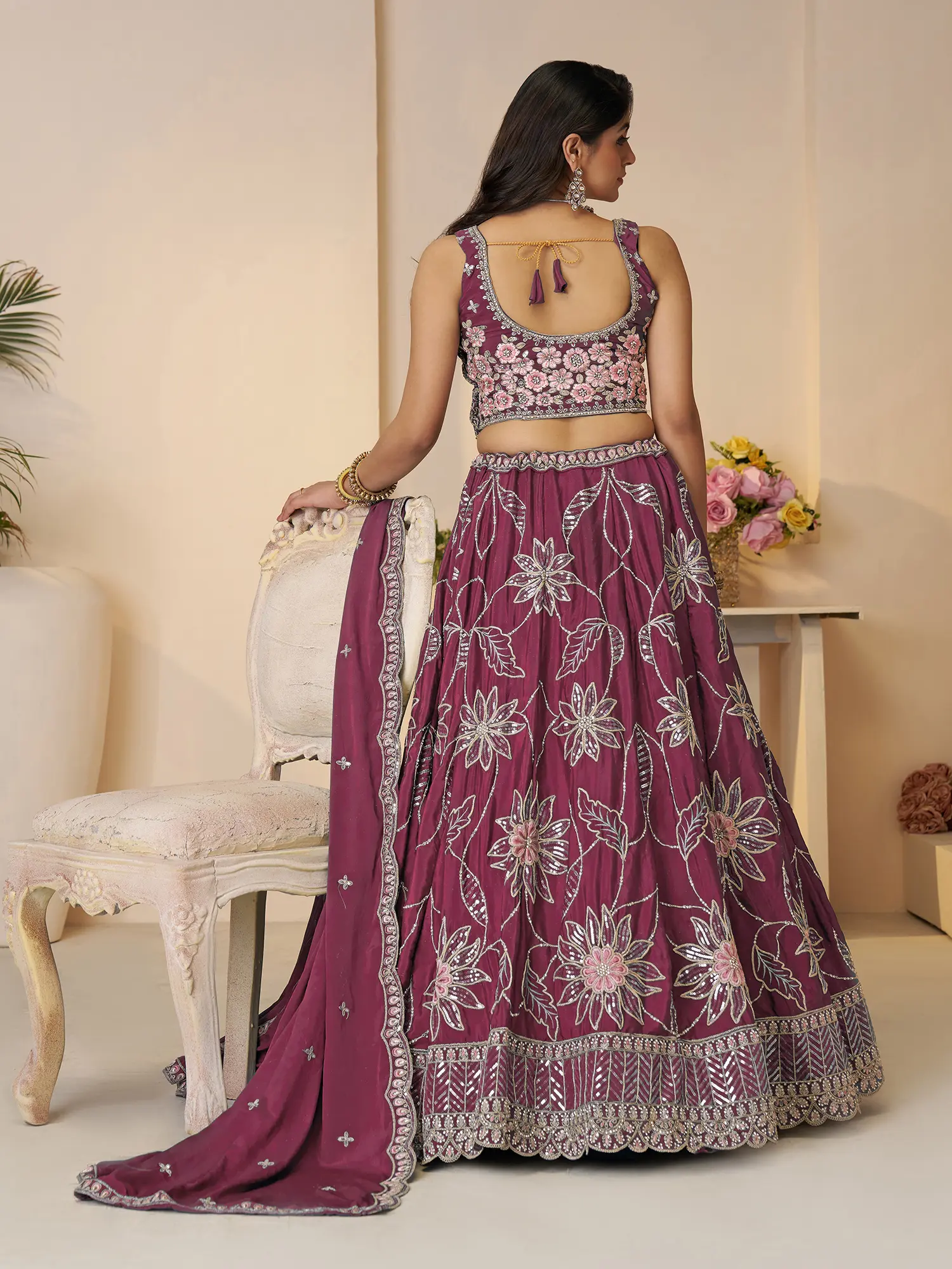 Stunning Wine Faux Georgette Lehenga Choli Set With Rich Golden Detailing Ideal For Brides And Parties