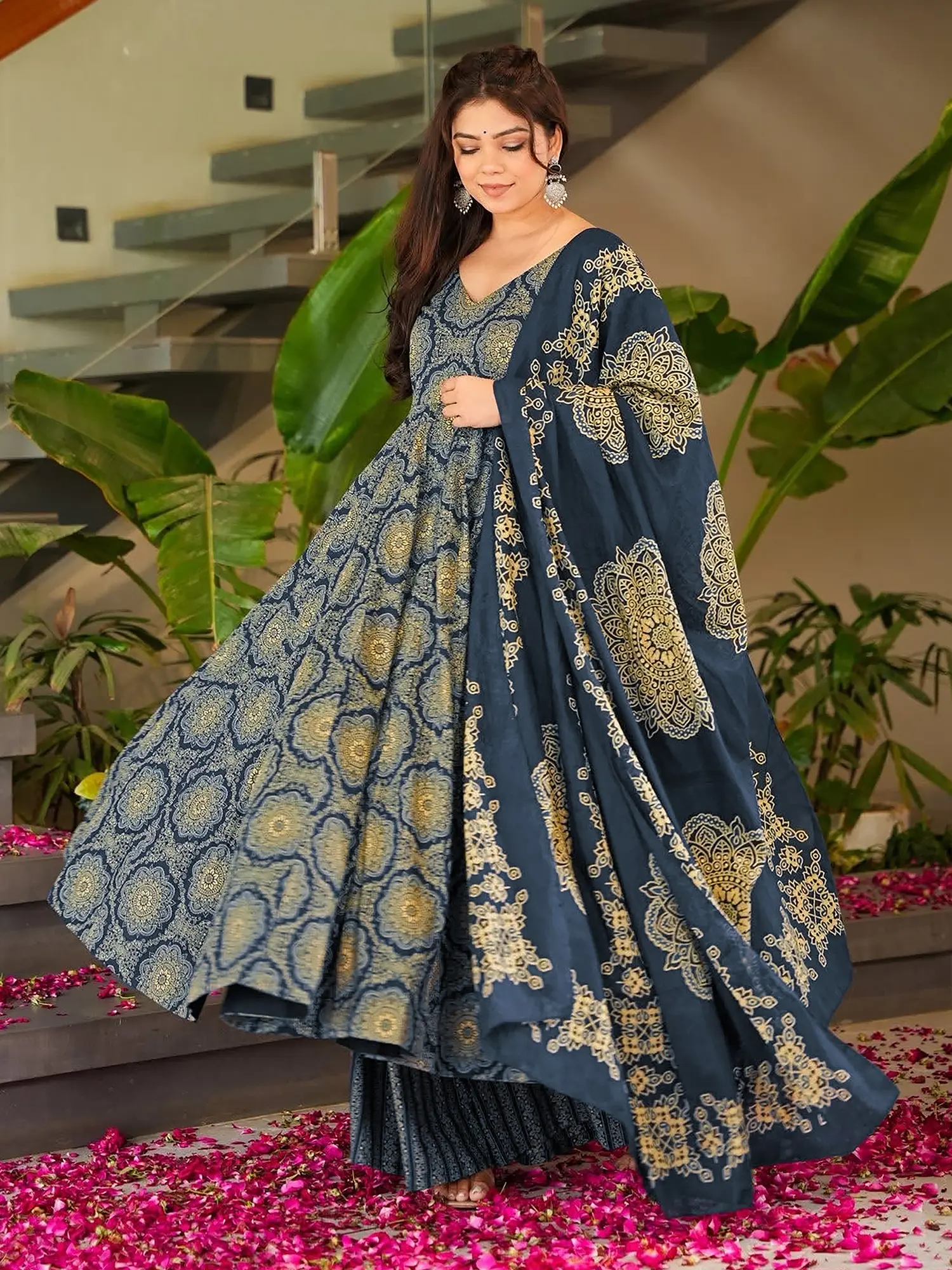 Adorn yourself in a symphony of deep, sophisticated hues, intricately detailed with a striking digital print. The flowing silhouette of the Anarkali style is designed to flatter, creating an ethereal movement with every step. The accompanying dupatta and bottom are perfectly coordinated, completing a look that is both cohesive and resplendent. This ensemble, crafted in size #34 (XS), offers a tailored fit for a refined silhouette.