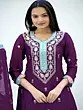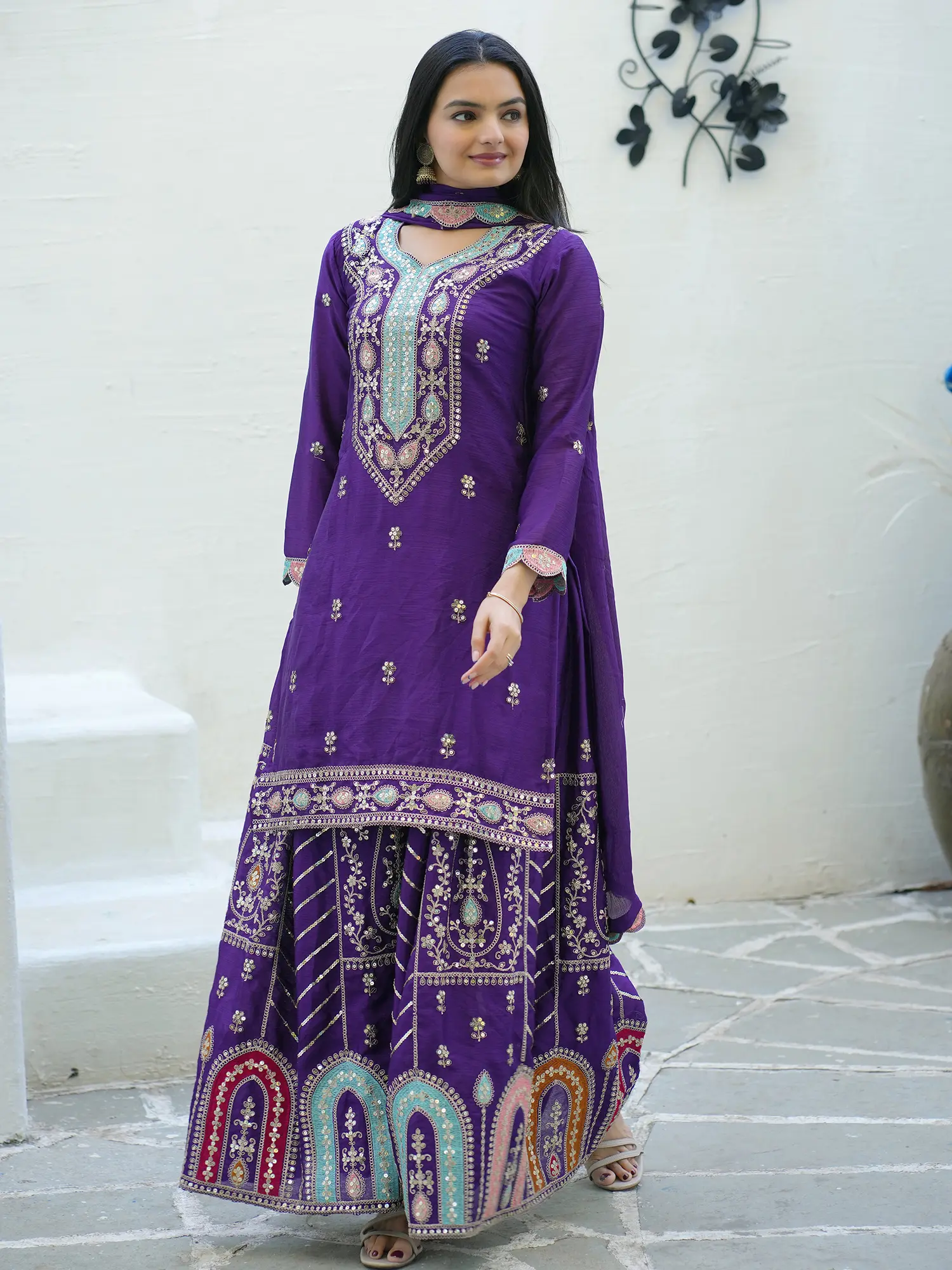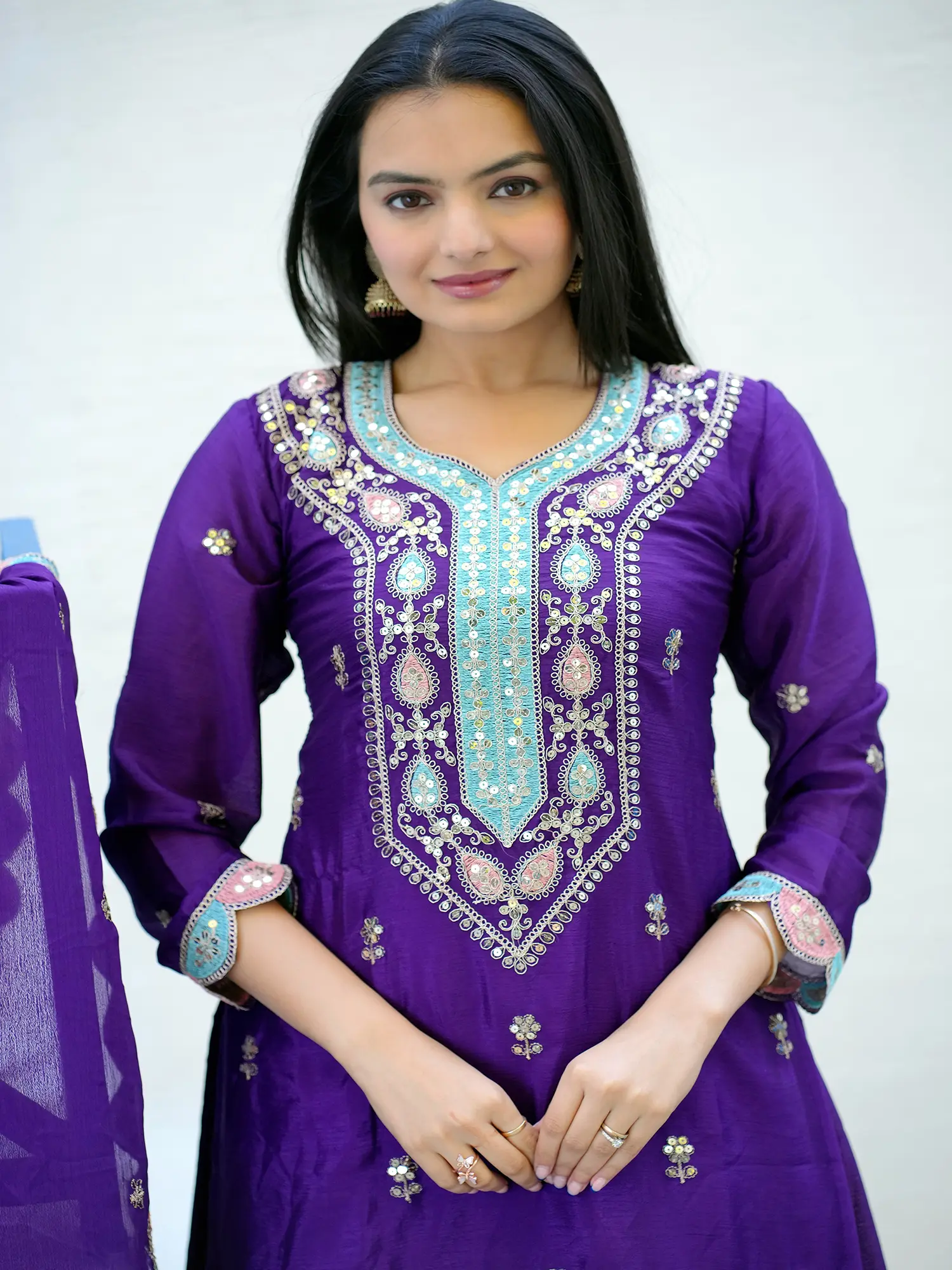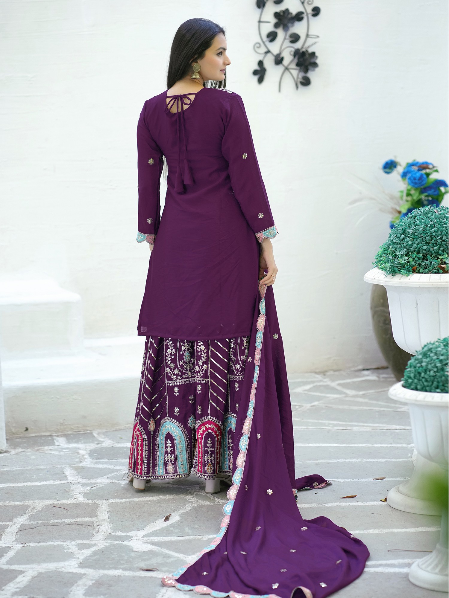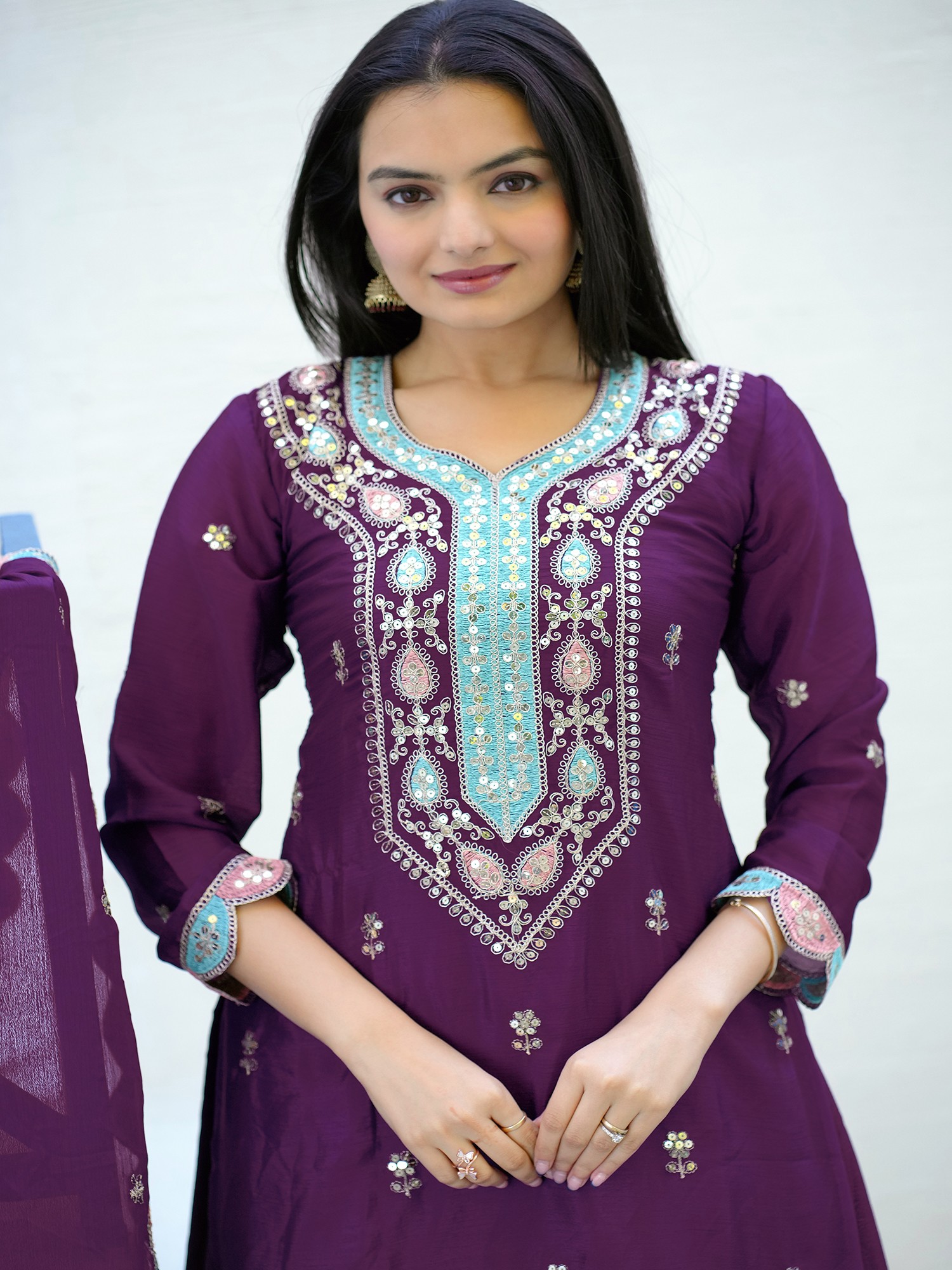Step into a world of unparalleled sophistication with this breathtaking Chinon Kurti Palazzo set, a true testament to intricate craftsmanship and festive allure. Designed for the discerning individual who appreciates the finer details, this ensemble promises to make you the cynosure of every occasion. The rich, deep purple hue of the Chinon fabric serves as a perfect canvas for the elaborate embroidery and dazzling sequins that adorn every inch of this creation.