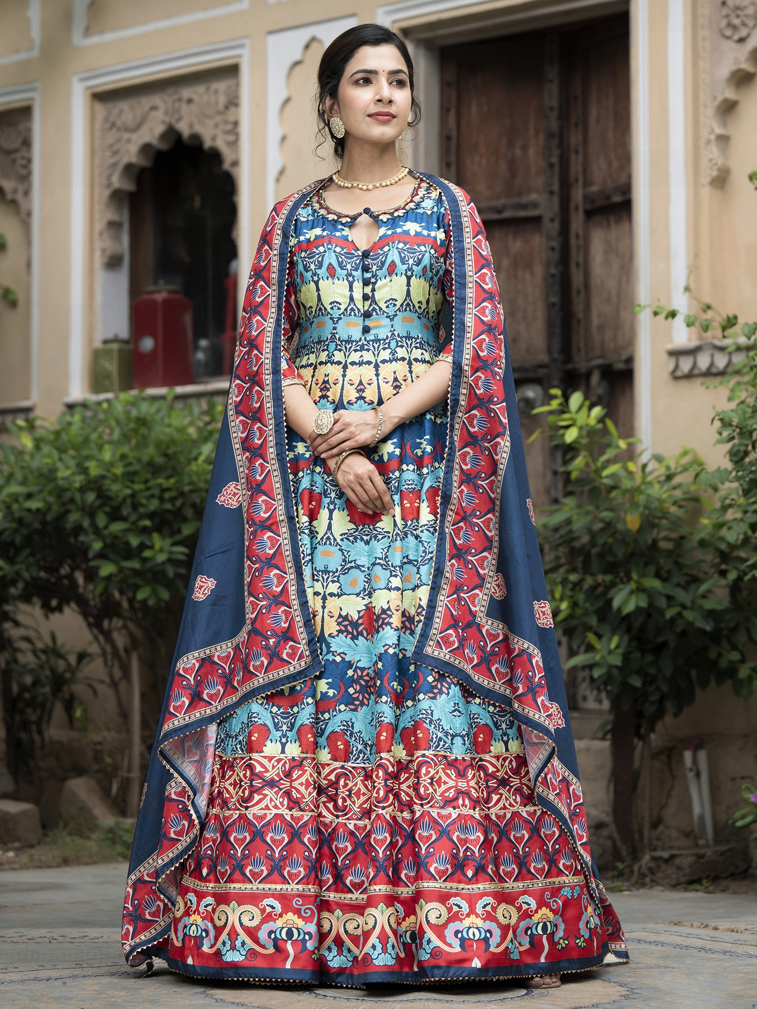 Stunning Digital Print And Flared Soft Dola Silk Wedding Wear Anarkali Gown With Chinon Dupatta