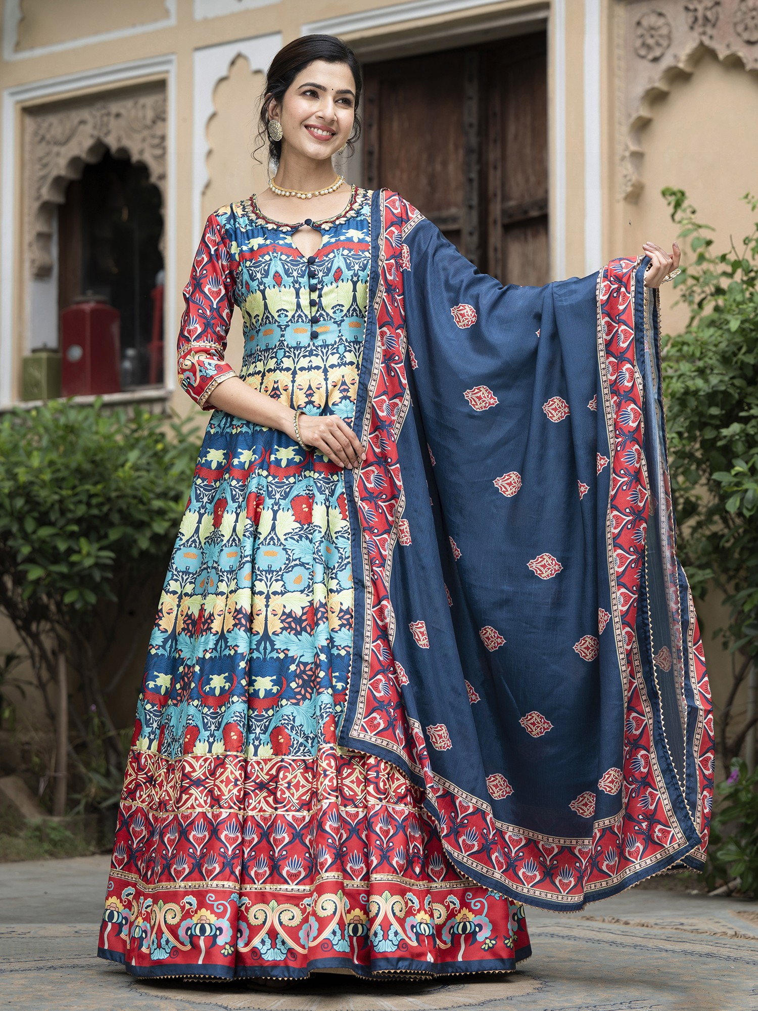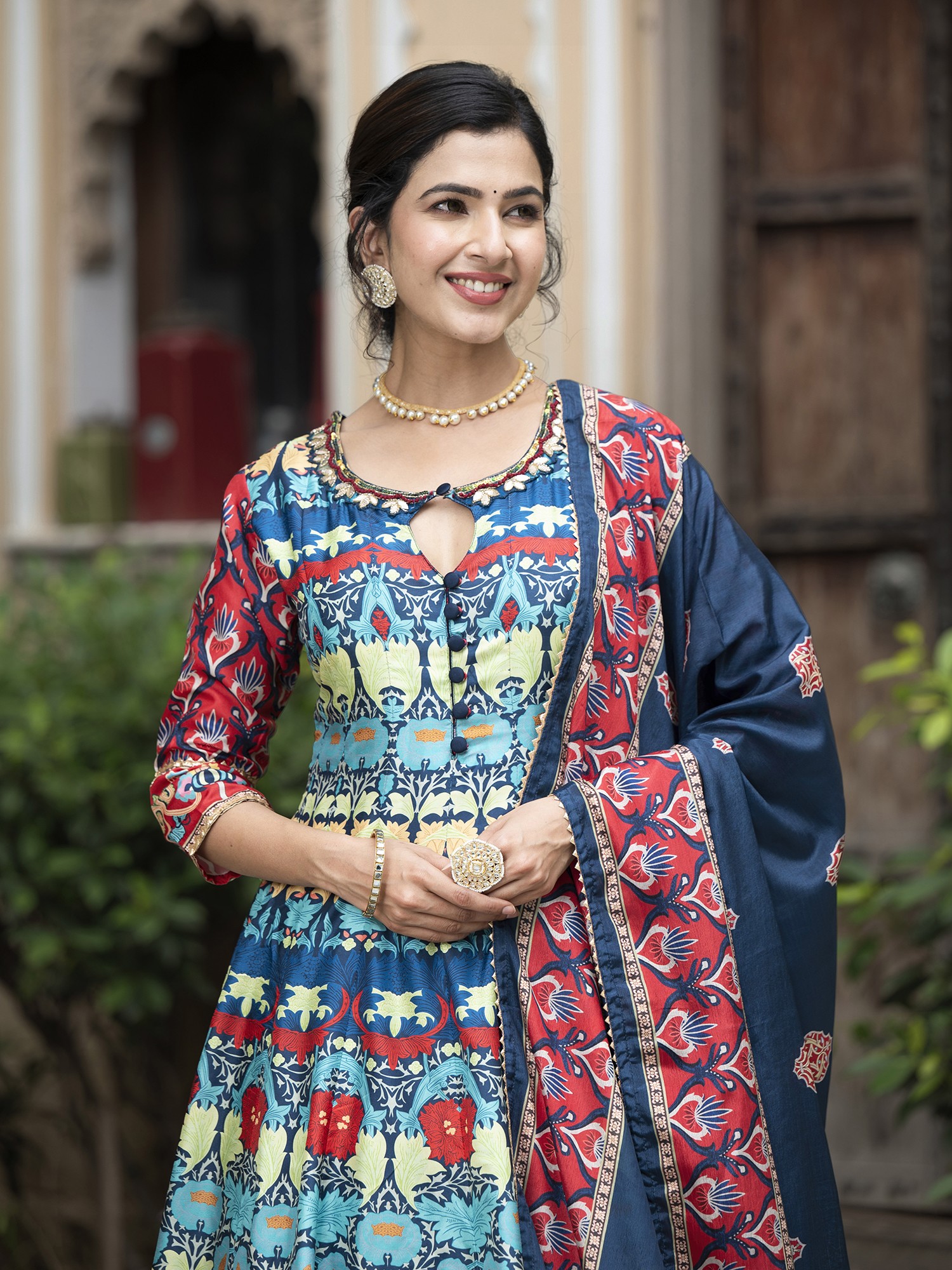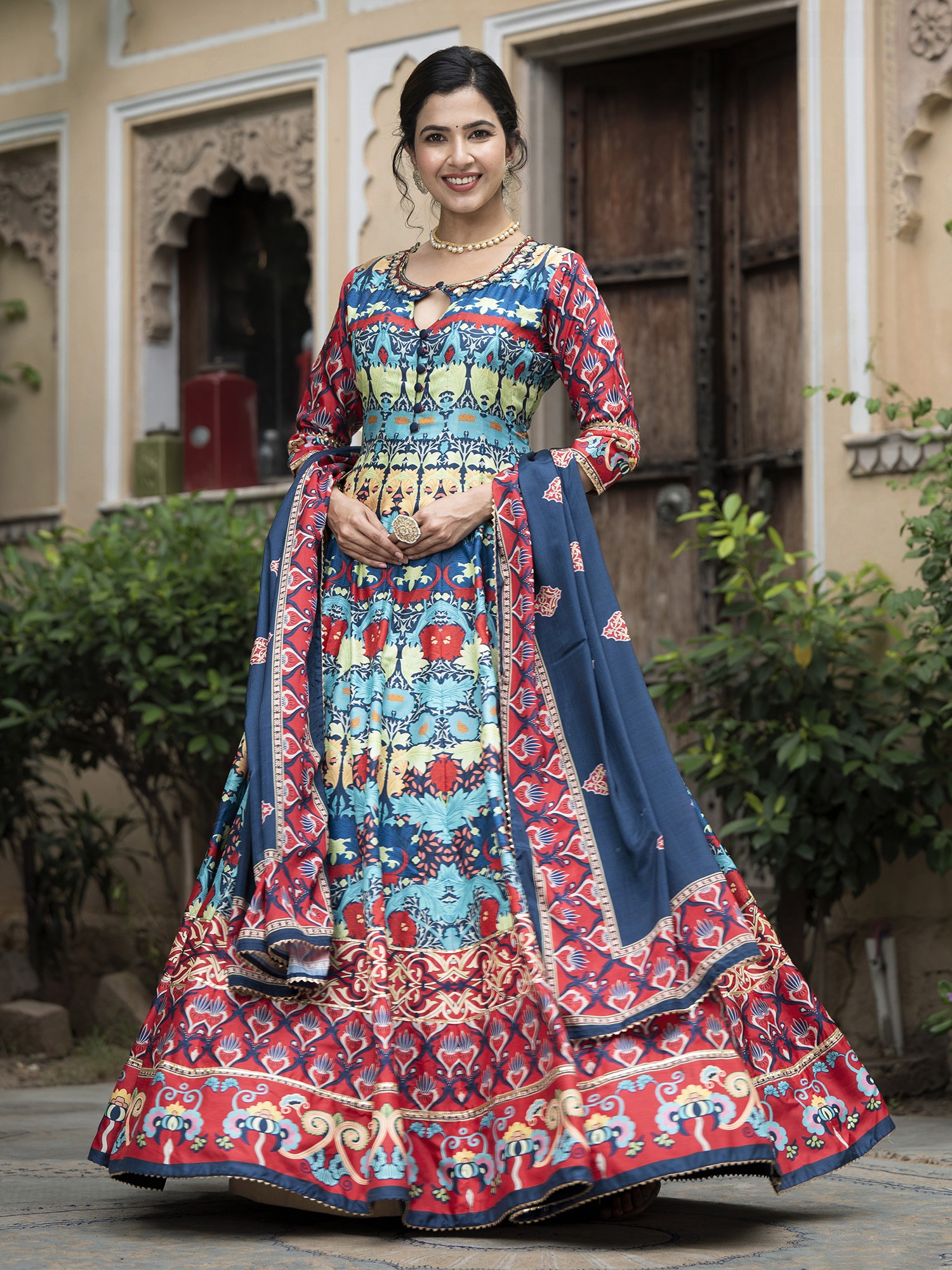 This Anarkali gown is a breathtaking fusion of traditional silhouette and modern design, perfect for making a statement at your next special occasion. Imagine yourself gliding across the room, the soft Dola silk flowing gracefully with every step. The digital print is a vibrant tapestry of colors and patterns, creating a look that is both eye-catching and sophisticated. This gown is designed to make you feel confident, beautiful, and ready to celebrate.
