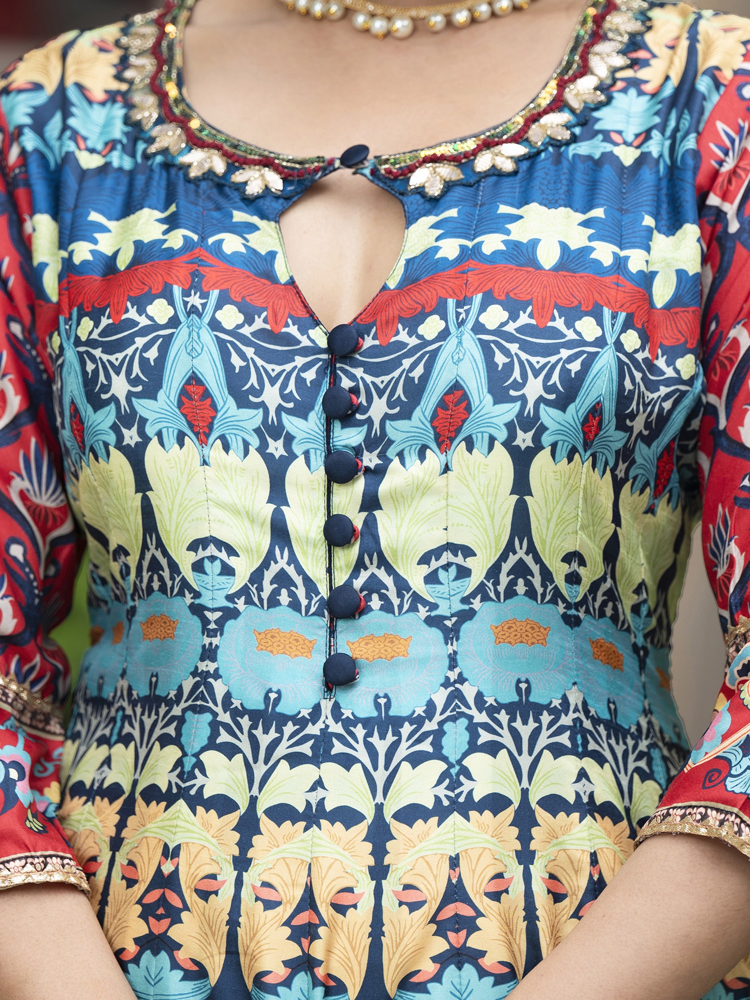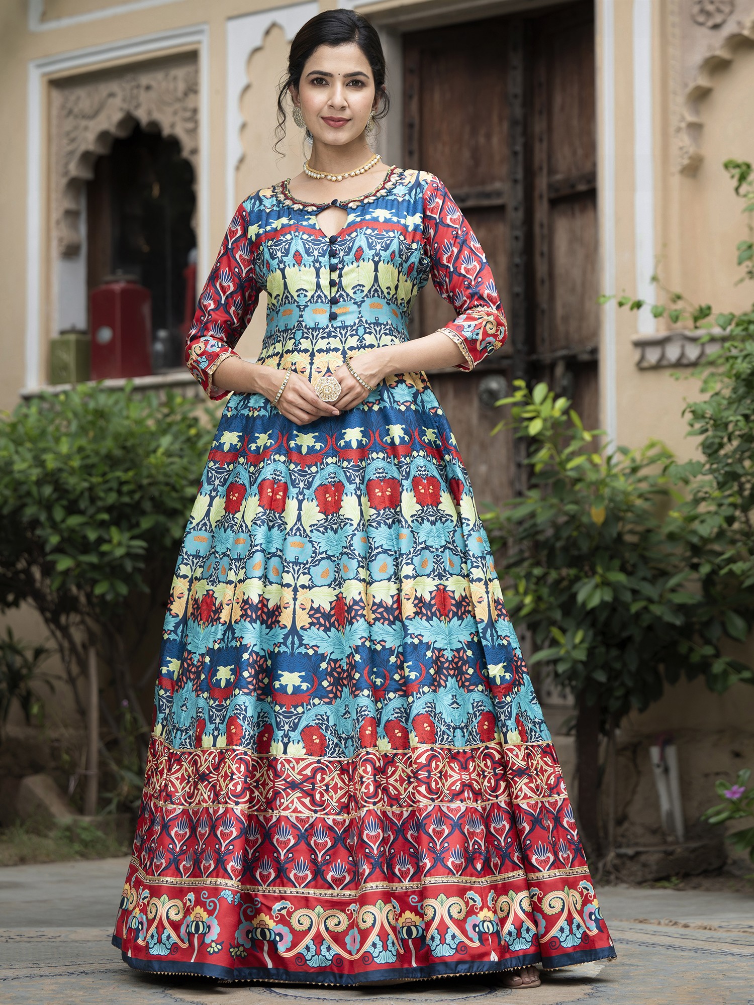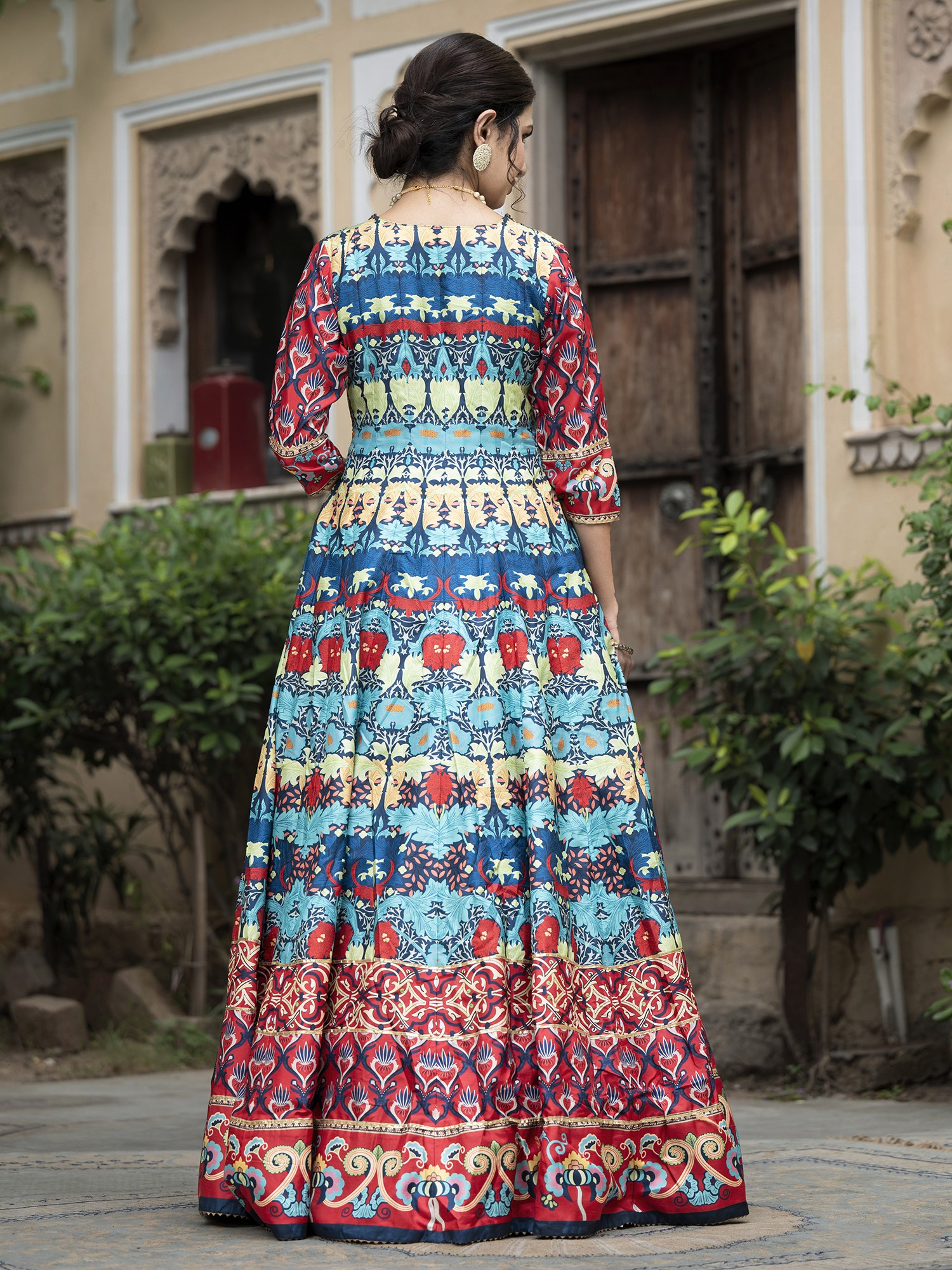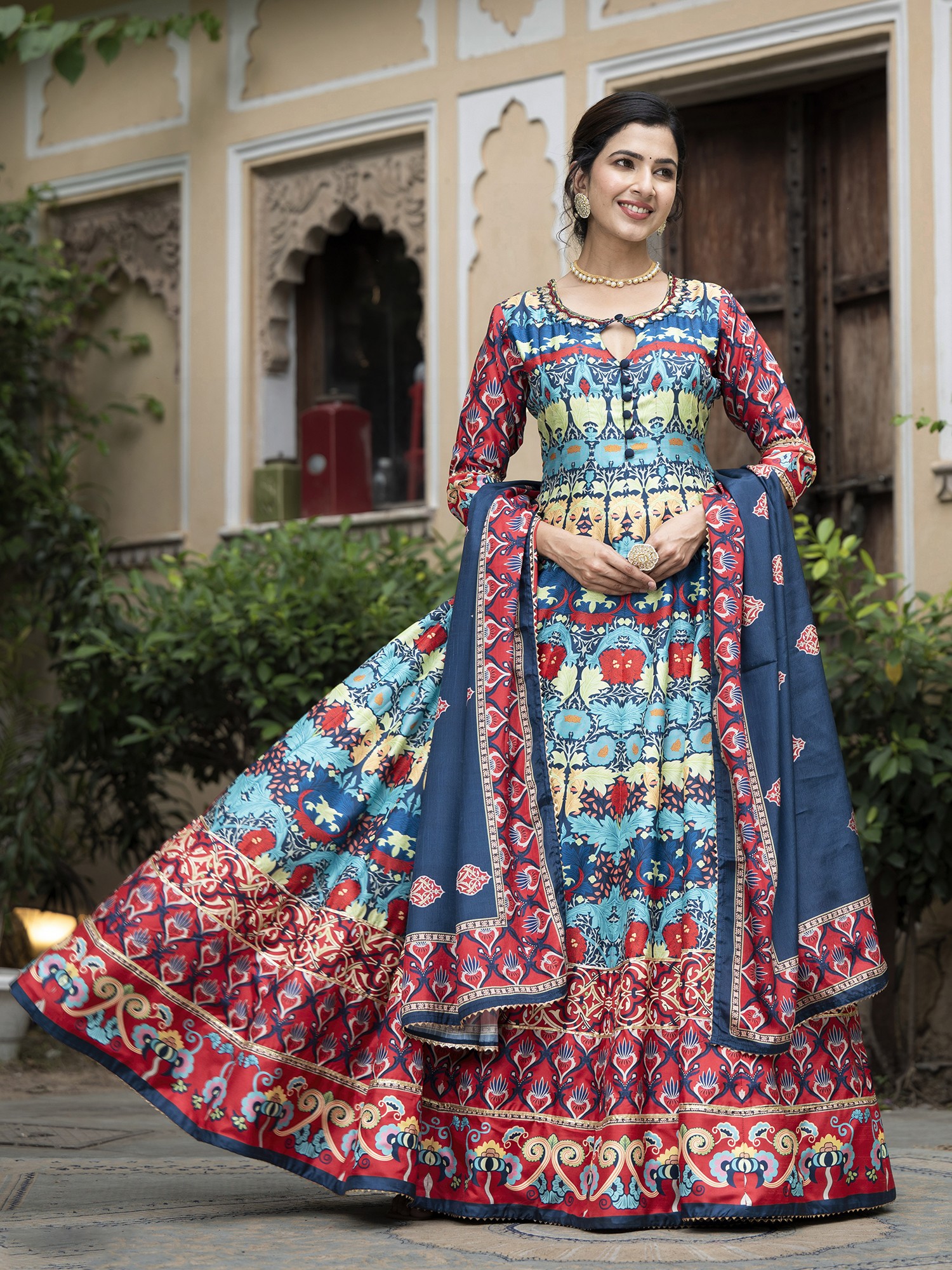 This Anarkali gown is a breathtaking fusion of traditional silhouette and modern design, perfect for making a statement at your next special occasion. Imagine yourself gliding across the room, the soft Dola silk flowing gracefully with every step. The digital print is a vibrant tapestry of colors and patterns, creating a look that is both eye-catching and sophisticated. This gown is designed to make you feel confident, beautiful, and ready to celebrate.