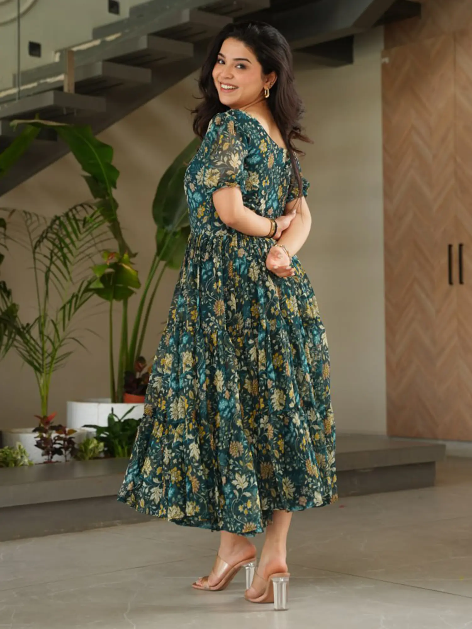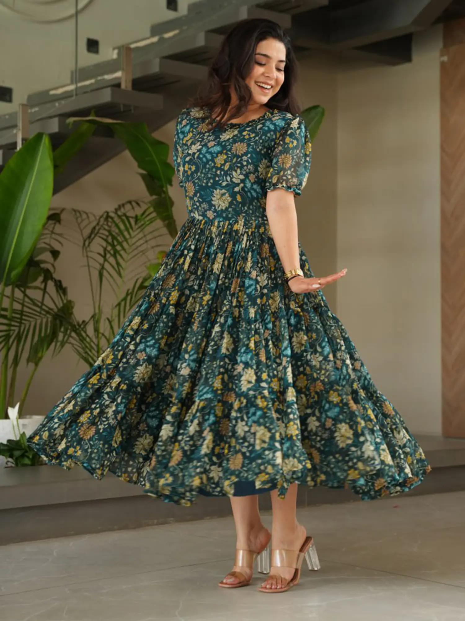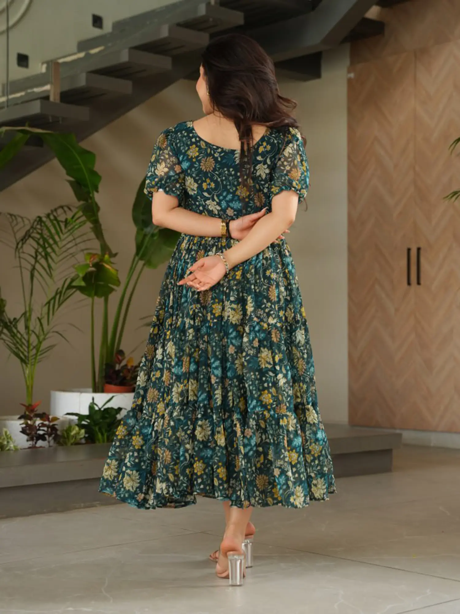 The enchanting floral motif unfolds across the entire expanse, from the graceful neckline to the sweeping hemline. Subtle puff sleeves add a touch of romantic flair, while the tiered skirt creates a captivating volume that promises elegant movement. This ensemble embodies a sophisticated aesthetic, ensuring you command attention with understated sophistication. The overall effect is one of fluid grace and undeniable charm, a true statement of refined style.