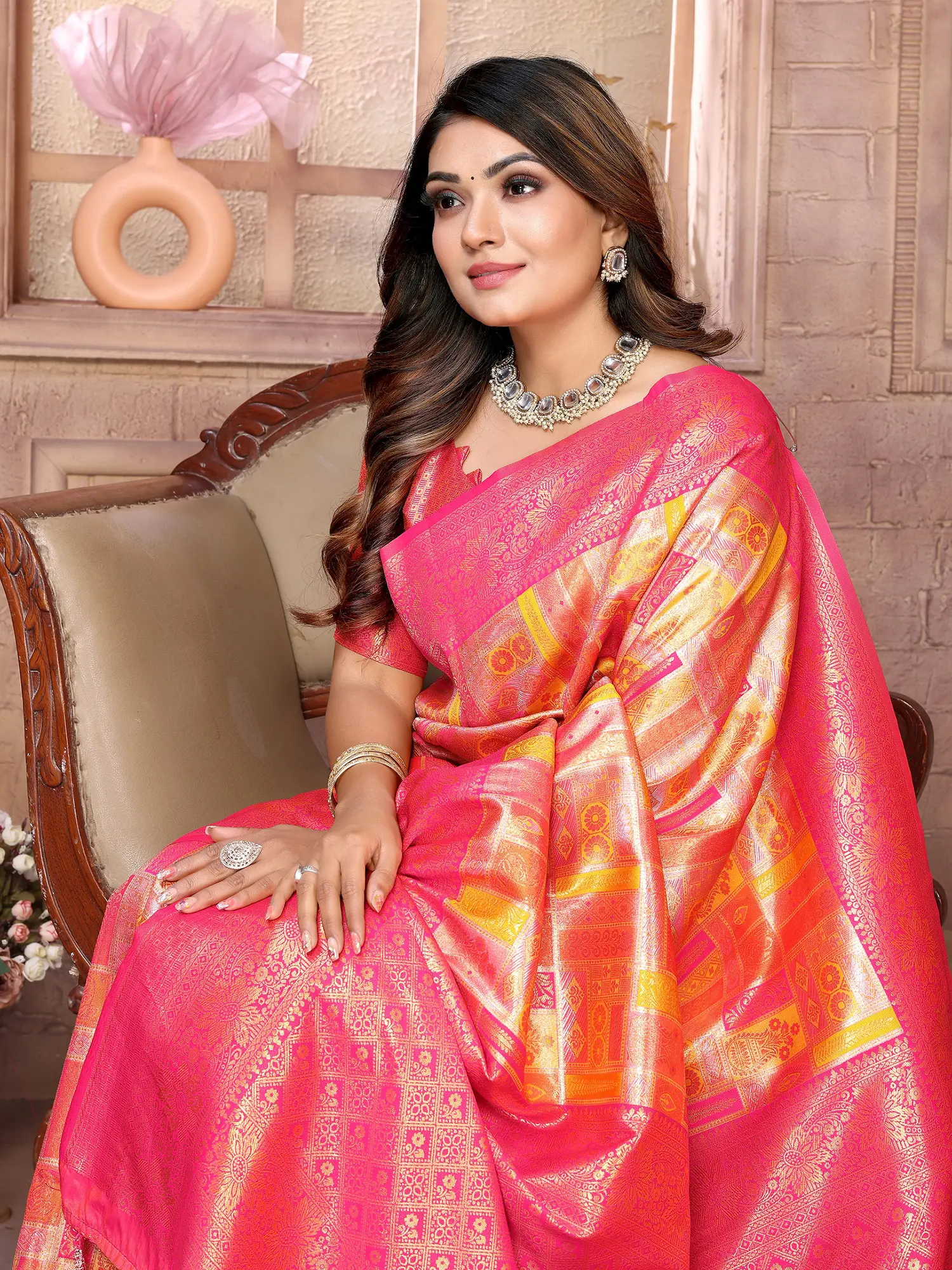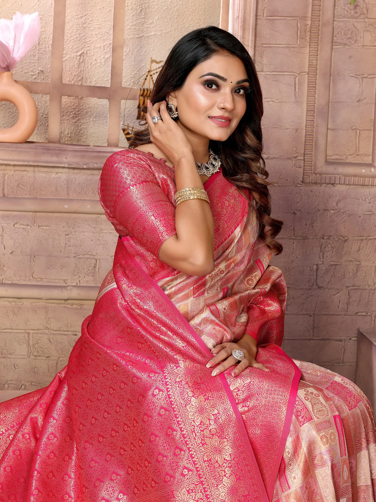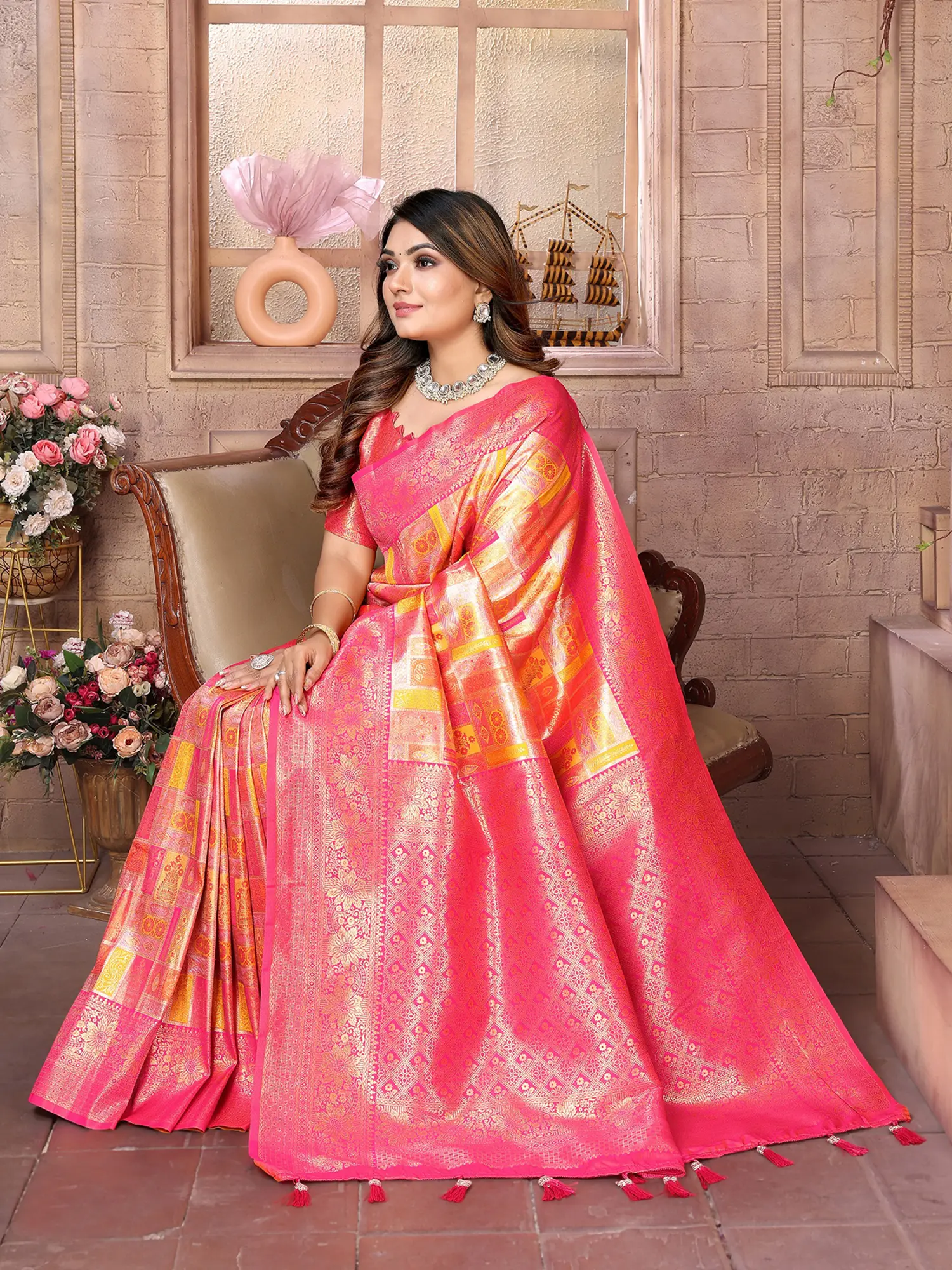 Geometric Pattern Kanjivaram Silk Heavy Jari Weaving & Printed Saree With Tassels Pallu