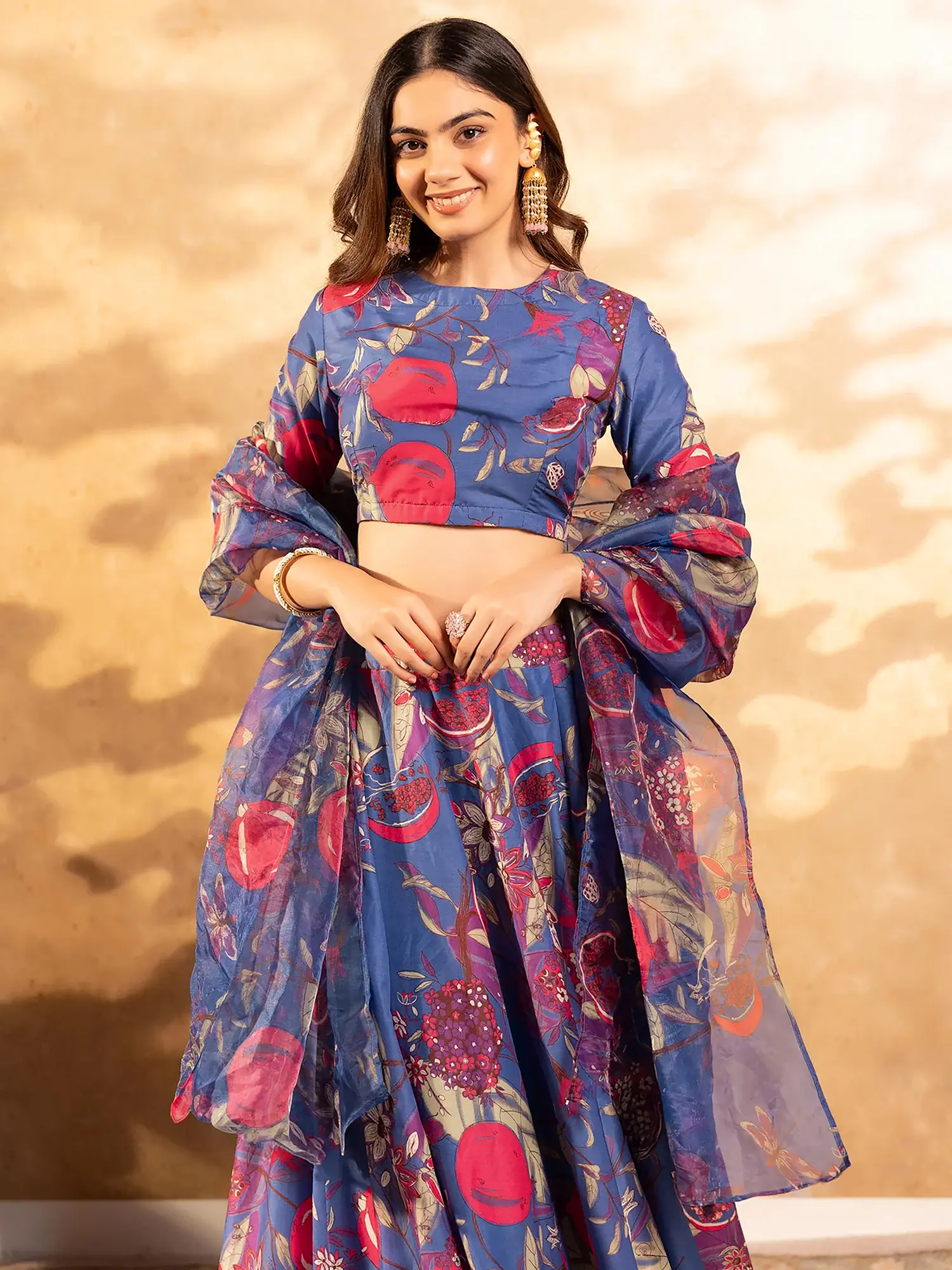 The captivating digital print showcases a breathtaking display of blue and purple florals, bursting with life and rich with detail. This vibrant artistry adorns the flowing lehenga and the complementary choli, creating a harmonious and visually arresting composition. The accompanying dupatta, crafted from a lighter, sheer fabric, adds an ethereal layer, its subtle print echoing the main design. The silhouette, designed for a size #34 (XS), offers a flattering and comfortable fit.