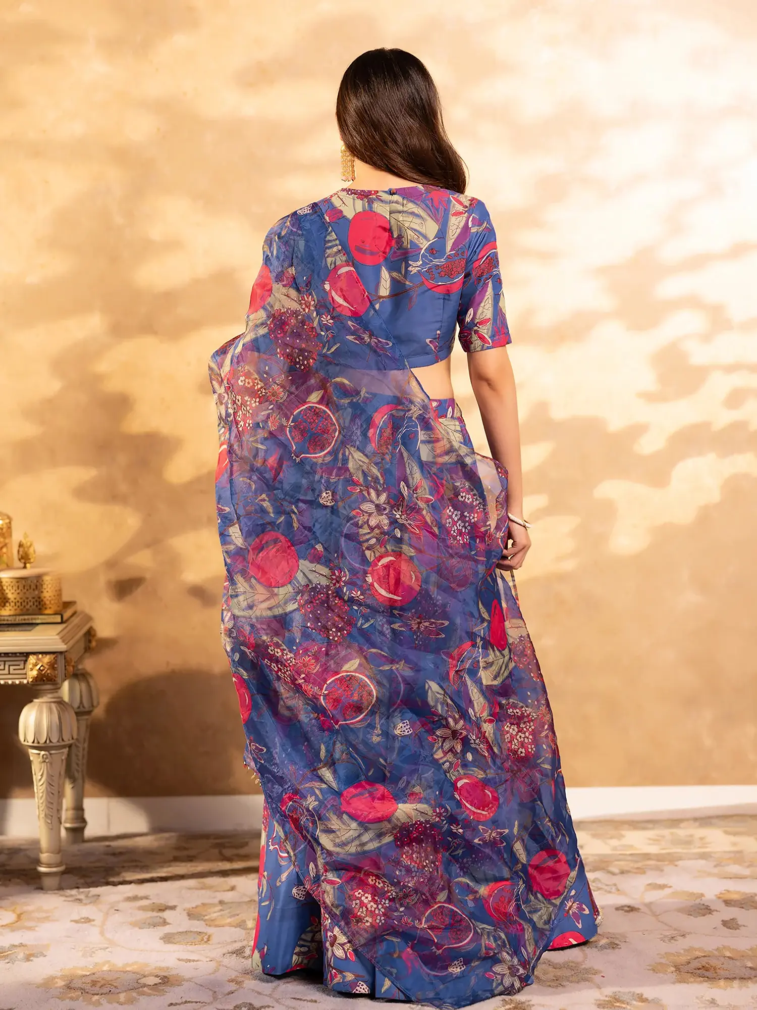 Each element is meticulously crafted from premium Chinon fabric, chosen for its luxurious drape and subtle sheen. The striking blue-purple hue serves as the perfect backdrop for the intricate digital print, a testament to modern textile artistry. You'll appreciate the fine detailing and the smooth finish that underscores the commitment to exceptional quality.
