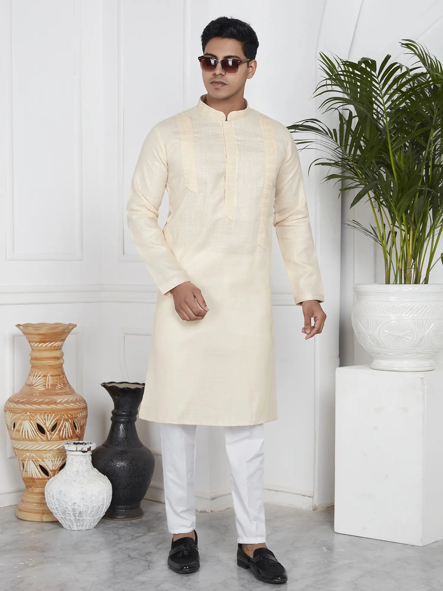 Golden-Beige Wedding Kurta Pajama with Faux Pearl Embroidery on Neck