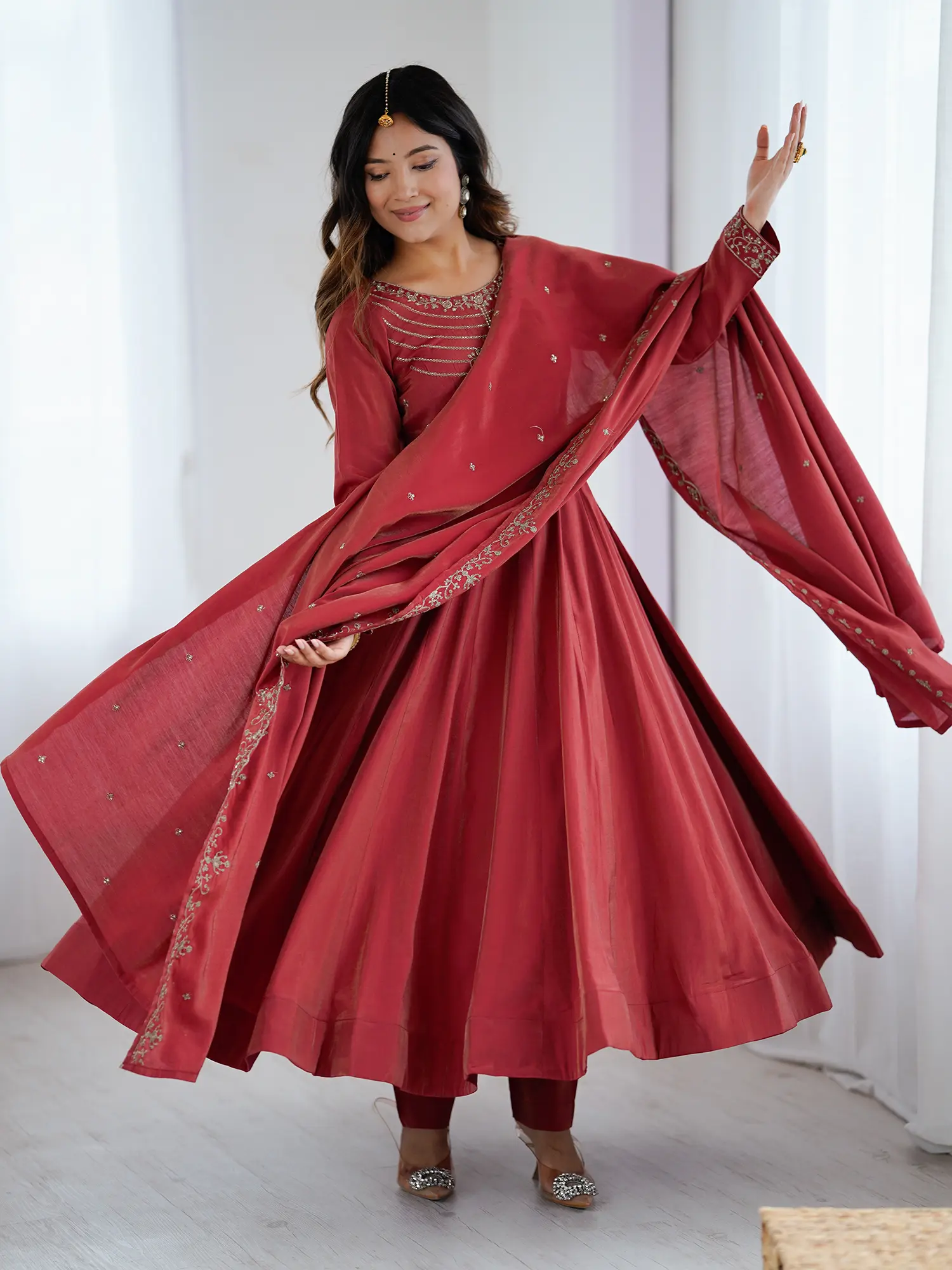 The deep, alluring maroon shade evokes warmth and sophistication, enhanced by the subtle shimmer of the Chanderi silk, which catches the light with every subtle movement. This flowing silhouette creates a flattering and majestic appearance, while the thoughtfully embellished yoke provides a focal point of refined artistry. The accompanying dupatta is a masterpiece of subtle embellishments, mirroring the exquisite detailing of the main piece and completing the ensemble with harmonious elegance.