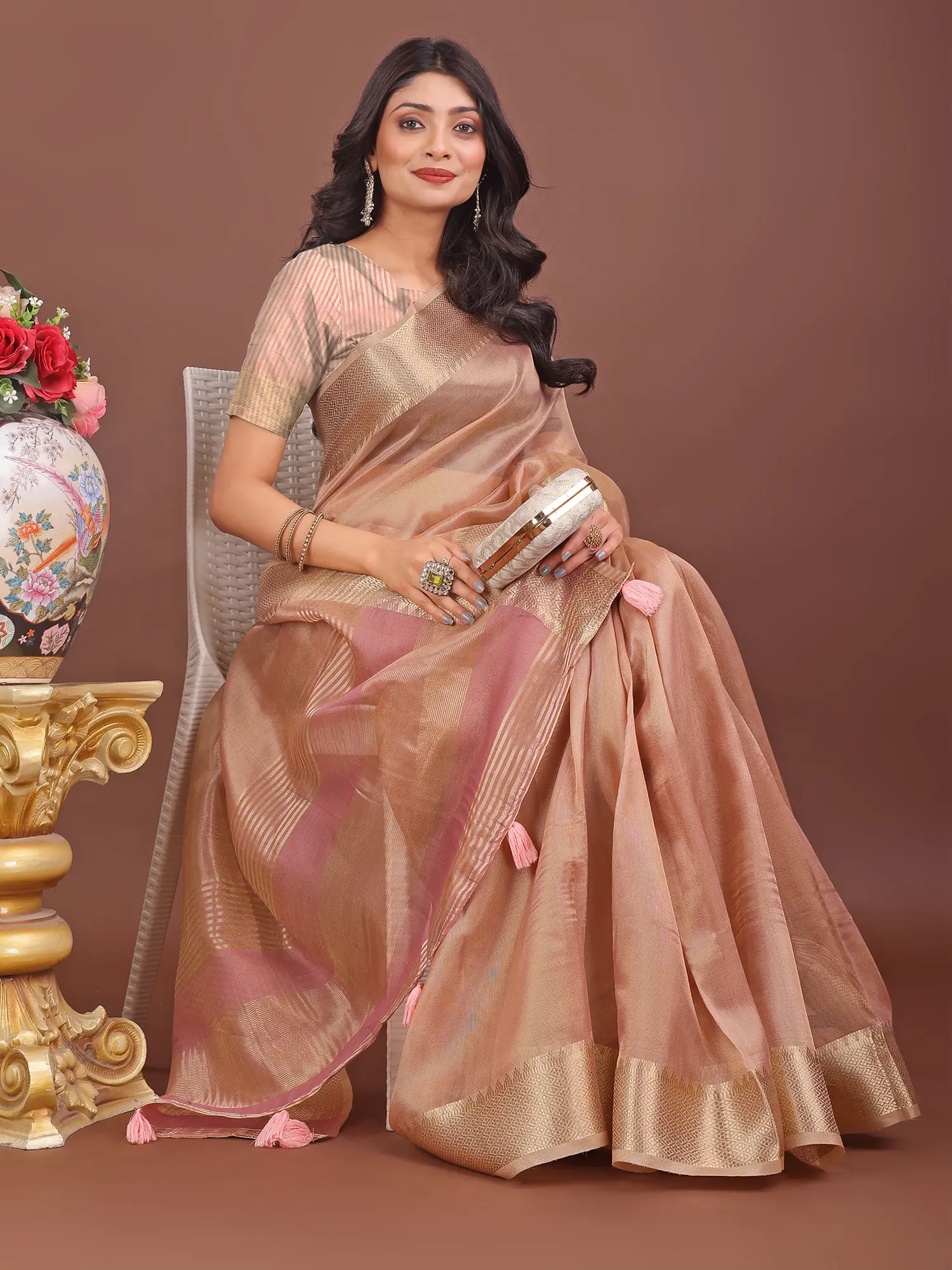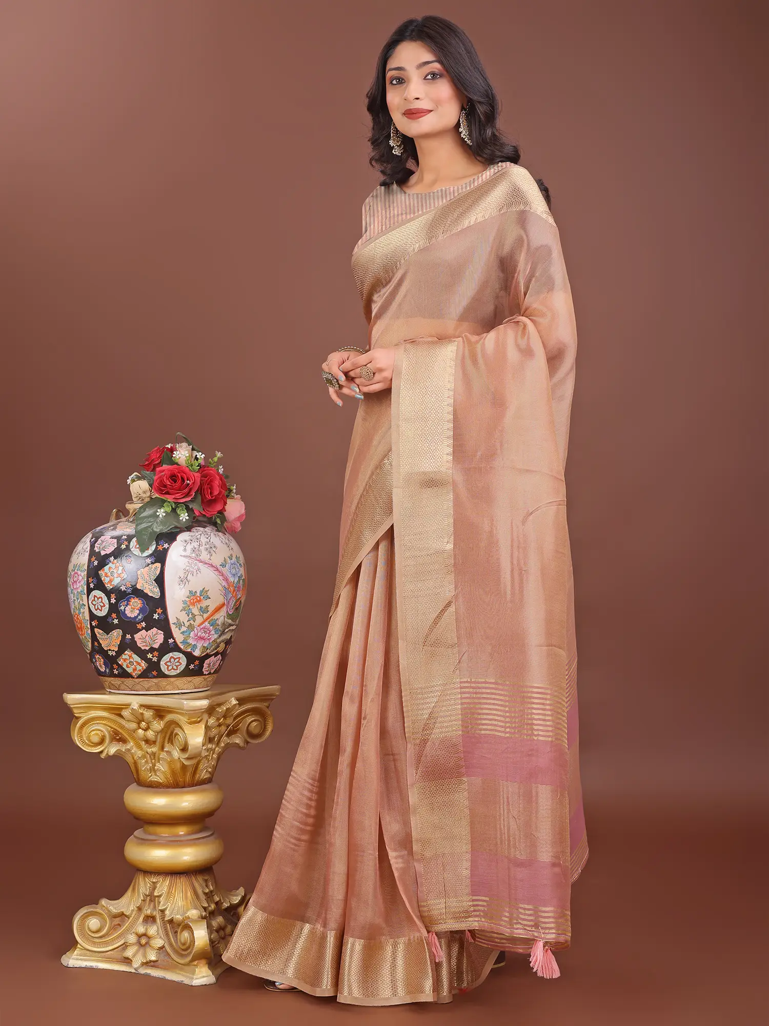 Plain Attractive Casual Wear Organza Saree With Tassels Pallu And Blouse