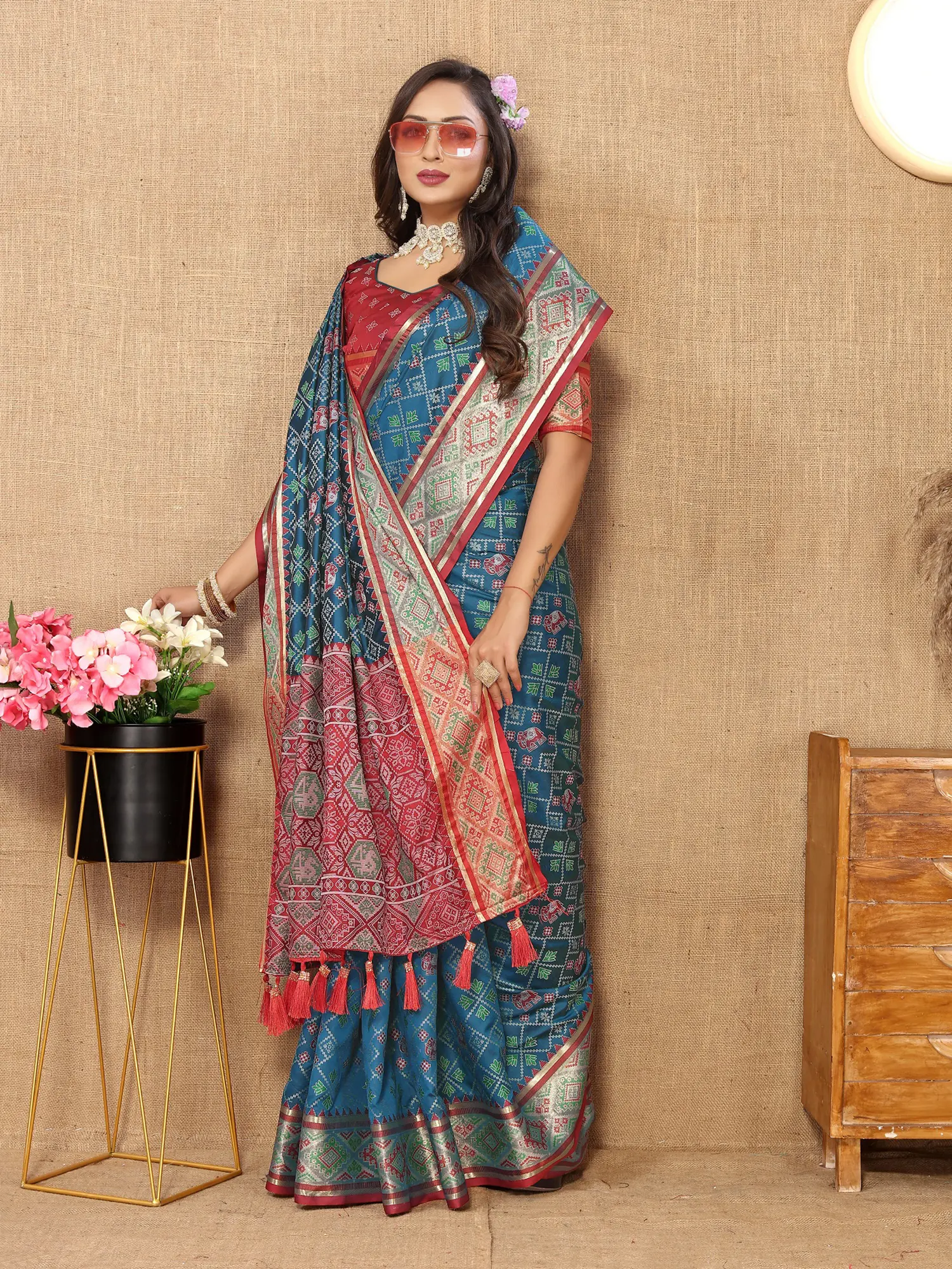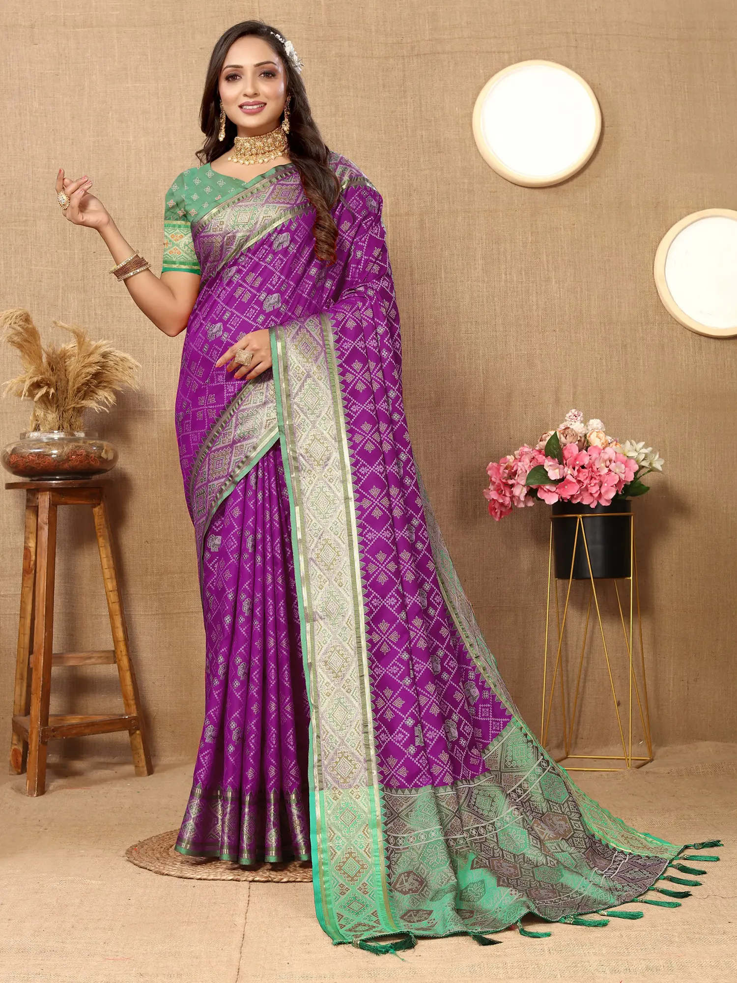 This Patola silk saree is not just an attire; it's an experience. It is designed to make you feel like royalty at any festive occasion, wedding, or special gathering. The inherent richness of silk combined with the elaborate weaving work makes it a standout piece that embodies both tradition and contemporary flair. Drape yourself in its luxurious folds and let the vibrant colors and intricate designs be a reflection of your impeccable taste. Pair it with statement jewelry and elegant footwear to complete a look that is both breathtaking and memorable. The inherent beauty of the silk and the detailed craftsmanship ensure that this saree will be a cherished addition to your ethnic wardrobe for years to come.