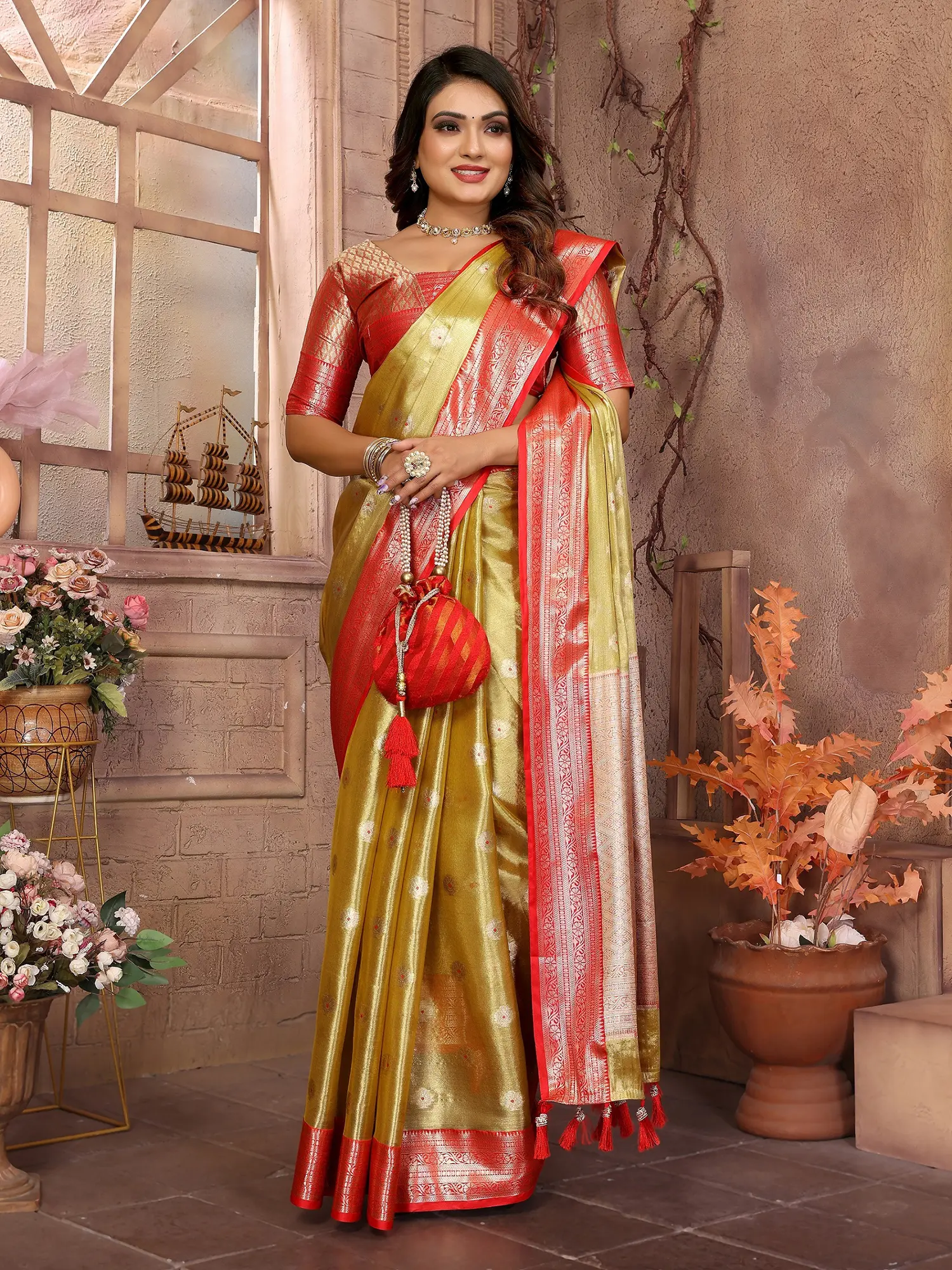 Designed for celebratory occasions, this saree embodies the spirit of festivity. The lustrous tissue silk catches the light beautifully, making you the undeniable center of attention at any event. The vibrant color palette, accentuated by the contrast weaving, ensures a look that is both striking and sophisticated. The saree drapes effortlessly, highlighting the natural grace of the wearer. As you move, the silk flows and shimmers, creating a mesmerizing effect. The addition of charming tassels on the pallu adds a playful yet elegant finishing touch, completing the ensemble with a flourish.