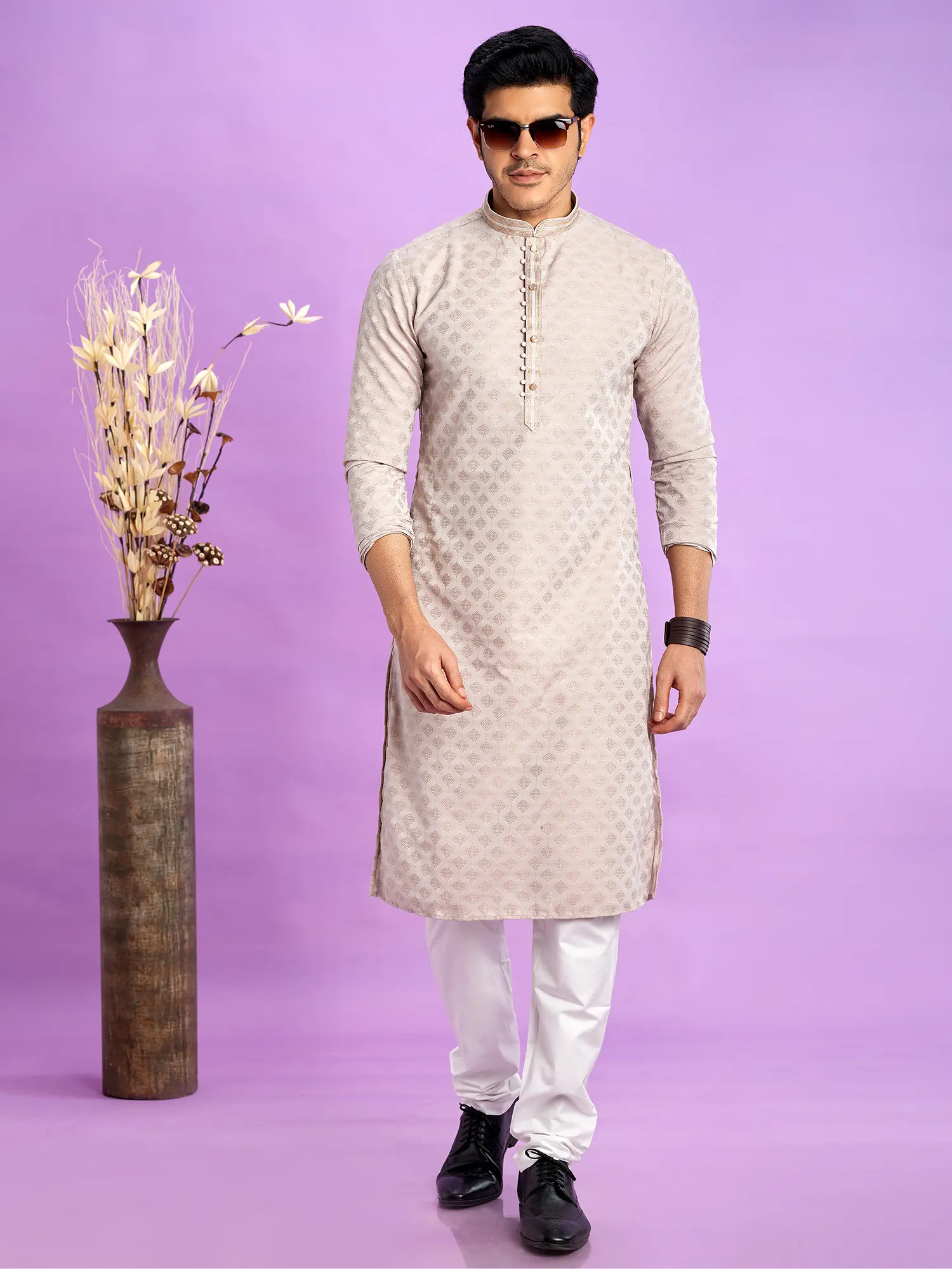 Men's Stylish Straight And Mandarin Collar Jacquard Silk Kurta With Churidar Pajama