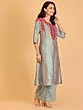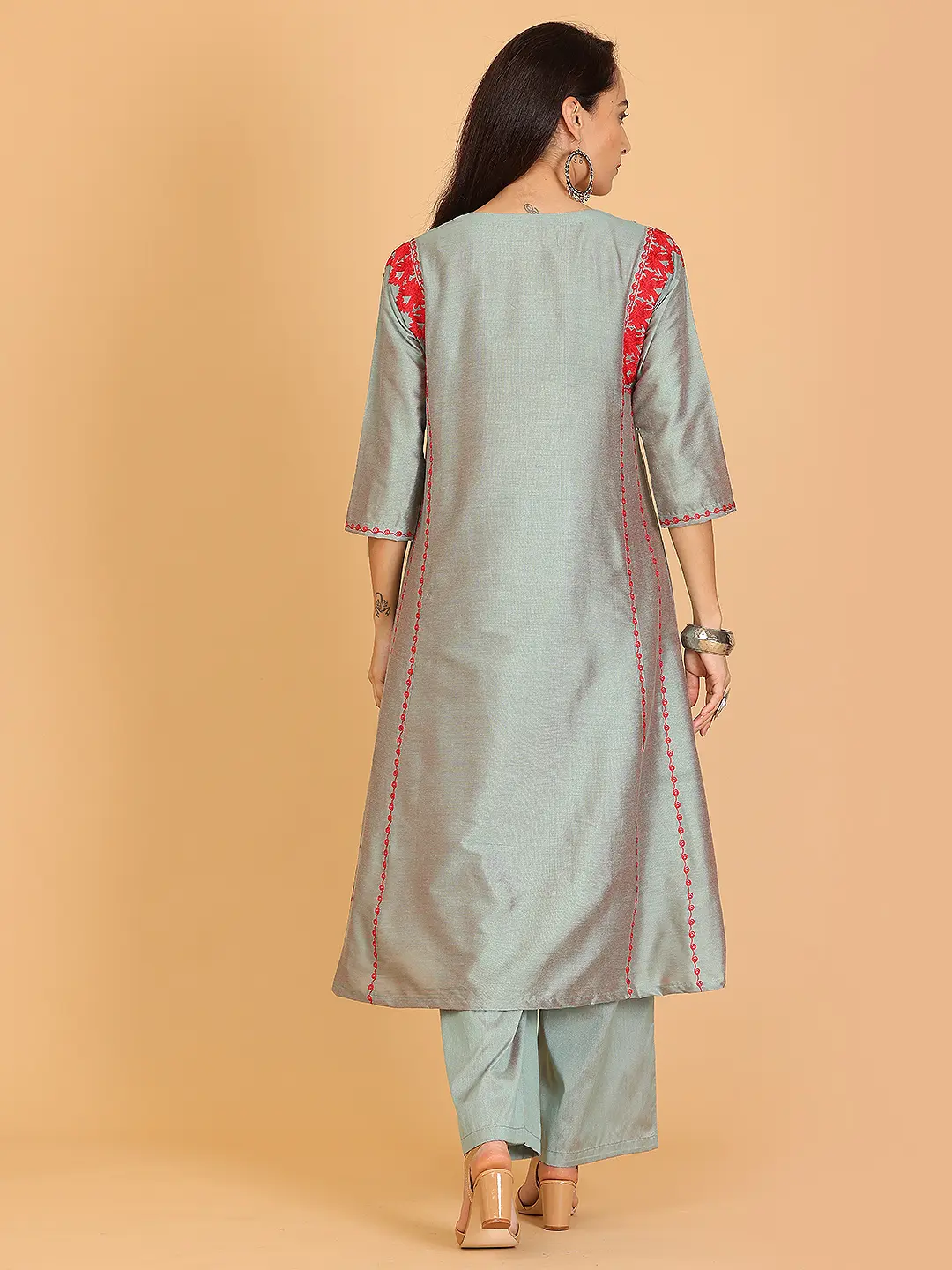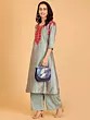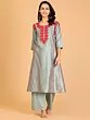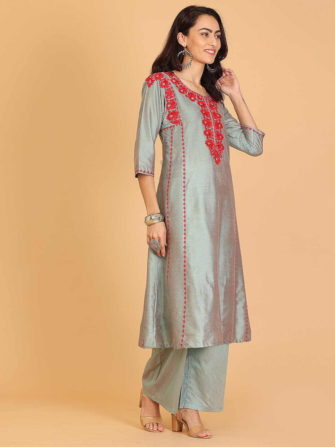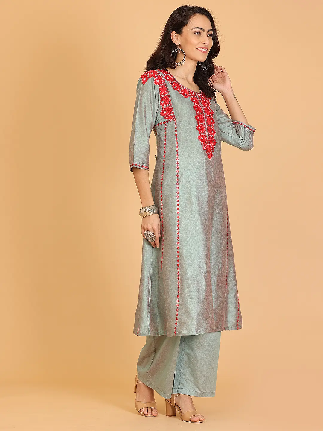 The true highlight of this set lies in its captivating embroidery. A vibrant, intricately stitched floral motif adorns the neckline, drawing the eye and adding a significant touch of personality. This detailed craftsmanship extends to the cuffs of the three-quarter sleeves and along the side seams of the kurta, creating a cohesive and visually appealing design. The contrasting red embroidery pops beautifully against the serene, light grey hue of the fabric, creating a look that is both eye-catching and refined.