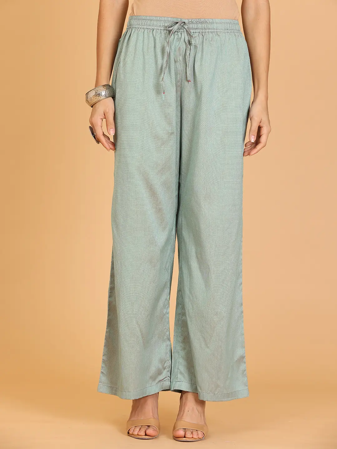 This kurta set is designed for the modern woman who values both style and versatility. The elegant A-line cut of the kurta provides a flattering silhouette that moves beautifully with you. Paired with matching, wide-leg palazzo pants, the set offers a complete and chic outfit. Dress it down with simple accessories for a sophisticated casual look, perfect for brunches or shopping trips. For festive occasions, elevate the ensemble with statement jewelry, elegant footwear, and a matching dupatta to create a stunning, festive ensemble that will turn heads.