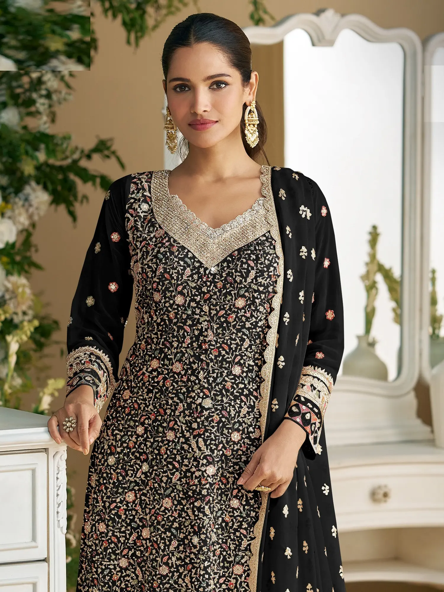 Heavy Thread Sequin Embroidery Chinon Palazzo Suit With Matching Dupatta For Elegant Festive Wedding And Party Wear