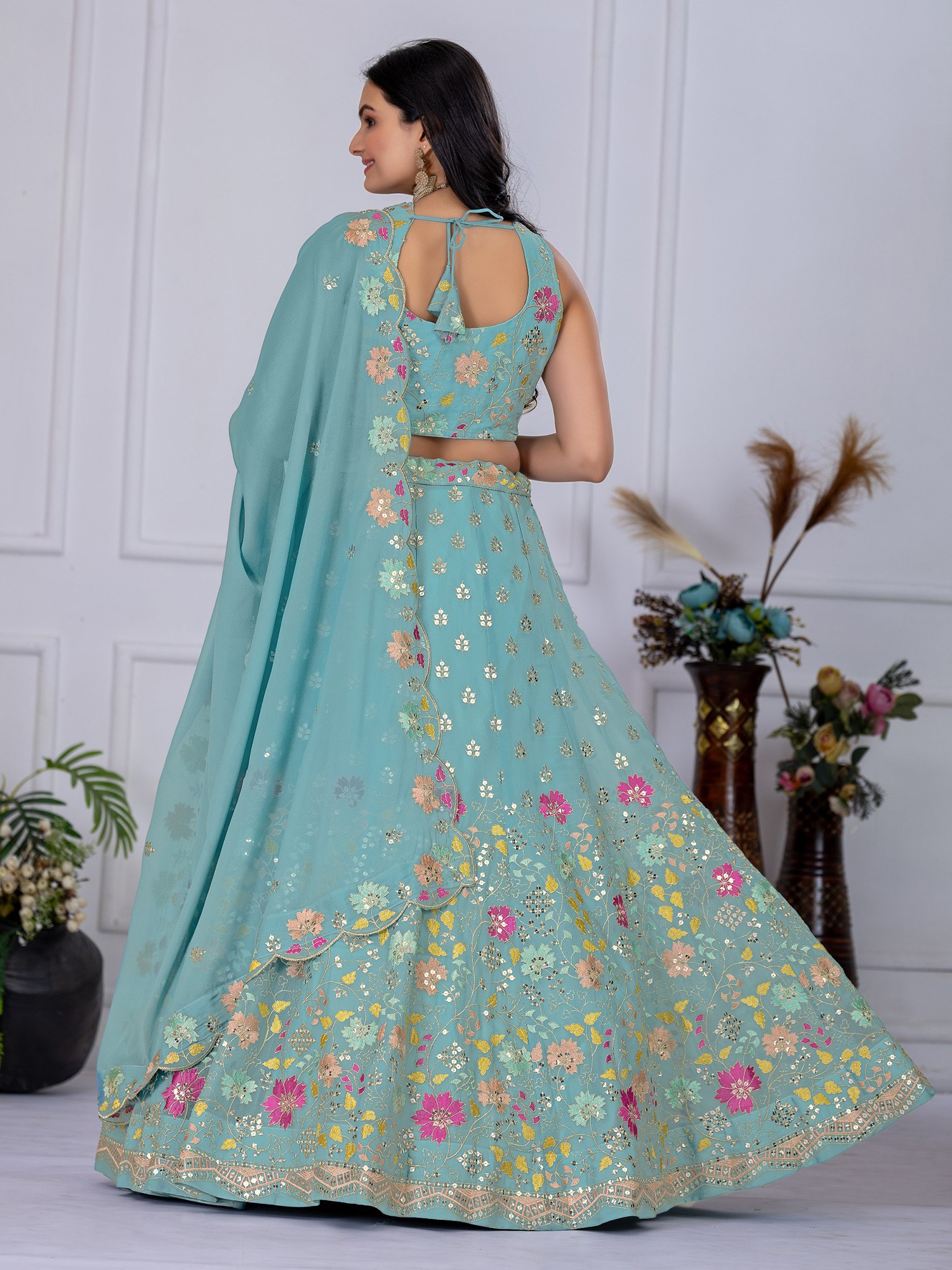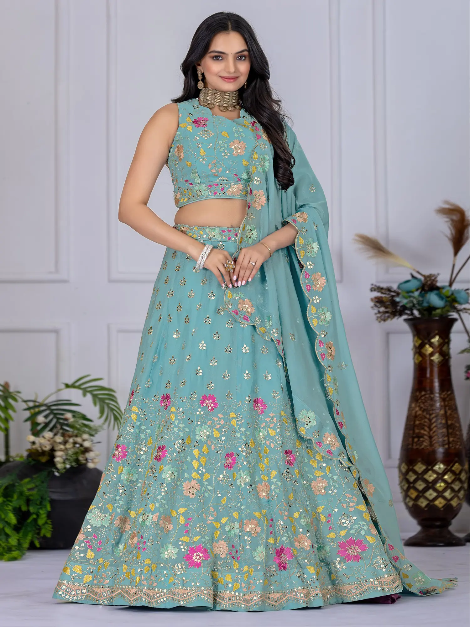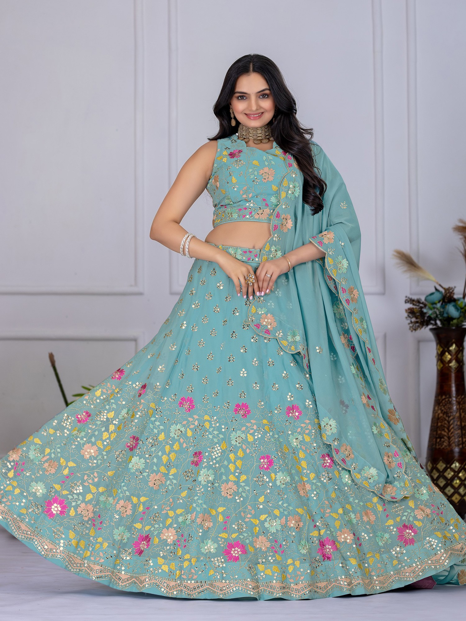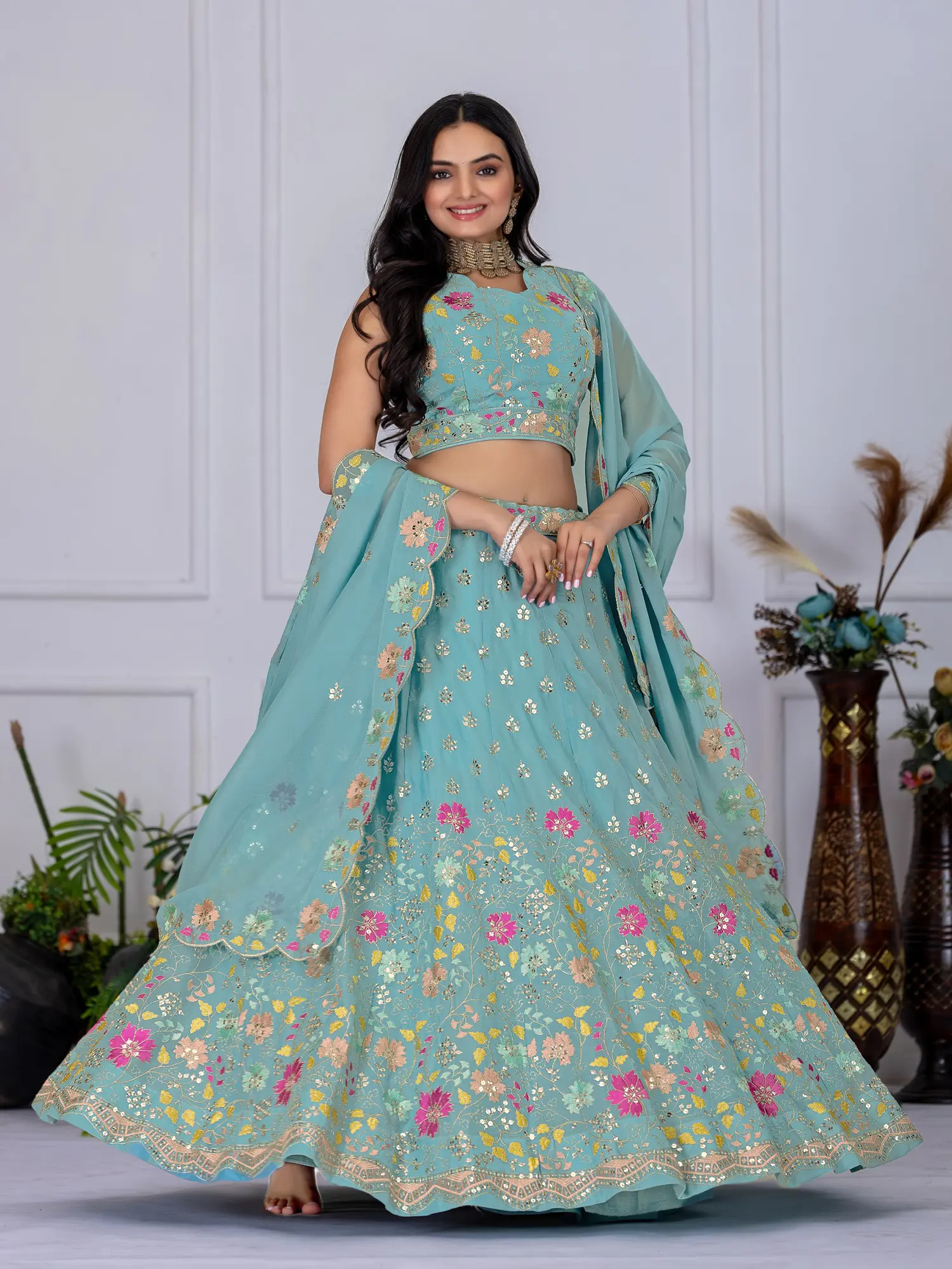 Step into a world of sophisticated charm and undeniable grace with this exquisite Firozi party wear lehenga choli set. Crafted from a delicate Faux Georgette fabric, this ensemble promises a flowy silhouette that drapes beautifully, ensuring you move with an effortless elegance that captivates. The serene Firozi hue serves as a perfect canvas for the intricate and vibrant embroidery that adorns the entire outfit, making it a true masterpiece of traditional artistry and contemporary design.