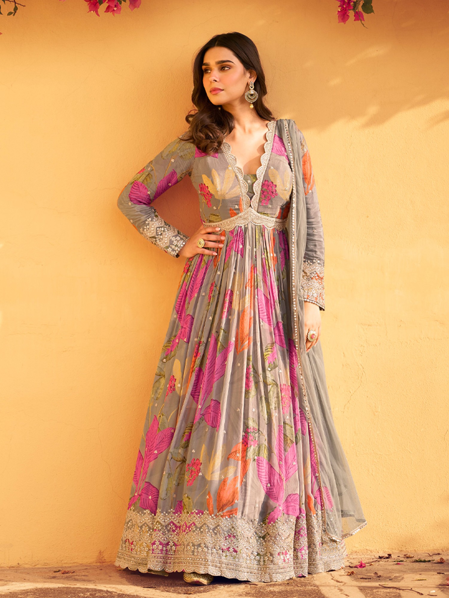 Georgette Floral Motif Anarkali Style Flared Gown with All-Over Metalic Foil Work