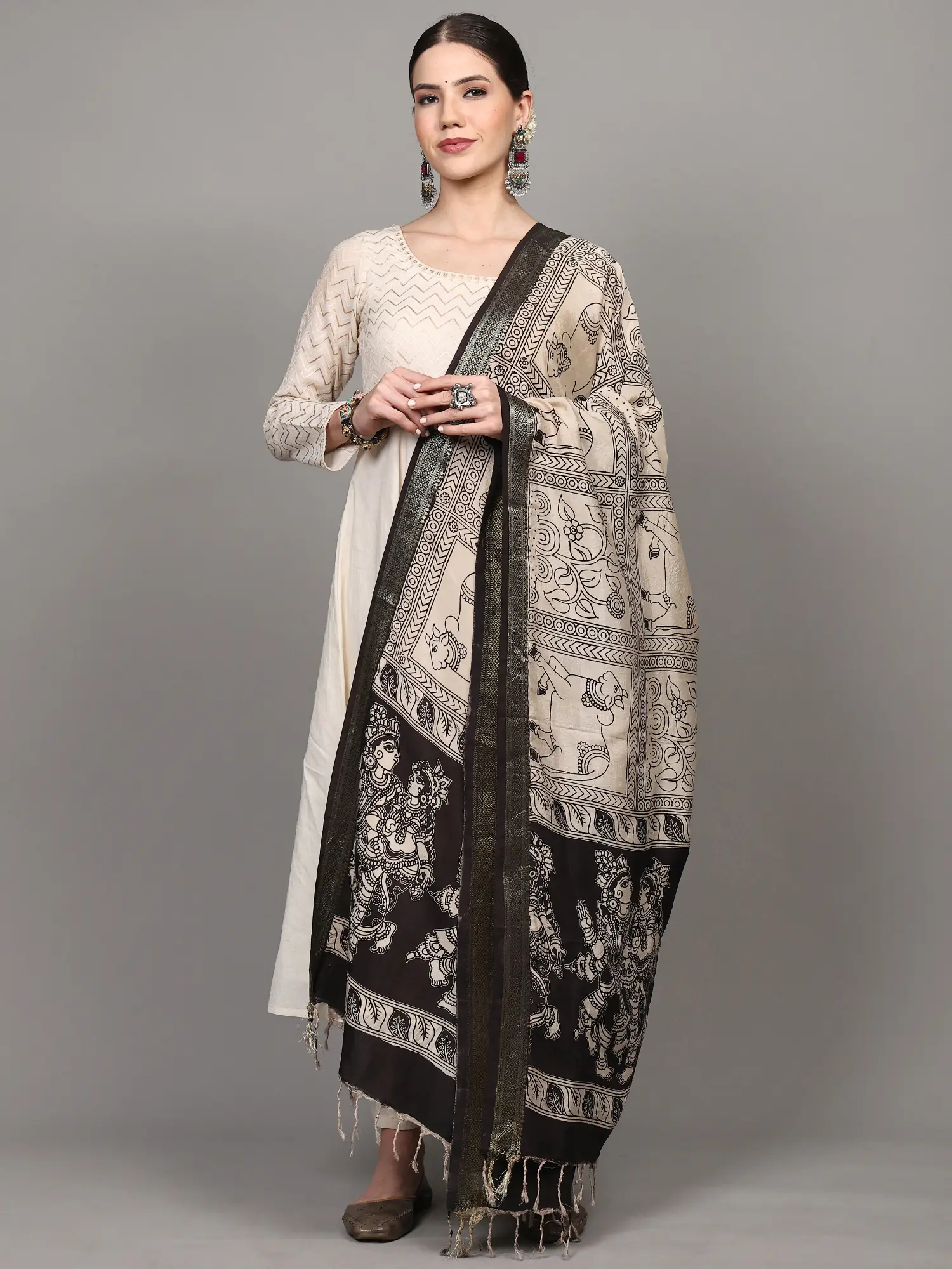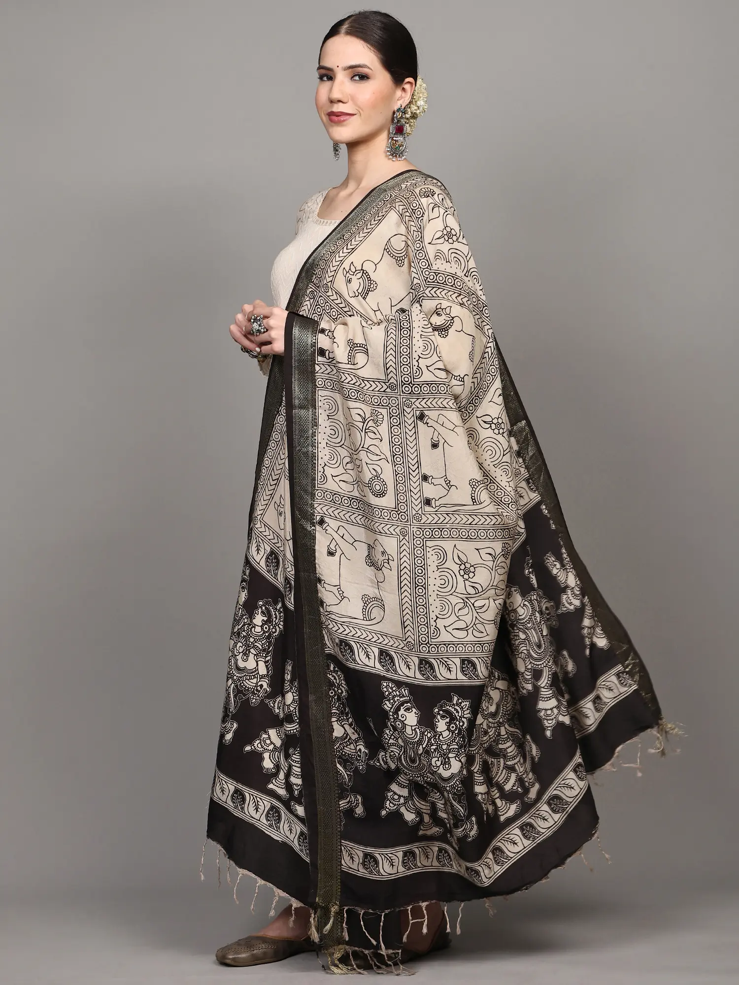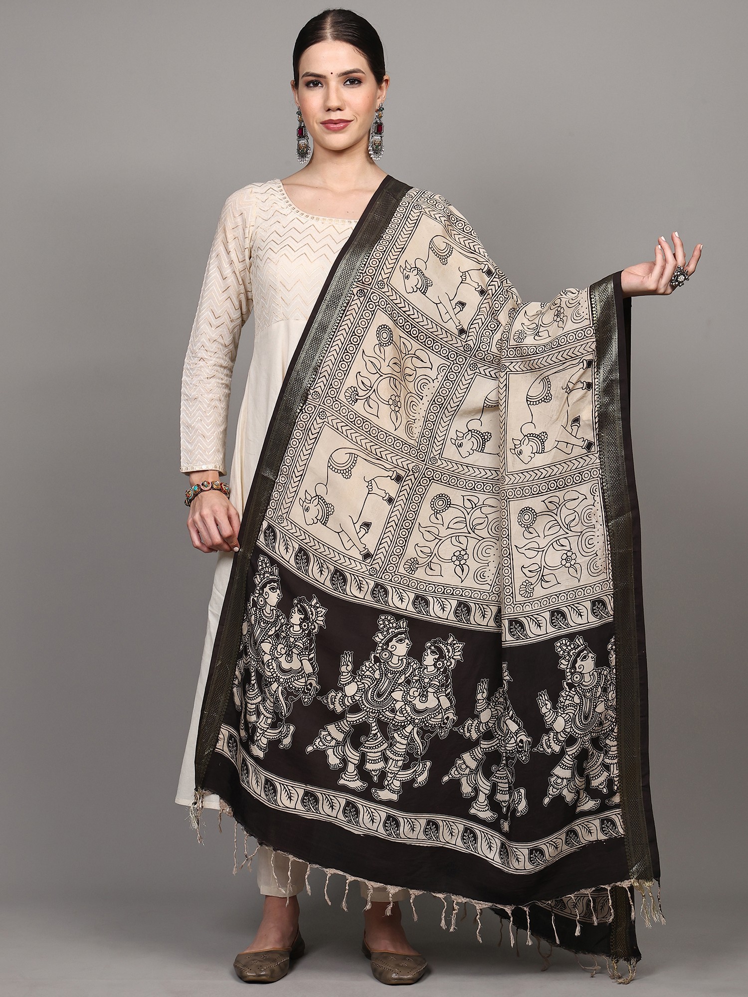 Black-Ink Floral Printed Kalamkari Dupatta from Telangana with Zari Woven Border and Dancing Apsaras