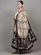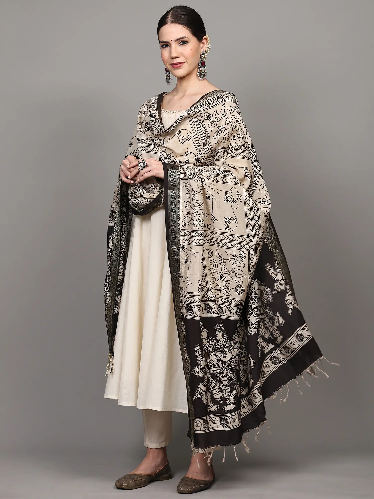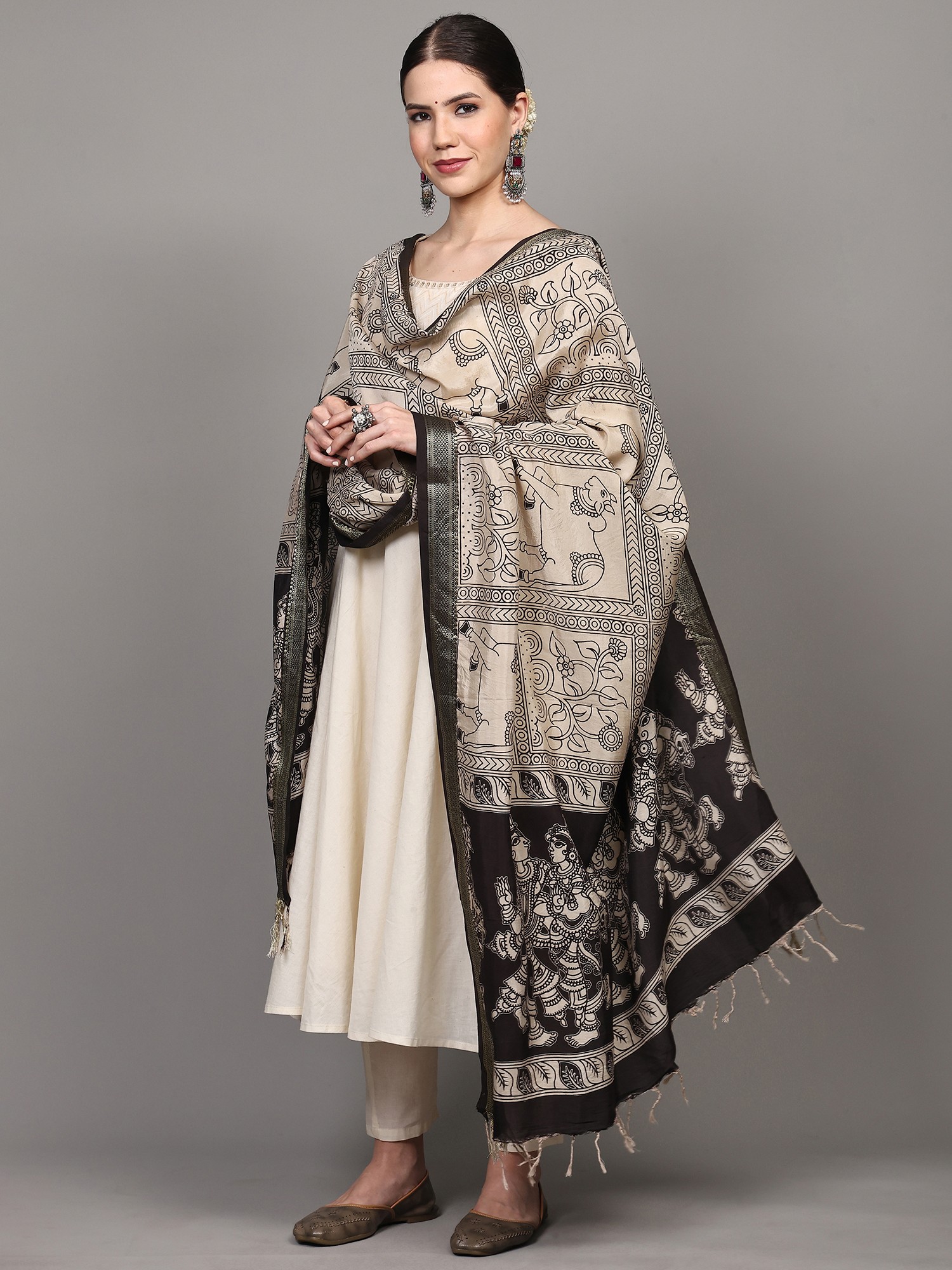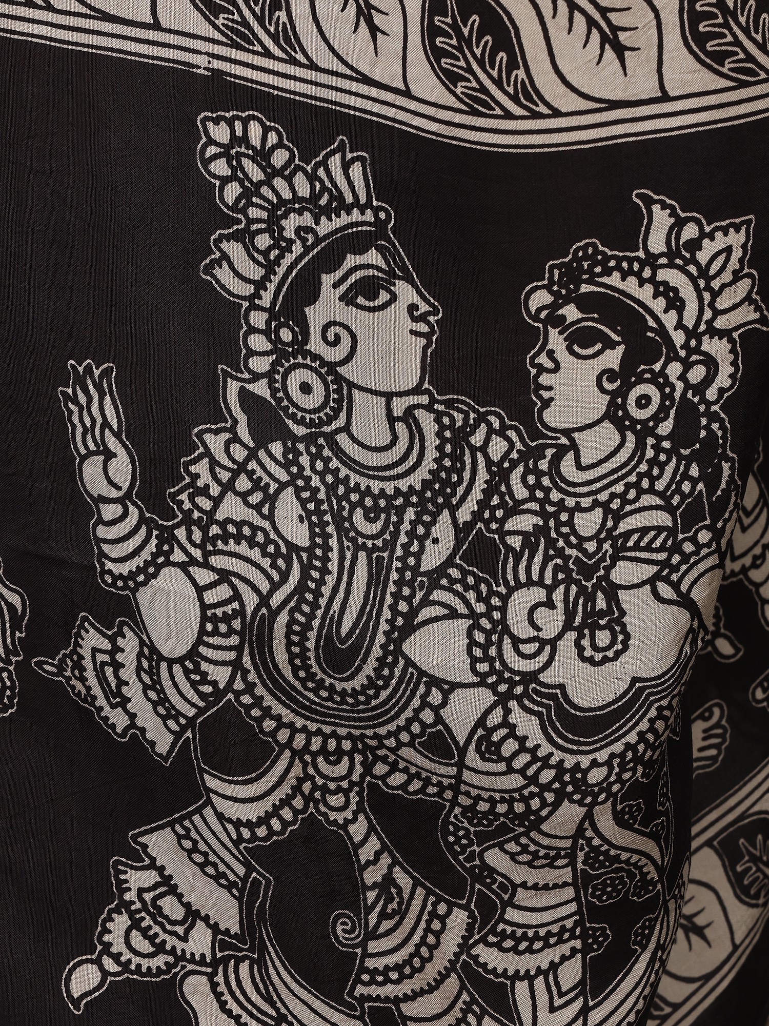 Black-Ink Floral Printed Kalamkari Dupatta from Telangana with Zari Woven Border and Dancing Apsaras