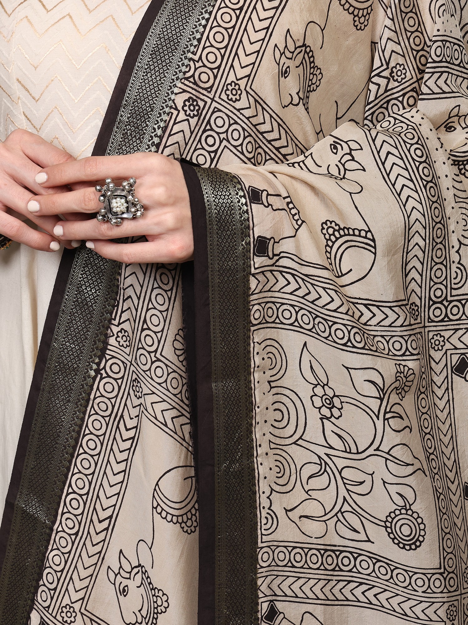 Kalamkari Dupatta with Zari Border and Hand-Painted Lotuses