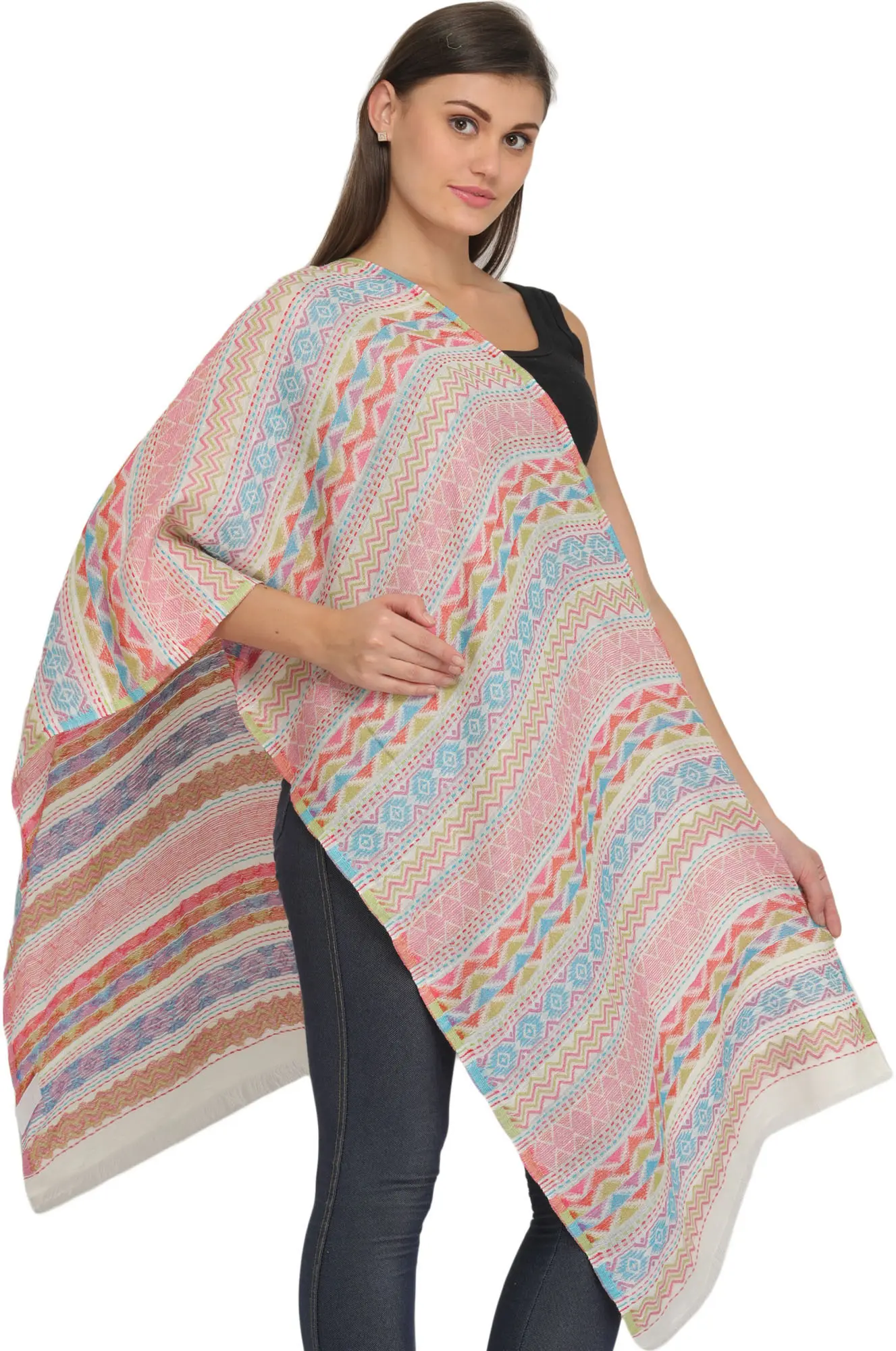 Add a touch of free-spirited artistry to your wardrobe with this exquisite scarf, featuring a captivating Kilim-inspired weave. The intricate geometric patterns, rendered in a delightful palette of soft pastels and earthy tones, evoke the rich heritage of traditional textile arts. This versatile accessory is perfect for layering, offering both style and a gentle warmth that makes it ideal for transitional weather.