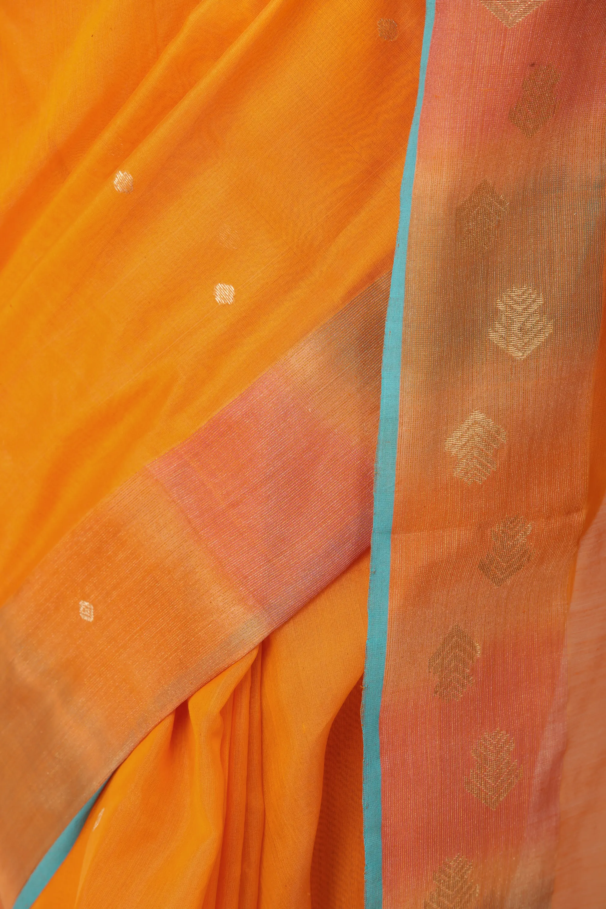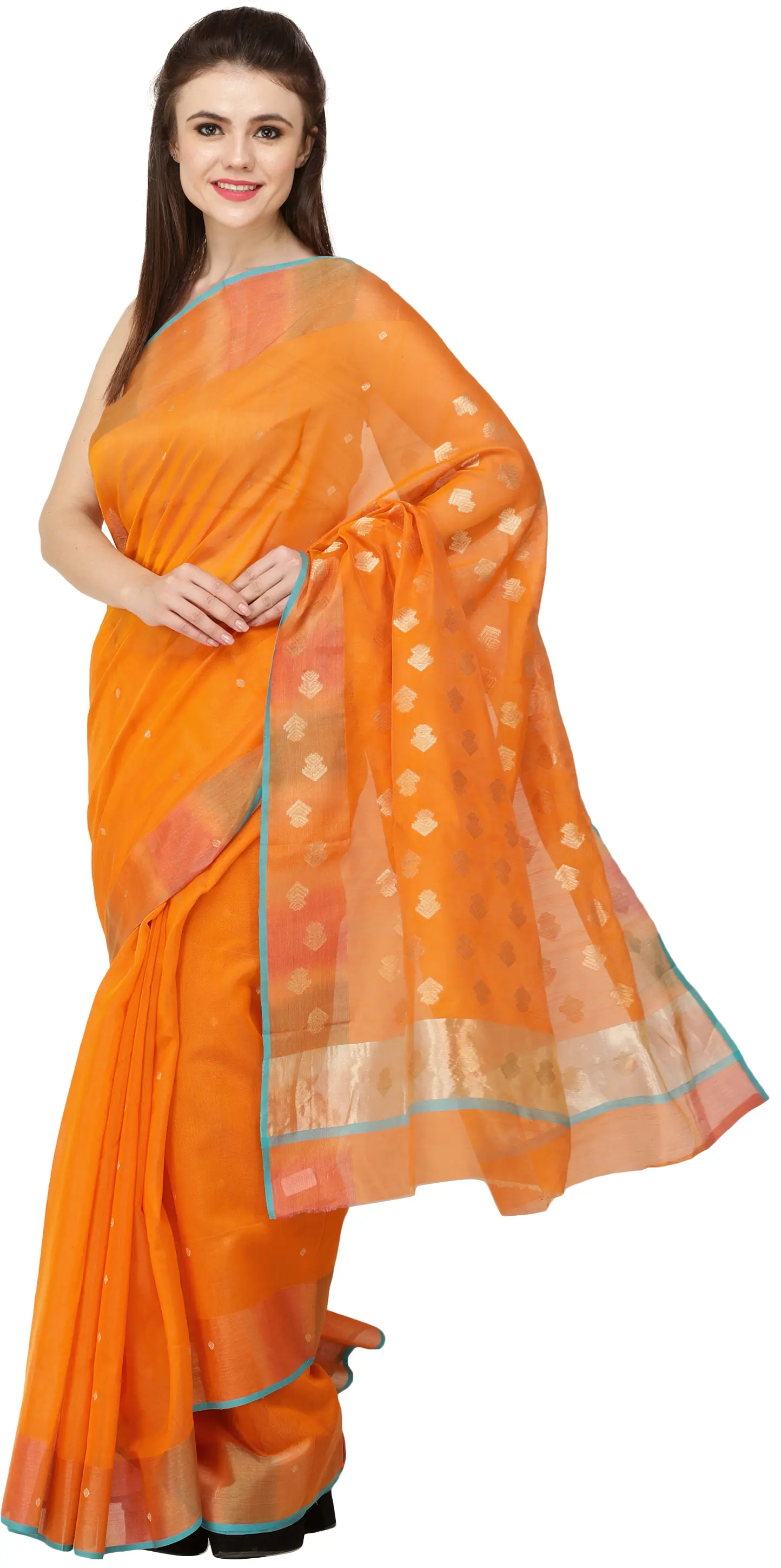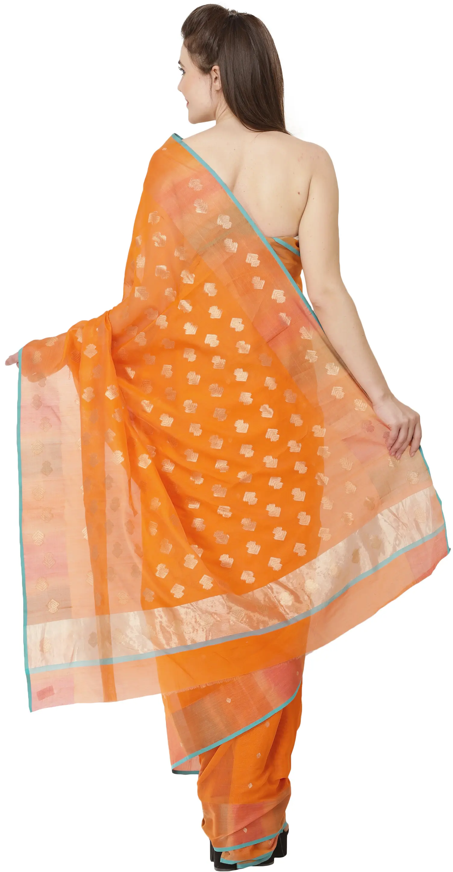 The Sun-Orange Chanderi Saree is a radiant masterpiece, adorned with intricate butis and a delicate contrasting border that enchants the eye. Its bright orange hue, symbolic of festivity, adds vibrancy to any occasion. Chanderi's inherent allure, with its shimmering luster, ensures that you become the center of the universe wherever you go. This saree isn't just a piece of fabric; it's a celebration of color and craftsmanship. When draped, it weaves together tradition and contemporary elegance, making it an indispensable addition to your wardrobe, ensuring you shine brightly at every gathering or event.