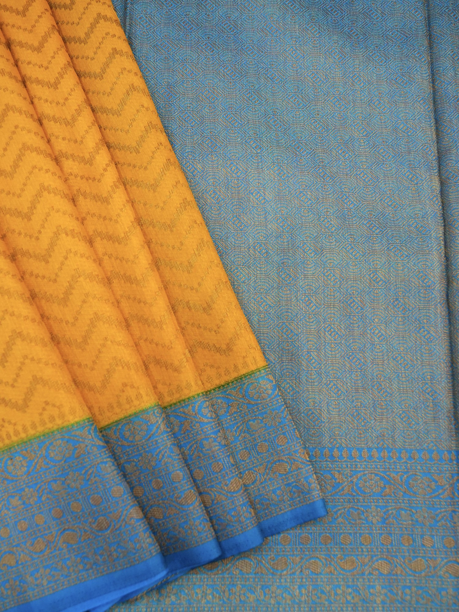It is time to update your traditional Indian wardrobe with this gorgeous Tanchoi silk Banarasi Saree. The combination of yellow and blue on the saree is exquisite, and so is the balance of modern Chevron pattern and traditional Phool Bel or floral bel design on the border.
