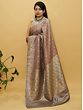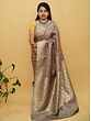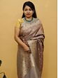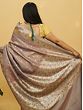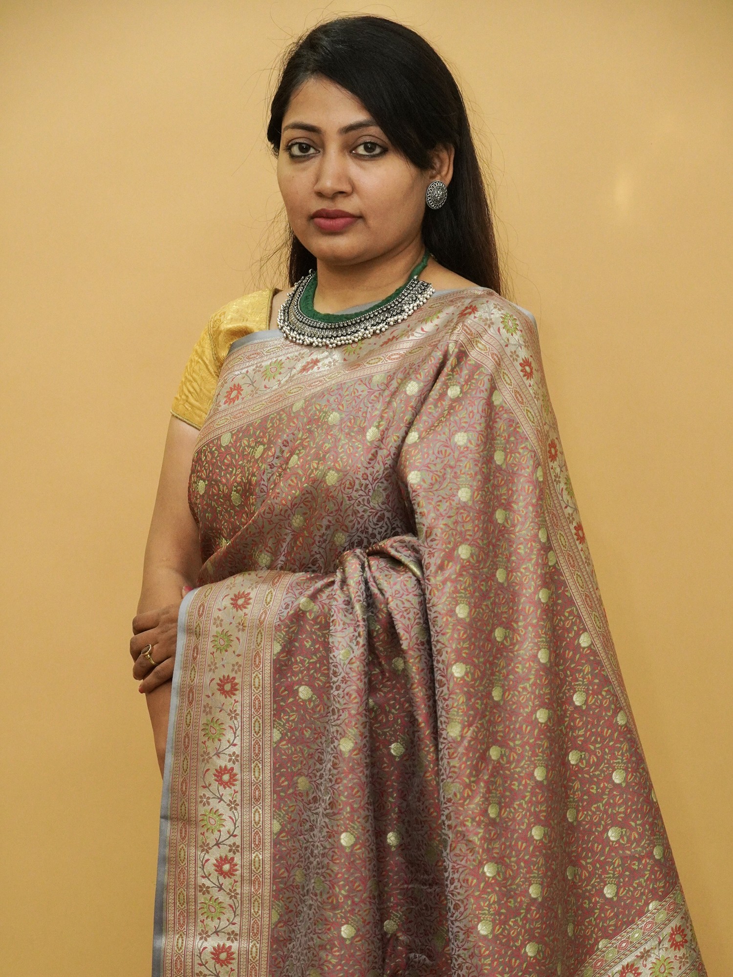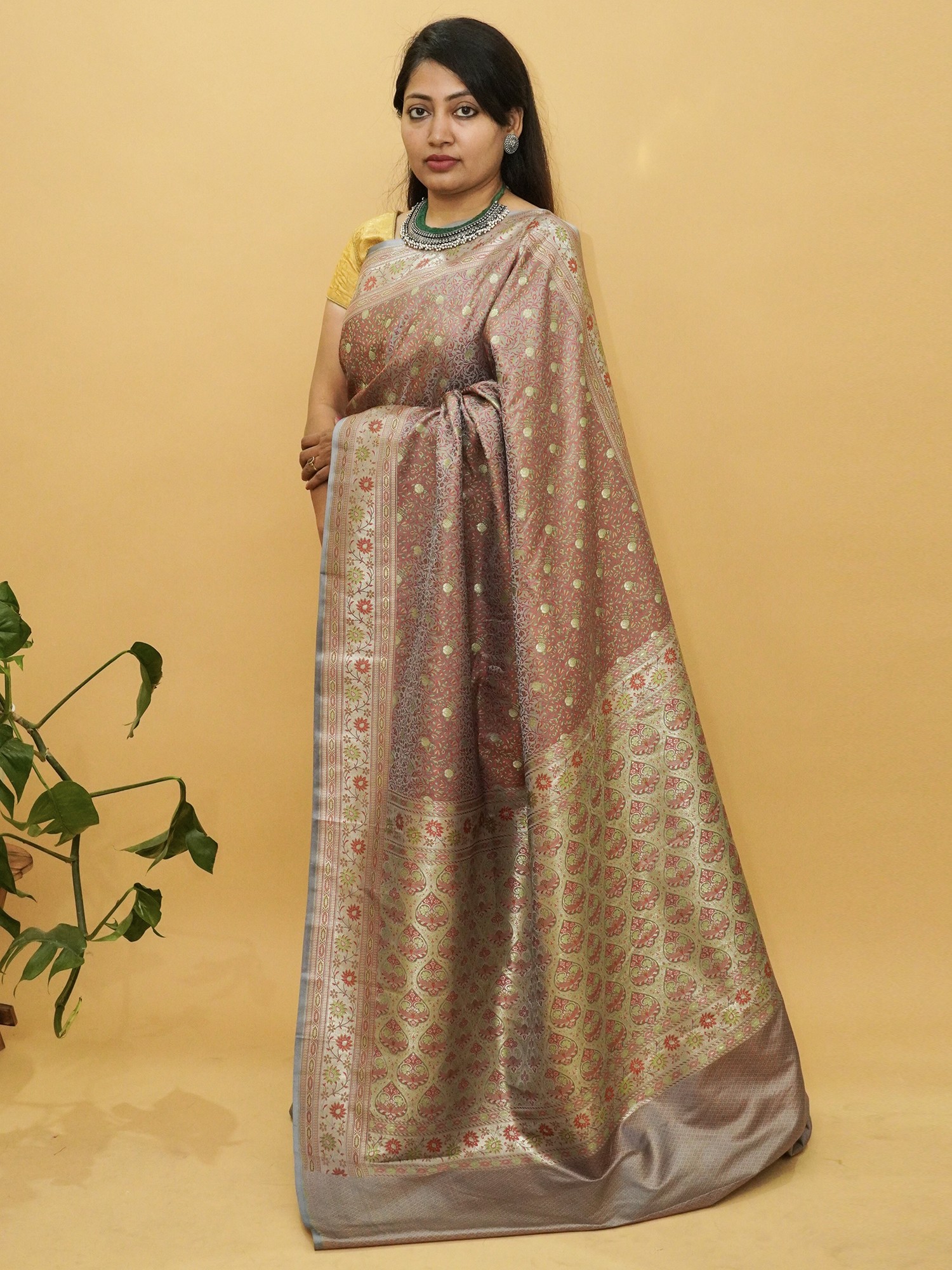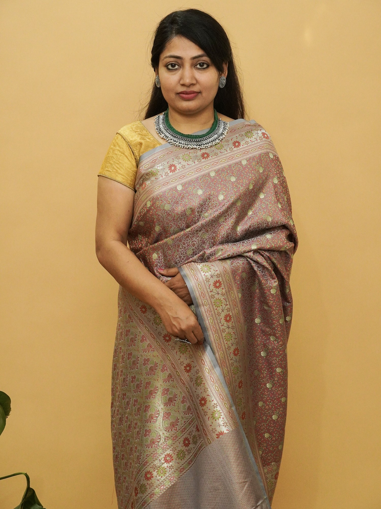 The brocade art of Tanchui or Tanchoi has traveled from China to India, where it was nurtured by the artistic sense of Gujarat weavers who migrated to Banaras and brought the technique of Tanchoi with them. The exquisite appeal of Tanchoi silk for a wedding Banarasi saree or for an ensemble for a special occasion has always been on a rise in the Indian traditional wear market. The Tanchui saree here is covered in Meenakari patterns inspired by the enameling art of the Mughals, who were the greatest patrons of the Banarasi silk-weaving industry in their time. The saree showcases the beauty of Tanchoi weave, whose vibrant silk threads unite to reveal amazing floral and geometrical designs on the border and the pallu.