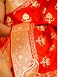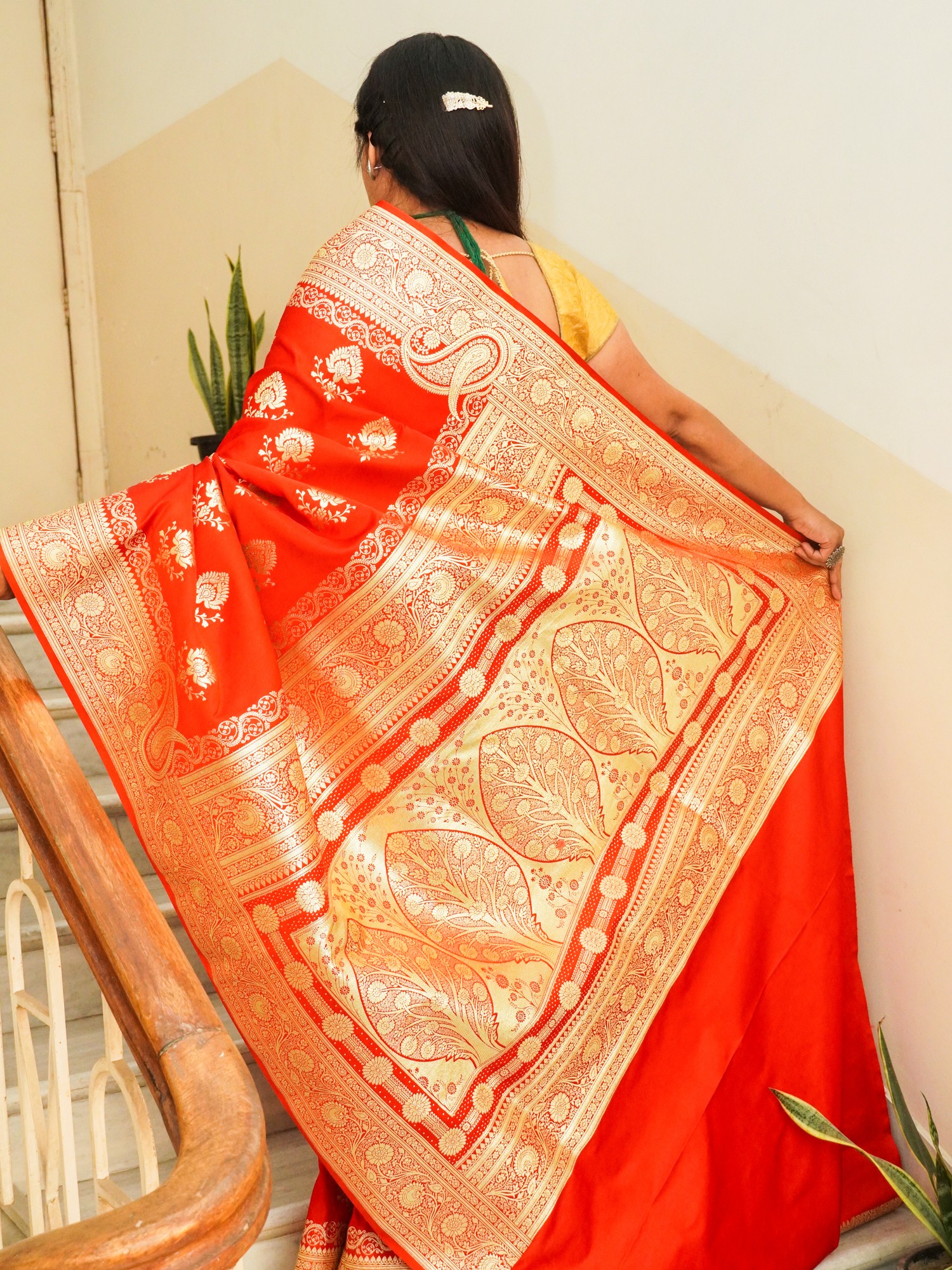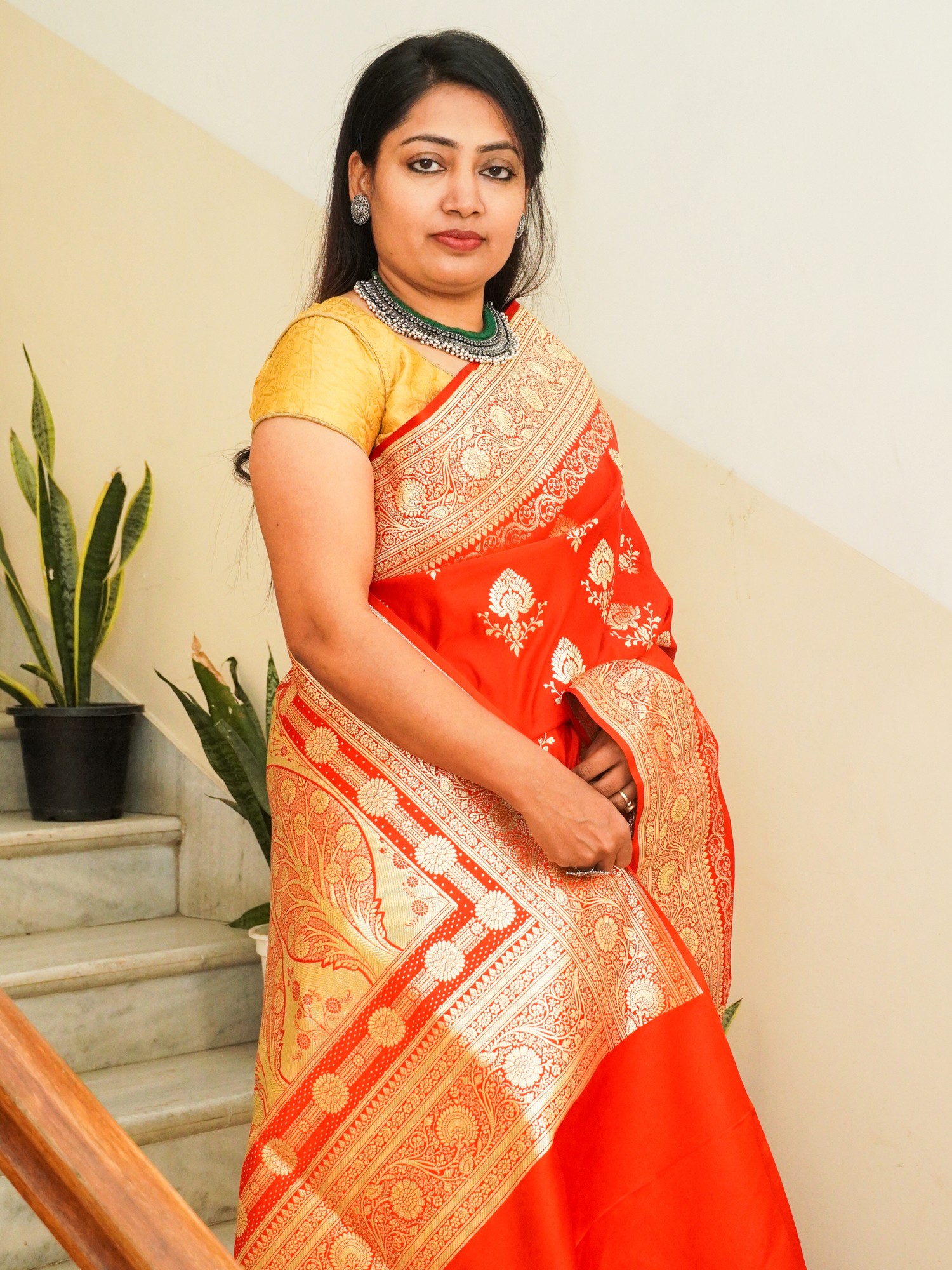 Nature in full bloom adorns the entirety of the saree. On the body, we see large Buta motifs along with the paisley in the corner or Kona, which earned this element the name of Koniya in the Banarasi Silk Saree.