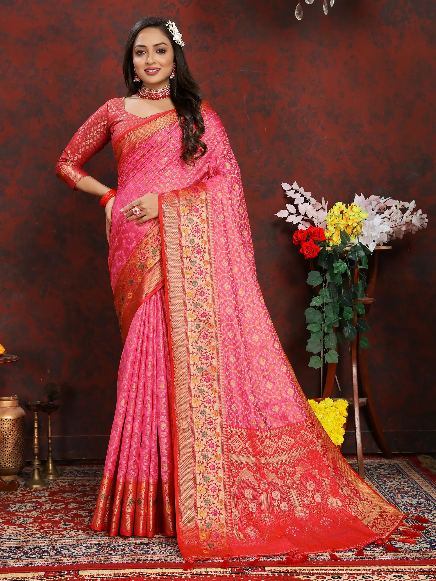 Floral Woven Banarasi Silk Saree with Contrast Border & Tassels Pallu