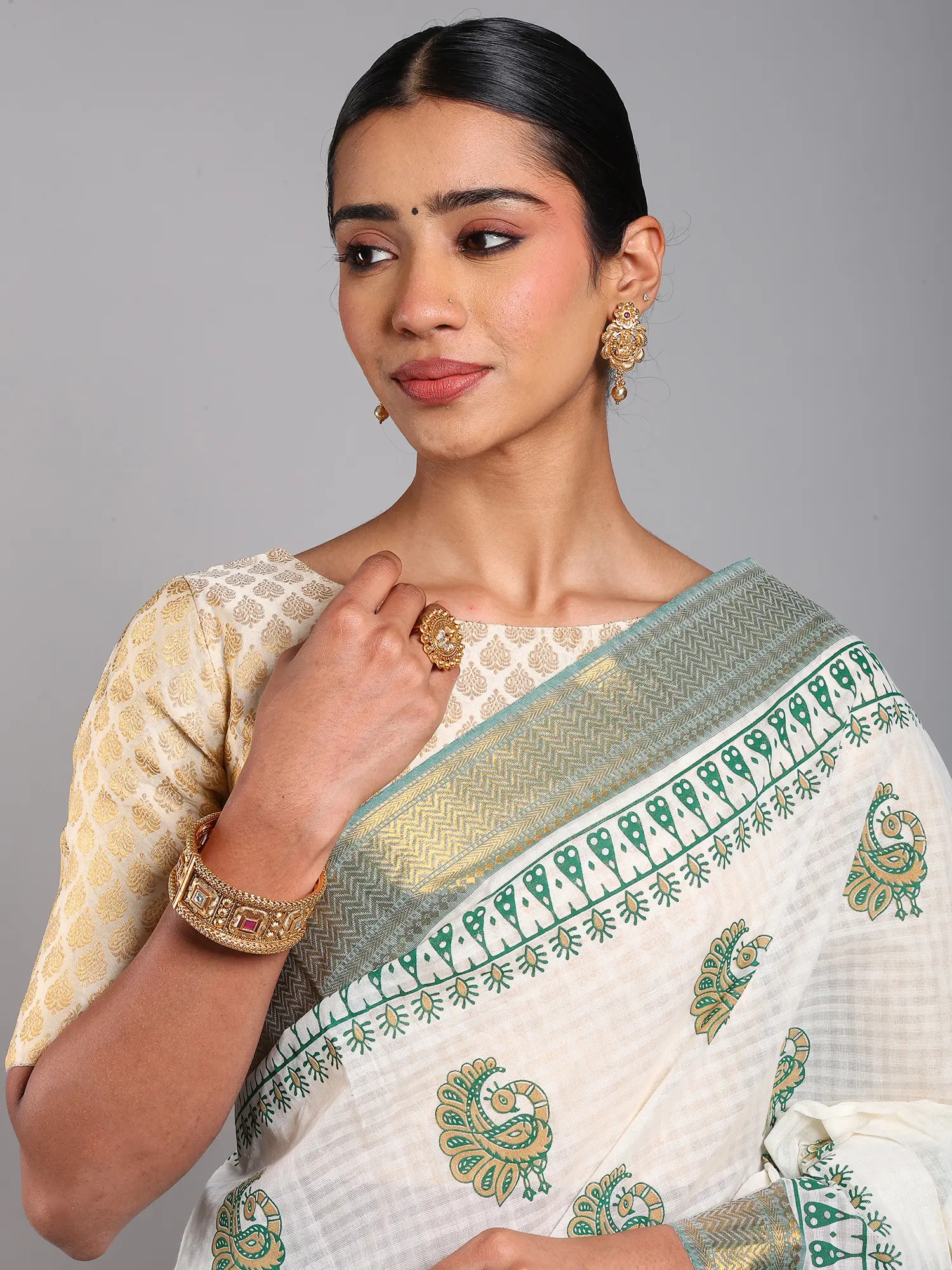 Dabu Block Printed Forest Green Saree with Golden Phool Bail Border