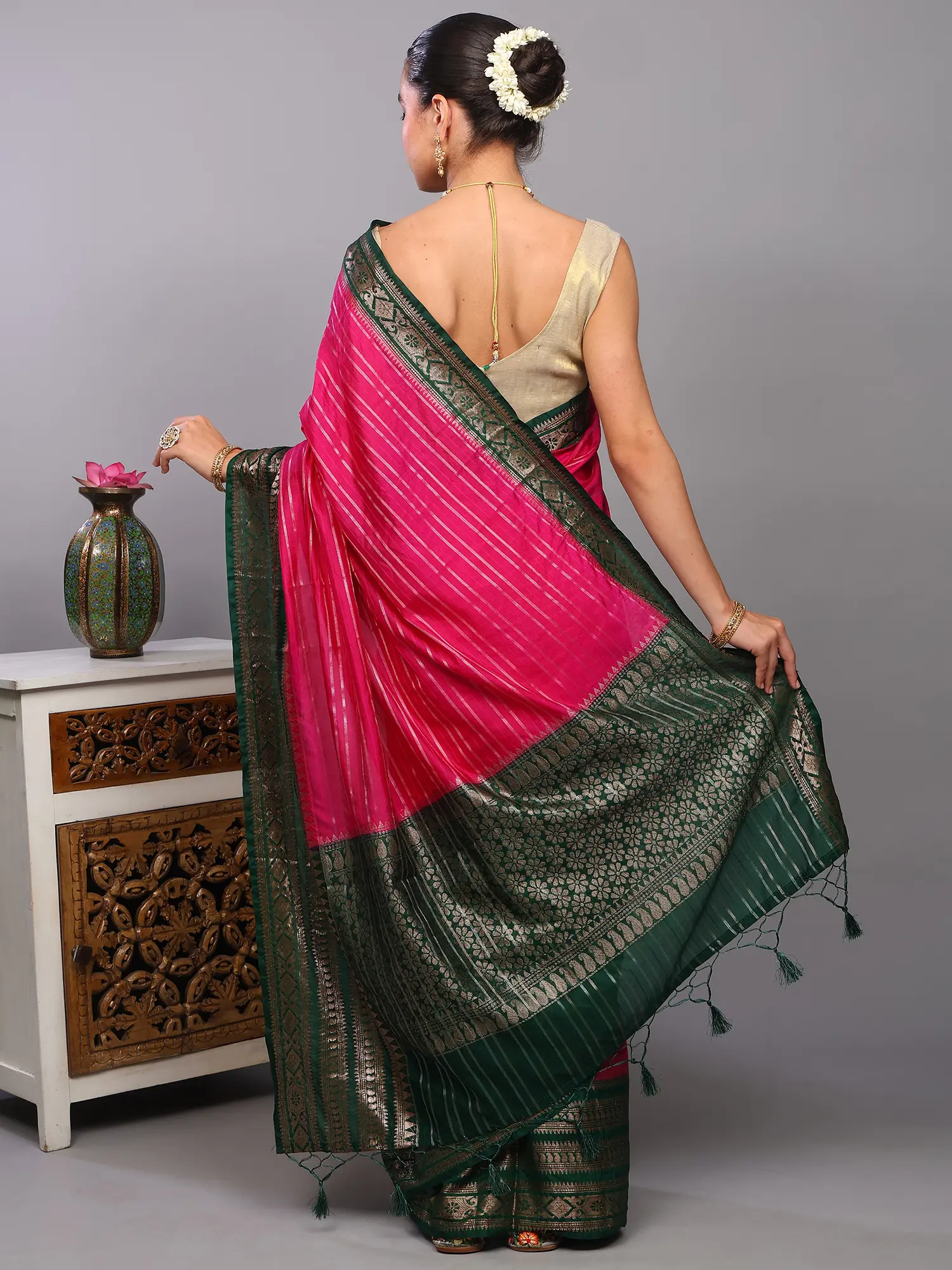 Temple Border Banarasi Saree with All-Over Stripes Weave and Zari work Wide Border-Anchal
