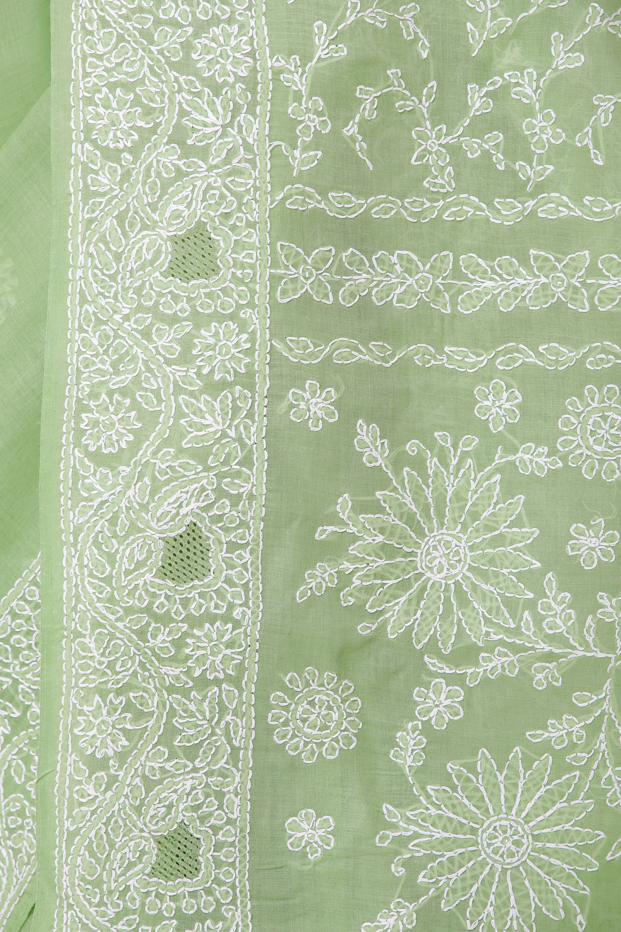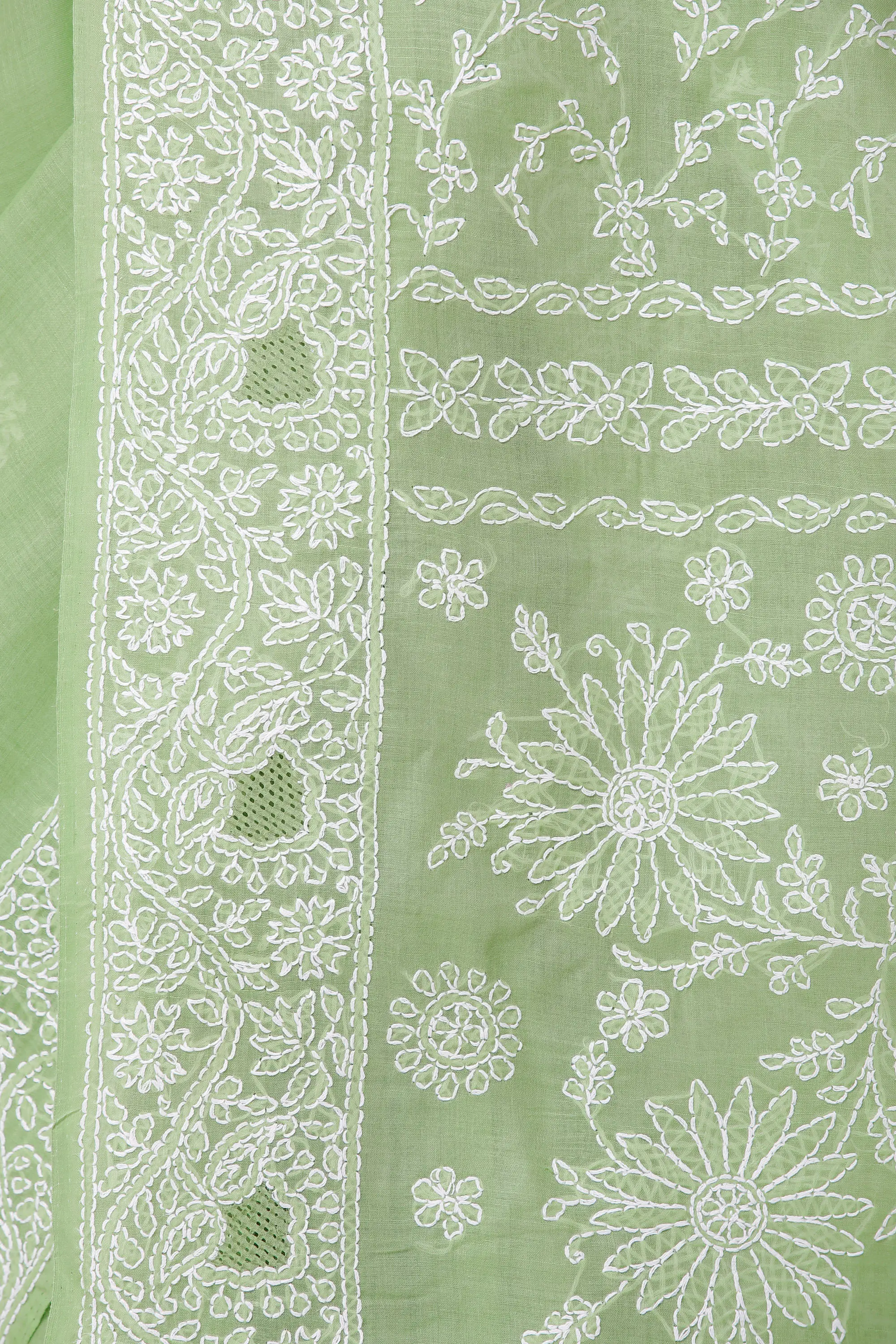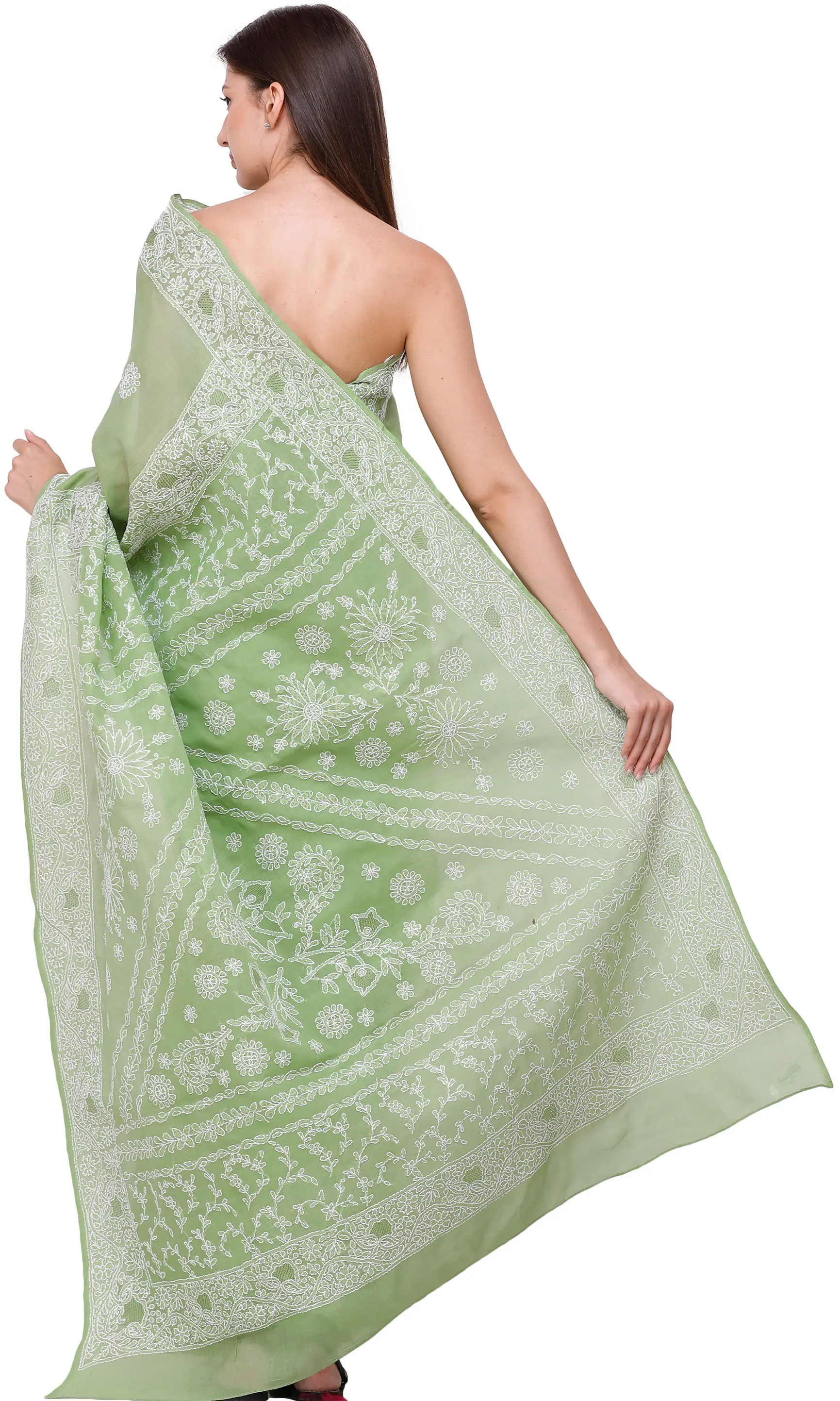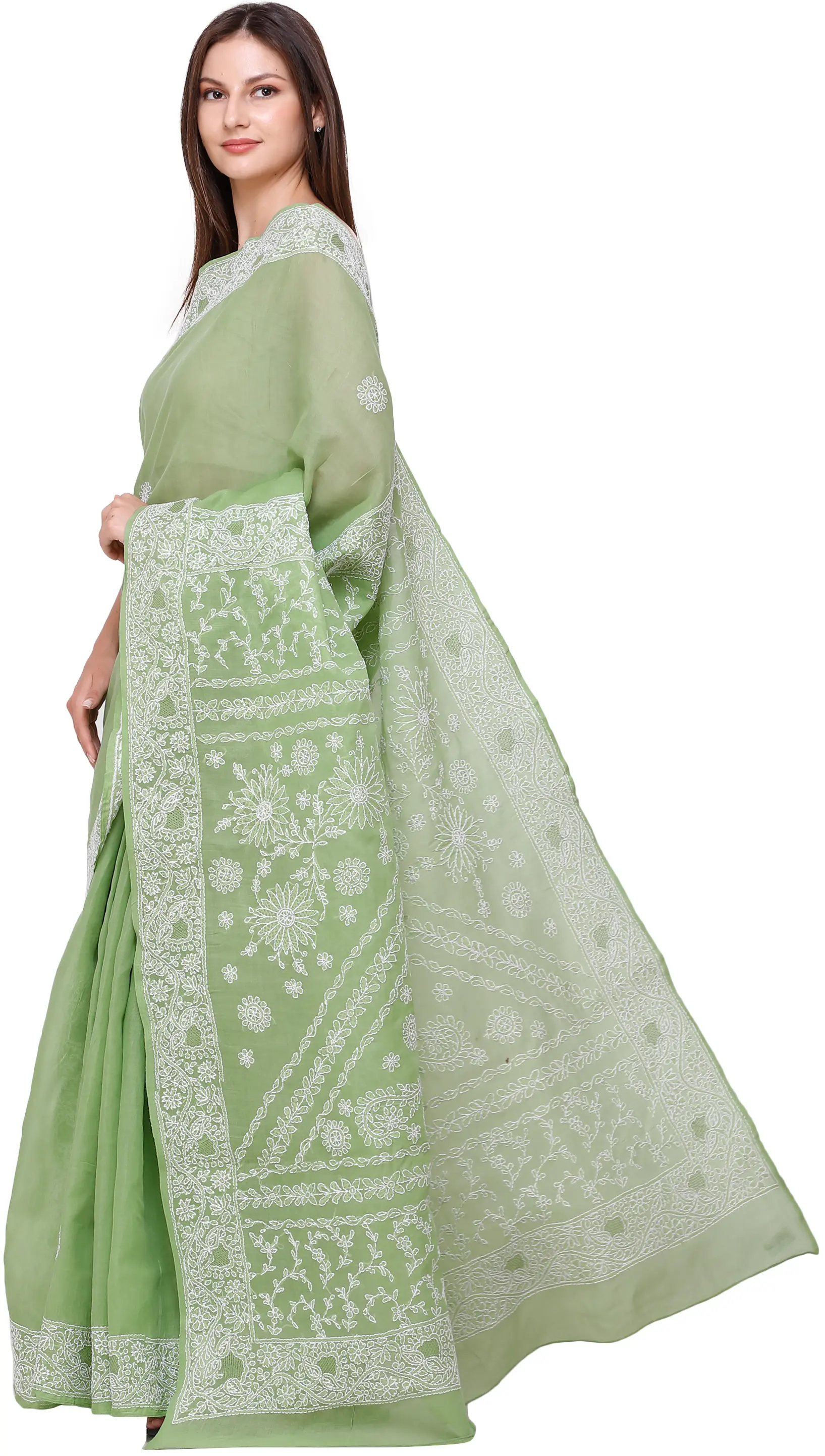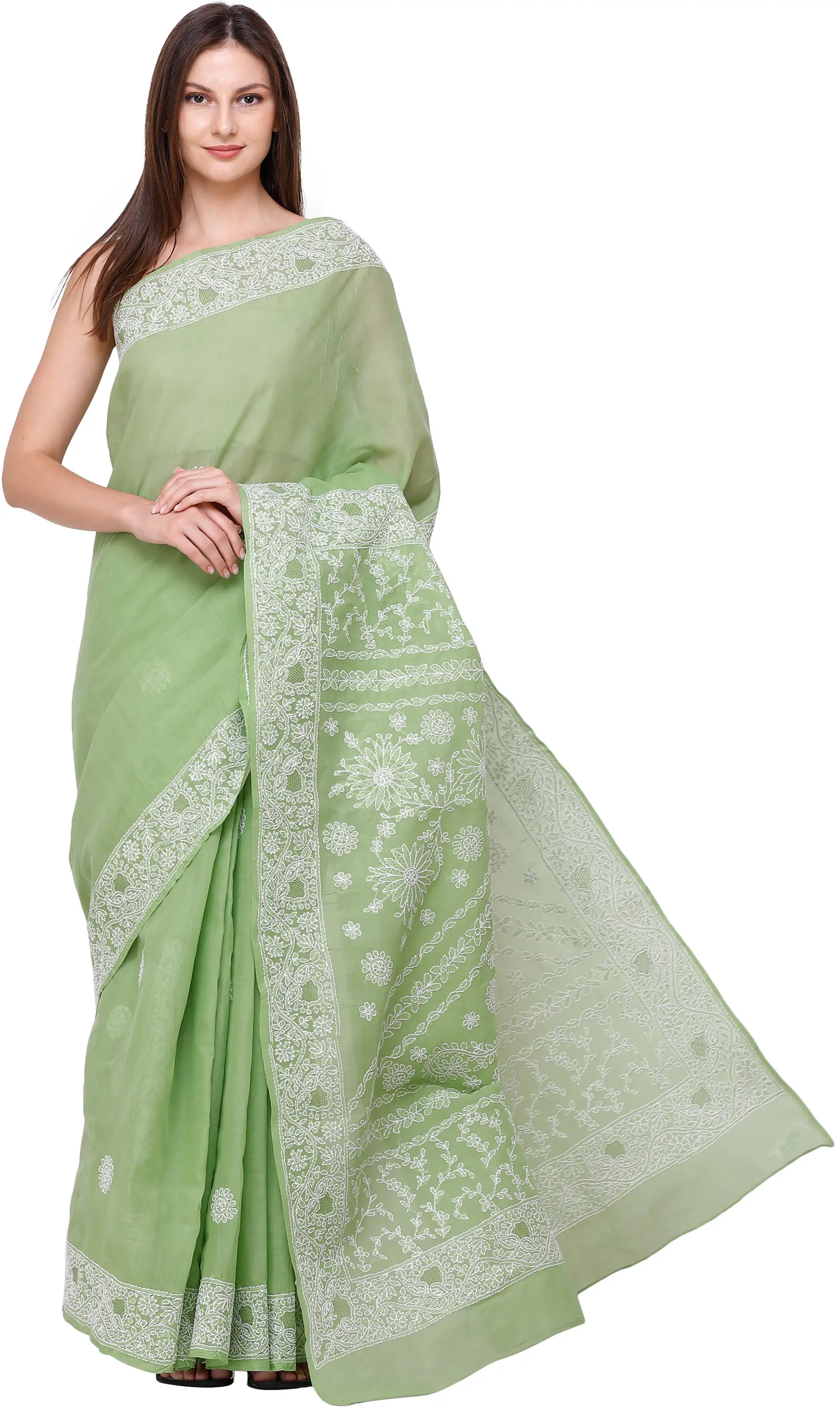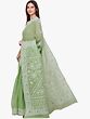 Discover the epitome of traditional Indian craftsmanship with this exquisite Lukhnavi Chikan saree. Crafted from pure, breathable cotton, this saree offers unparalleled comfort and a graceful drape, making it a perfect choice for any occasion, from festive gatherings to elegant evening events. The delicate light green hue evokes a sense of serenity and natural beauty, while the intricate white embroidery transforms it into a wearable work of art.