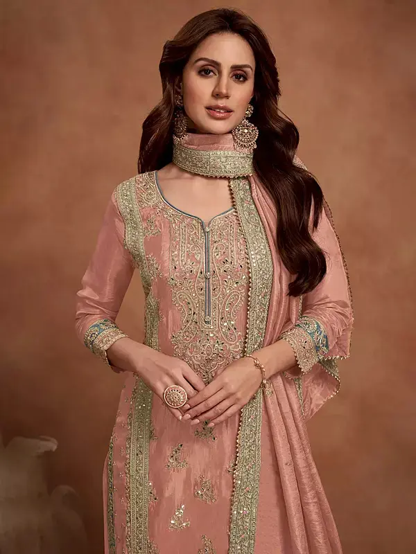 You'll appreciate the rich, muted blush hue, a shade that exudes warmth and understated opulence. The silhouette is designed to flatter, with a flowing kurta and complementary bottoms that offer both comfort and a graceful movement. The detailed embroidery flows from the neckline across the bodice, extending to the borders of the sleeves and the hem, each motif a miniature work of art that draws the eye and invites admiration. The accompanying dupatta, generously sized and equally adorned, completes the ensemble with a flourish.