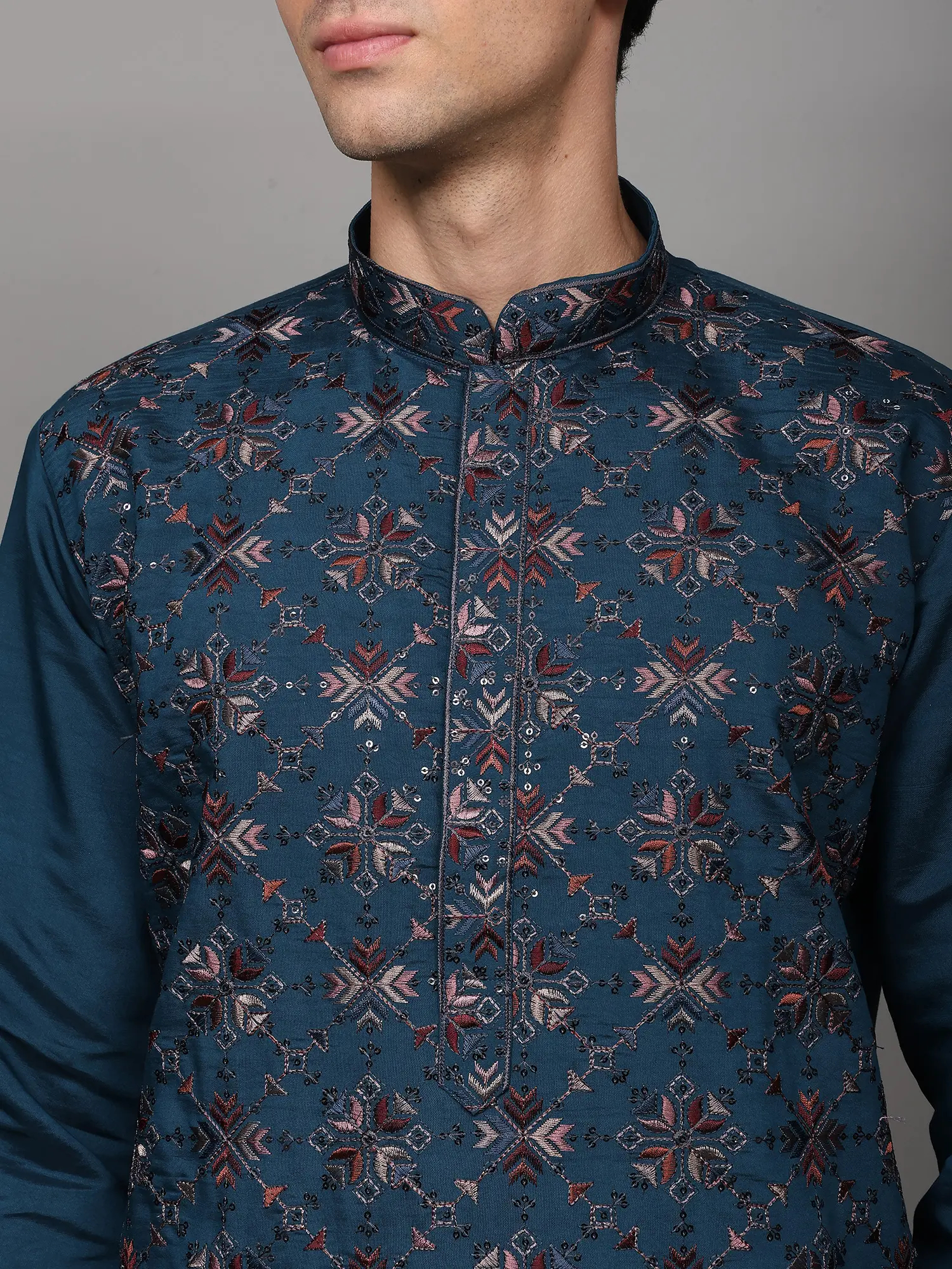Metallic-Thread Embroidered Kurta Pajama with Floral Fauna Motifs and Sequins work