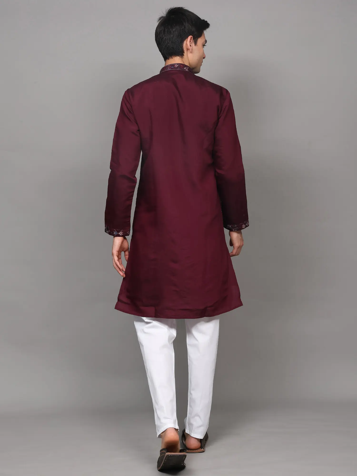 Step into a realm of refined style with this meticulously crafted kurta pajama set. Designed for those who appreciate the finer details, this ensemble blends traditional aesthetics with contemporary sensibilities, making it a perfect choice for weddings, festive celebrations, or any special occasion where you want to make a statement. The rich hues and intricate detailing create a look that is both sophisticated and memorable.