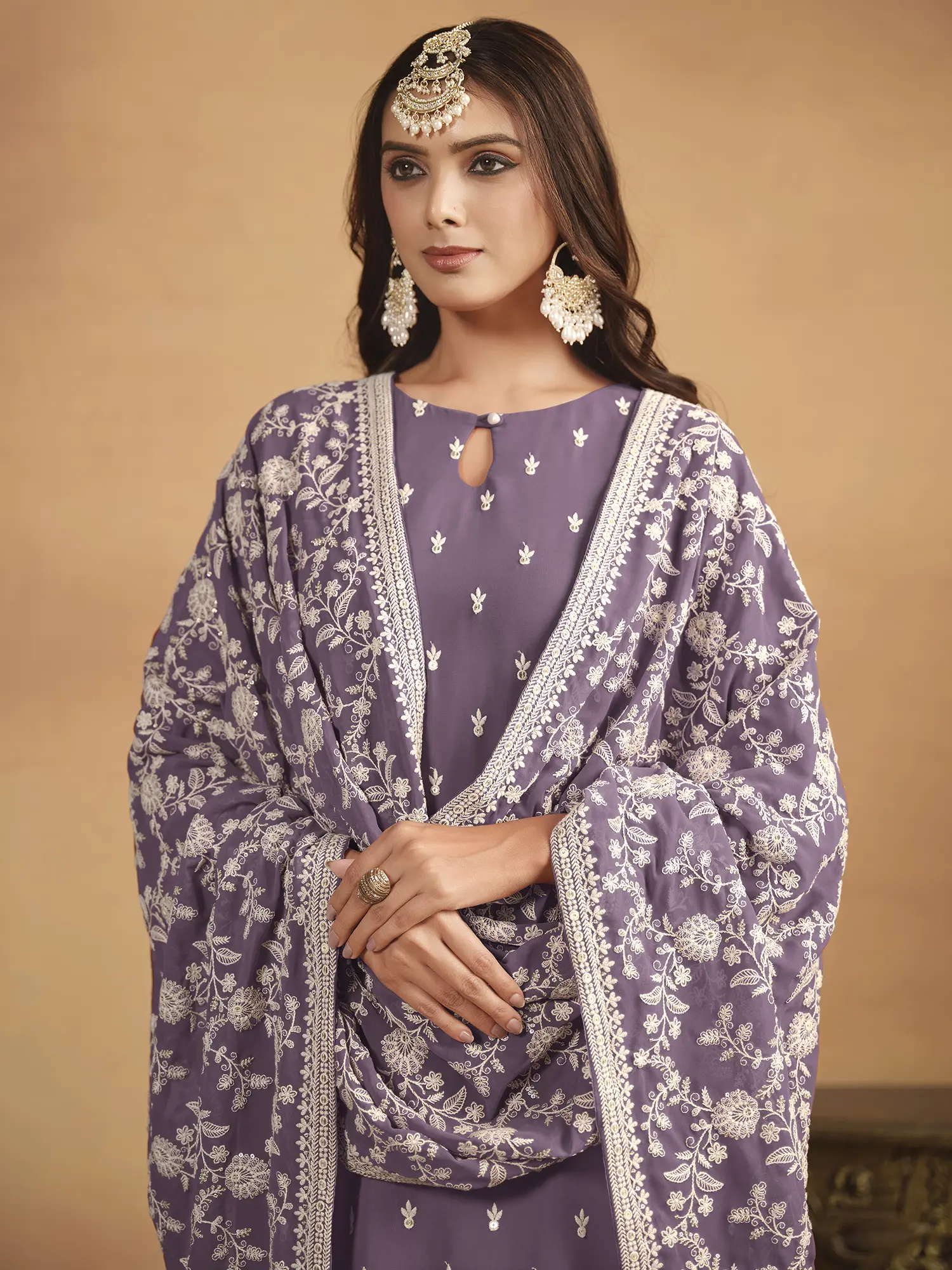 Muted colors and intricate embroidery create a festive wear salwar suit that is stylishly comfortable. The straight-cut kurta offers a graceful fit, covered in butis all over.