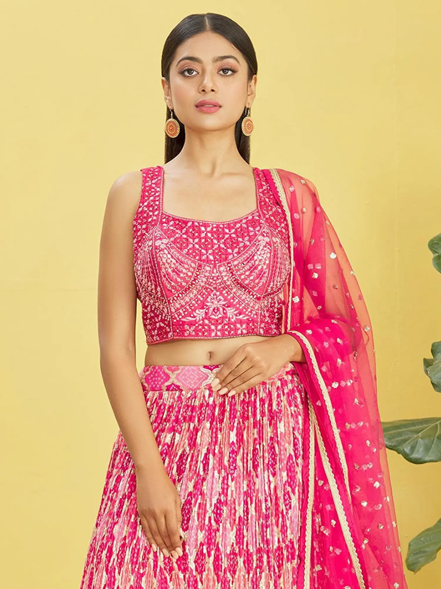 Step into a world of unparalleled elegance and festive fervor with this breathtaking Lehenga Choli set. Crafted from the finest Chinon fabric, this ensemble is designed to make you the cynosure of all eyes at any celebration, be it a wedding, a festival, or a grand soiree. The vibrant color palette, dominated by rich pinks and accented with shimmering gold, evokes a sense of joy and opulence, perfectly suited for joyous occasions.