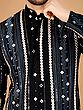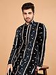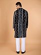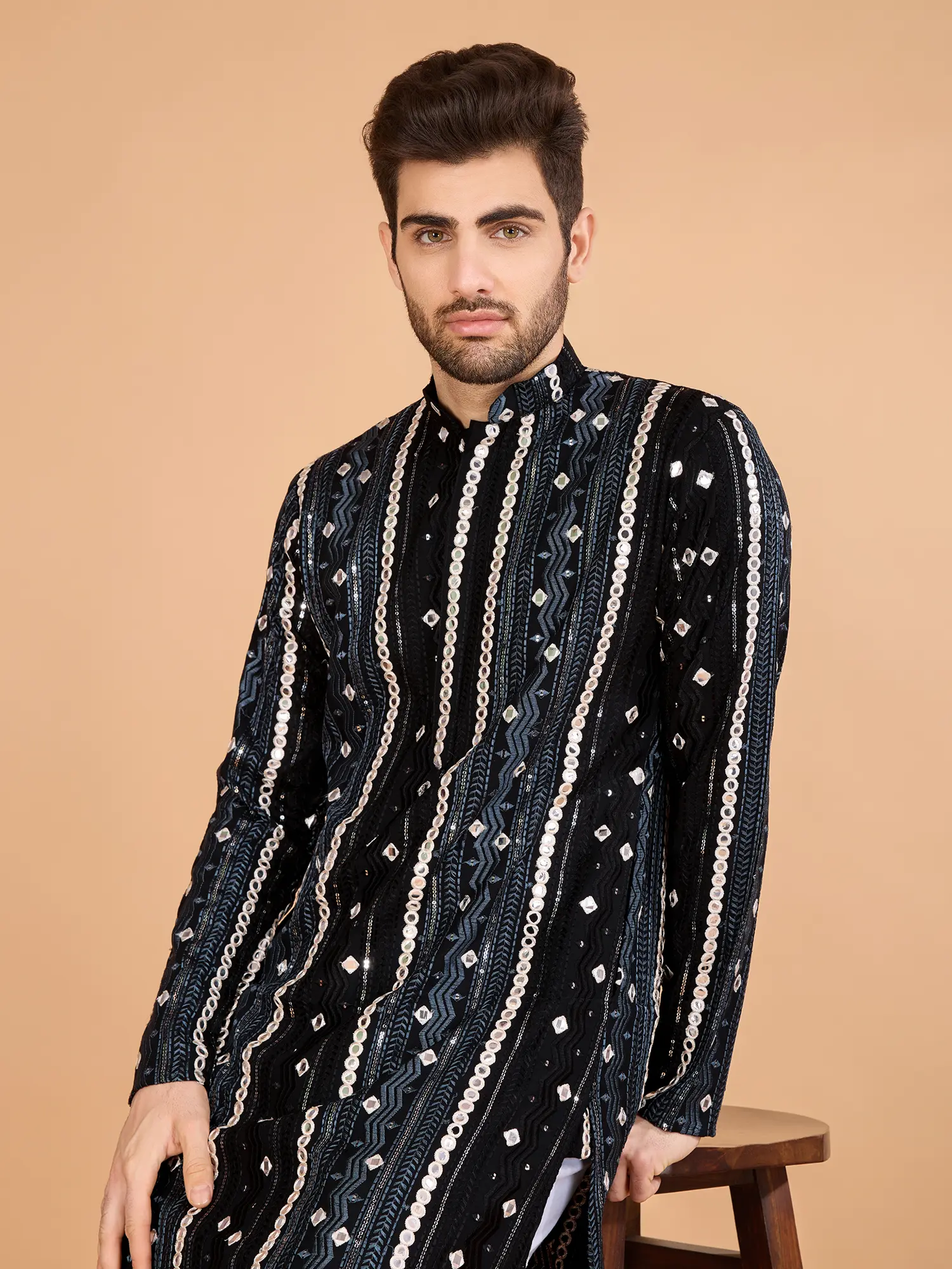 Men's Black Thread And Sequins Work Mandarin Collar Attractive Art Banarasi Silk Kurta Pajama Set