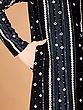 The true artistry of this kurta lies in its intricate embellishments. The meticulous thread work creates a rich texture, while shimmering sequins and foil mirror detailing catch the light, adding a subtle yet eye-catching sparkle. The placement of these embellishments has been carefully considered to create a harmonious and balanced design that elevates the overall aesthetic of the garment. The result is a unique piece that exudes elegance and sophistication, perfect for making a statement.