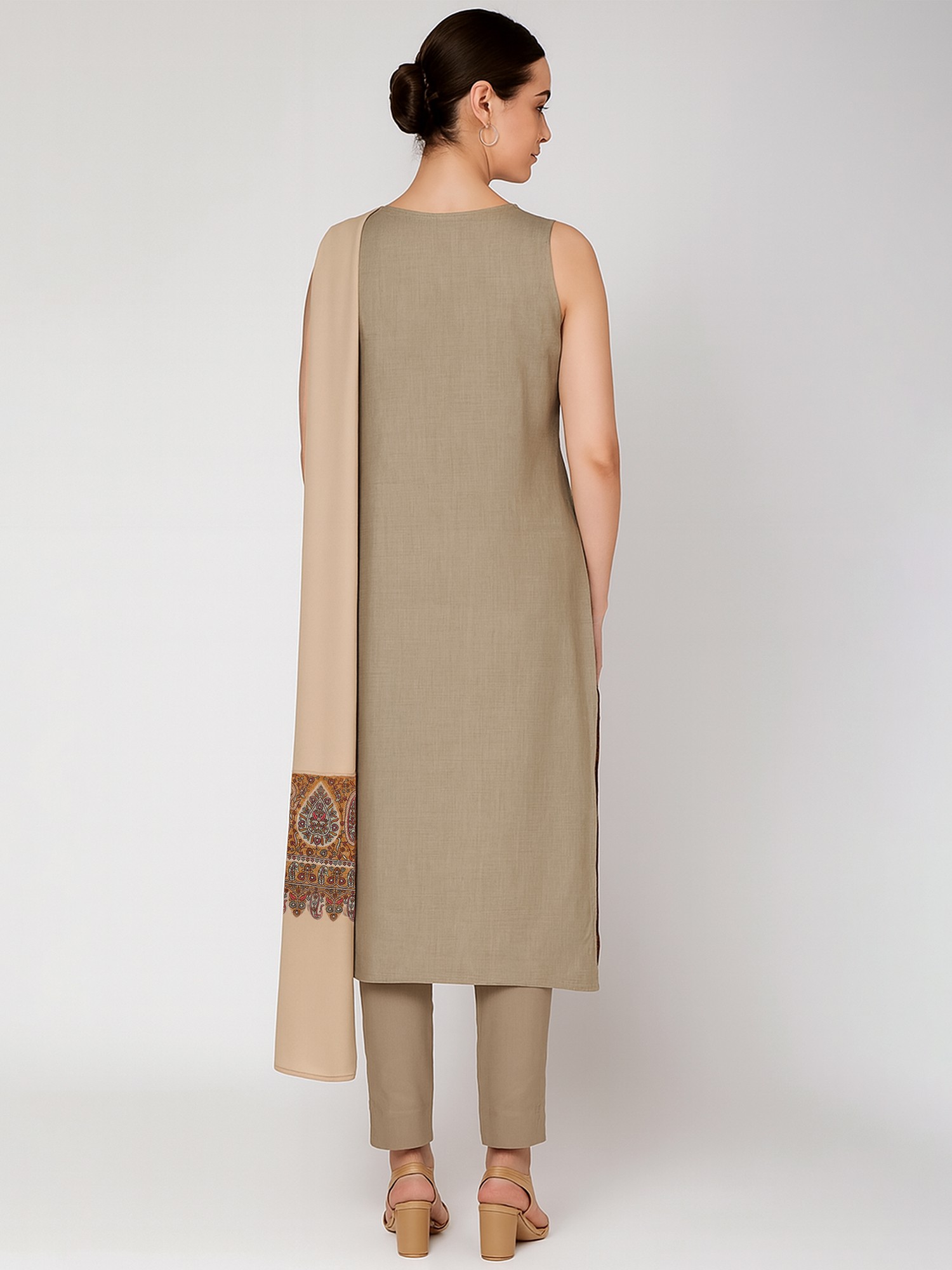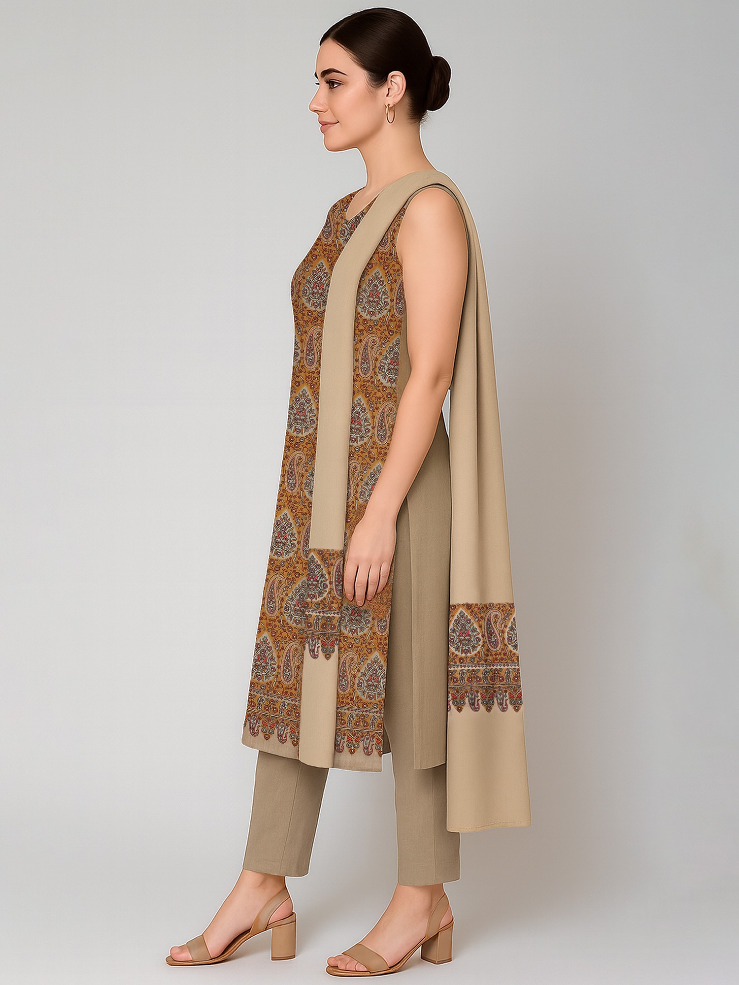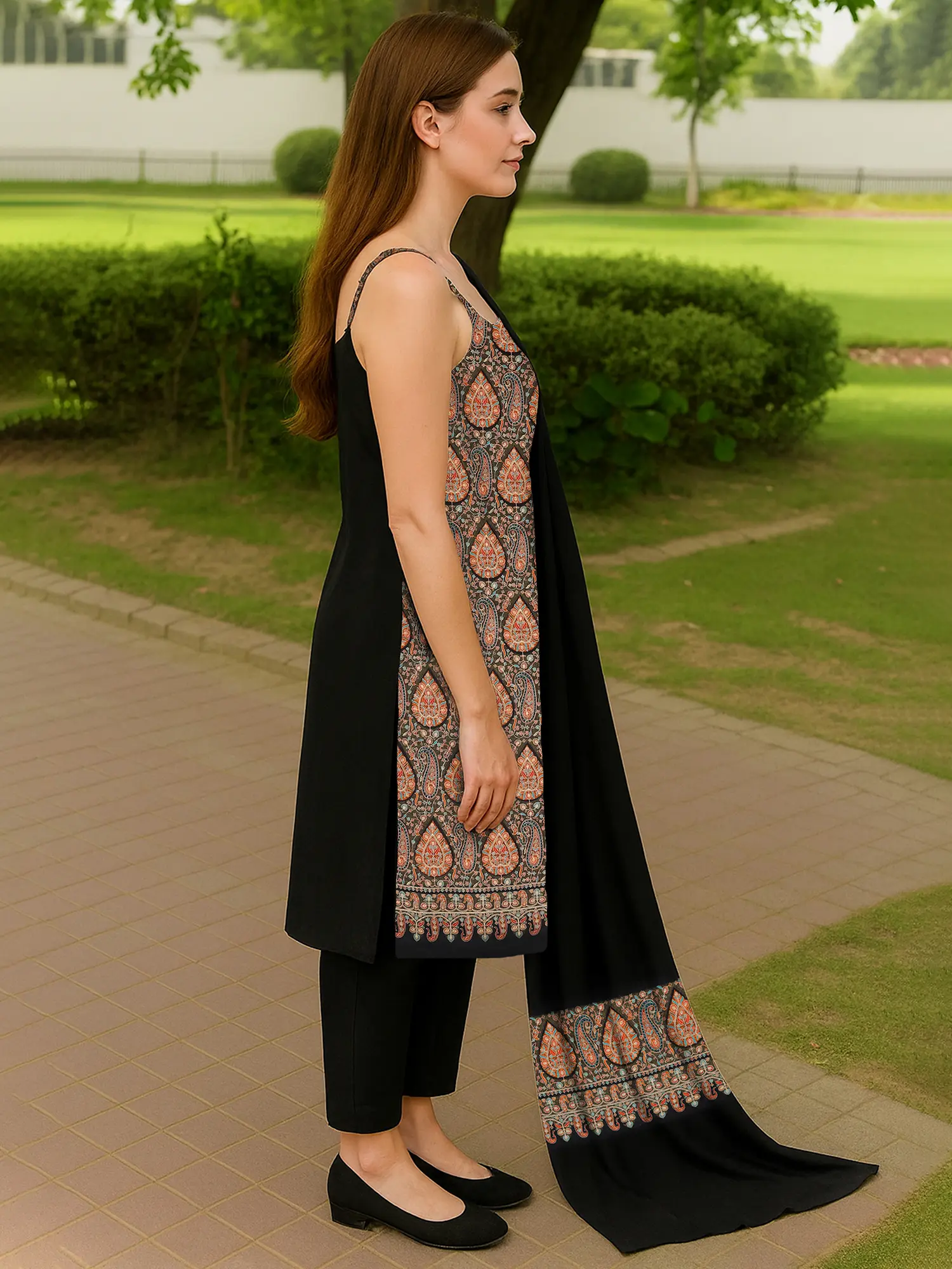 This ensemble is thoughtfully curated to offer a complete and harmonious look. The kameez, designed with a flattering silhouette, is paired with sleek, coordinating black trousers that provide a comfortable and chic foundation. The accompanying dupatta, in a classic black hue, mirrors the exquisite embroidery found on the kameez, featuring a detailed border that echoes the same beautiful floral and paisley patterns. This ensures a cohesive and polished aesthetic, allowing the intricate details to shine while maintaining a refined elegance. The poly wool fabric ensures a soft drape and comfortable wear, making this a versatile addition to your wardrobe.