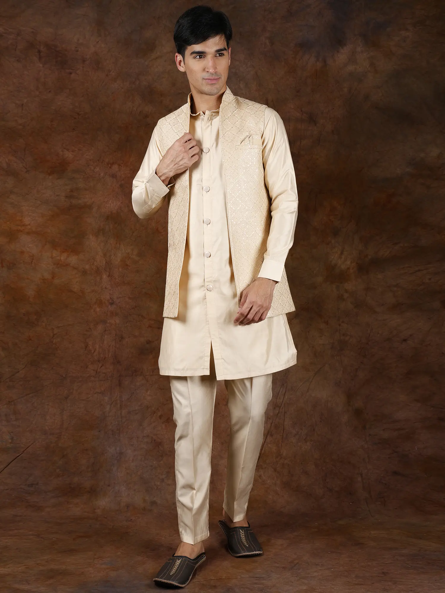 Three-Piece Golden-Beige Wedding Kurta Pajama Set with Brocaded Vest