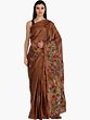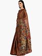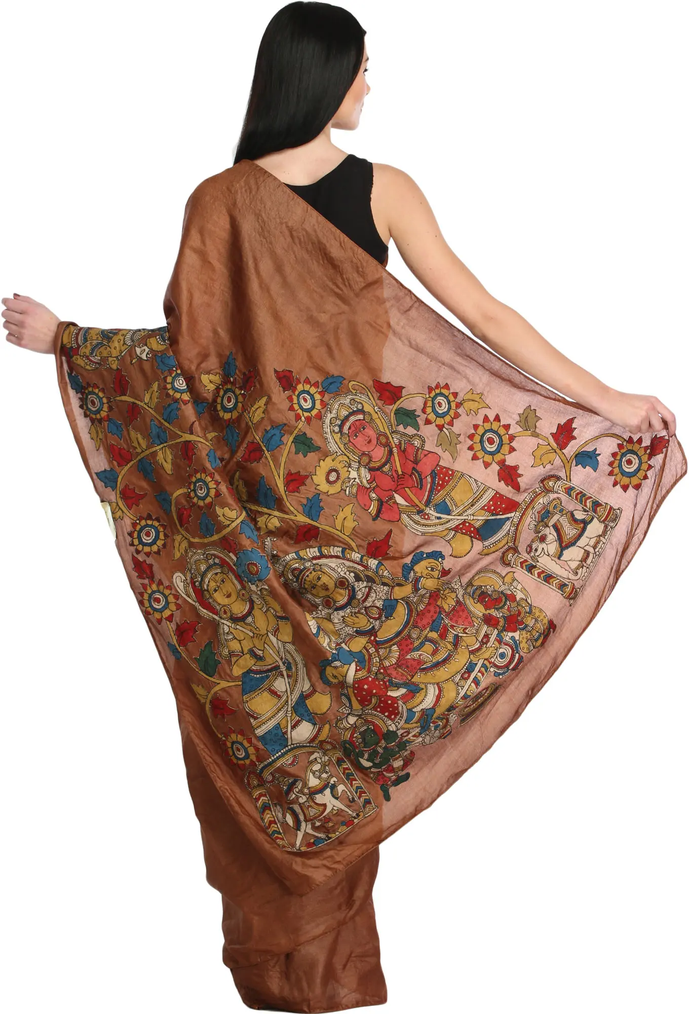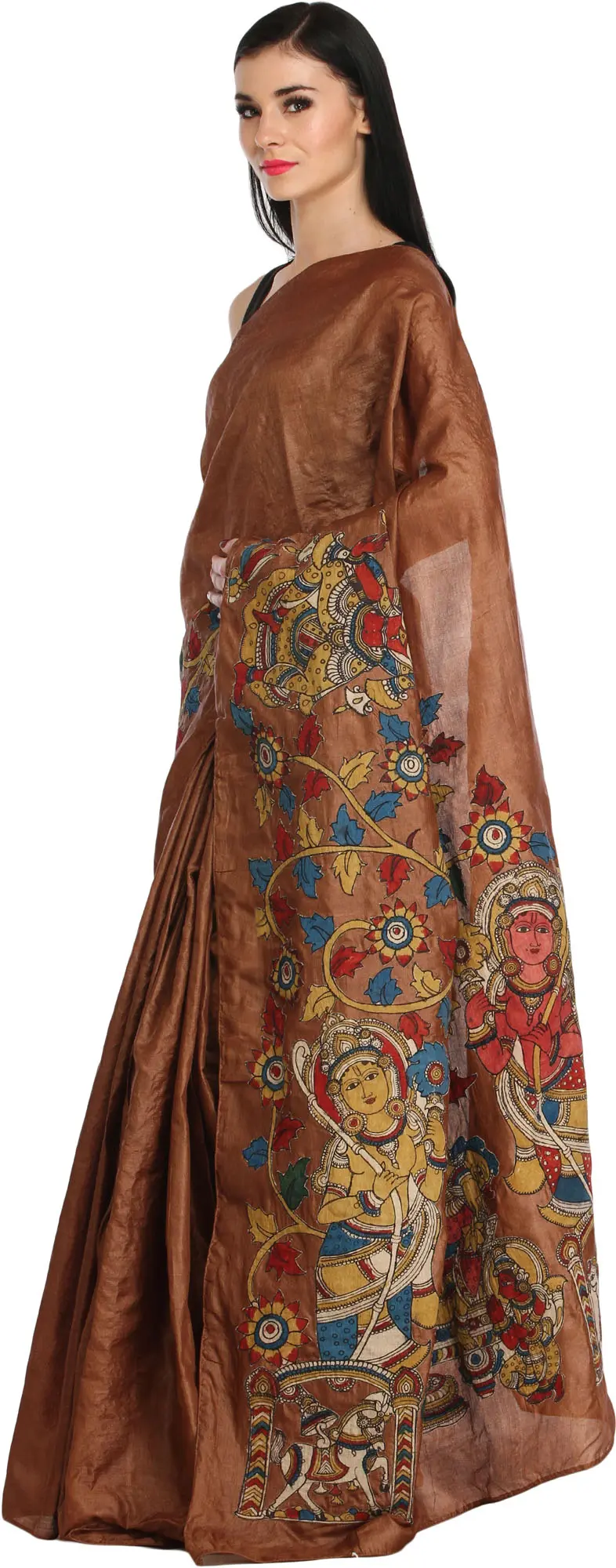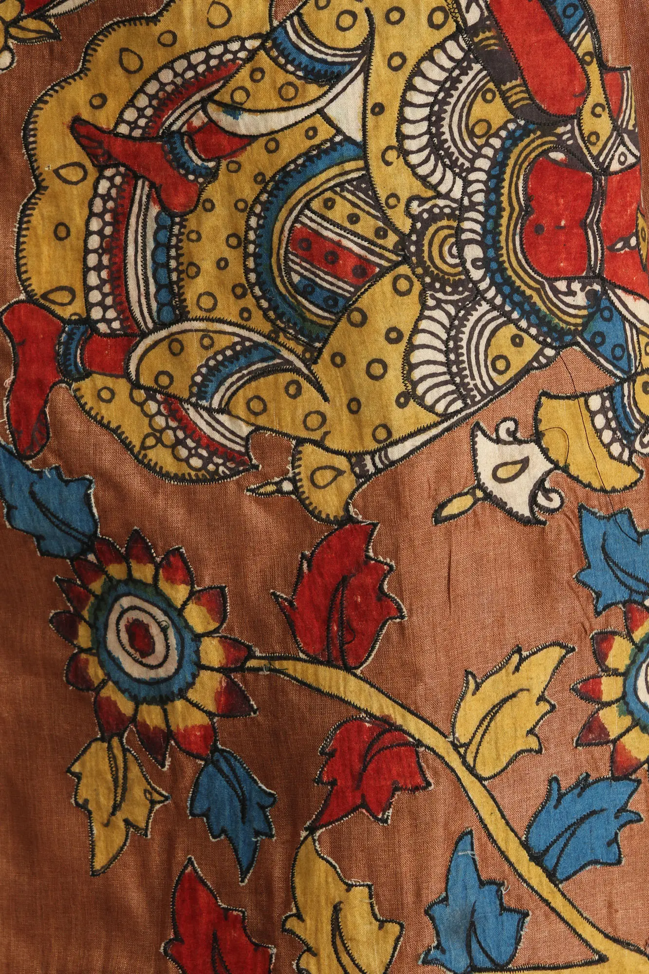 Thrush-Brown Plain Sari from Chennai with Kalamkari Floral Applique and Depicting Rama Durbar on Pallu